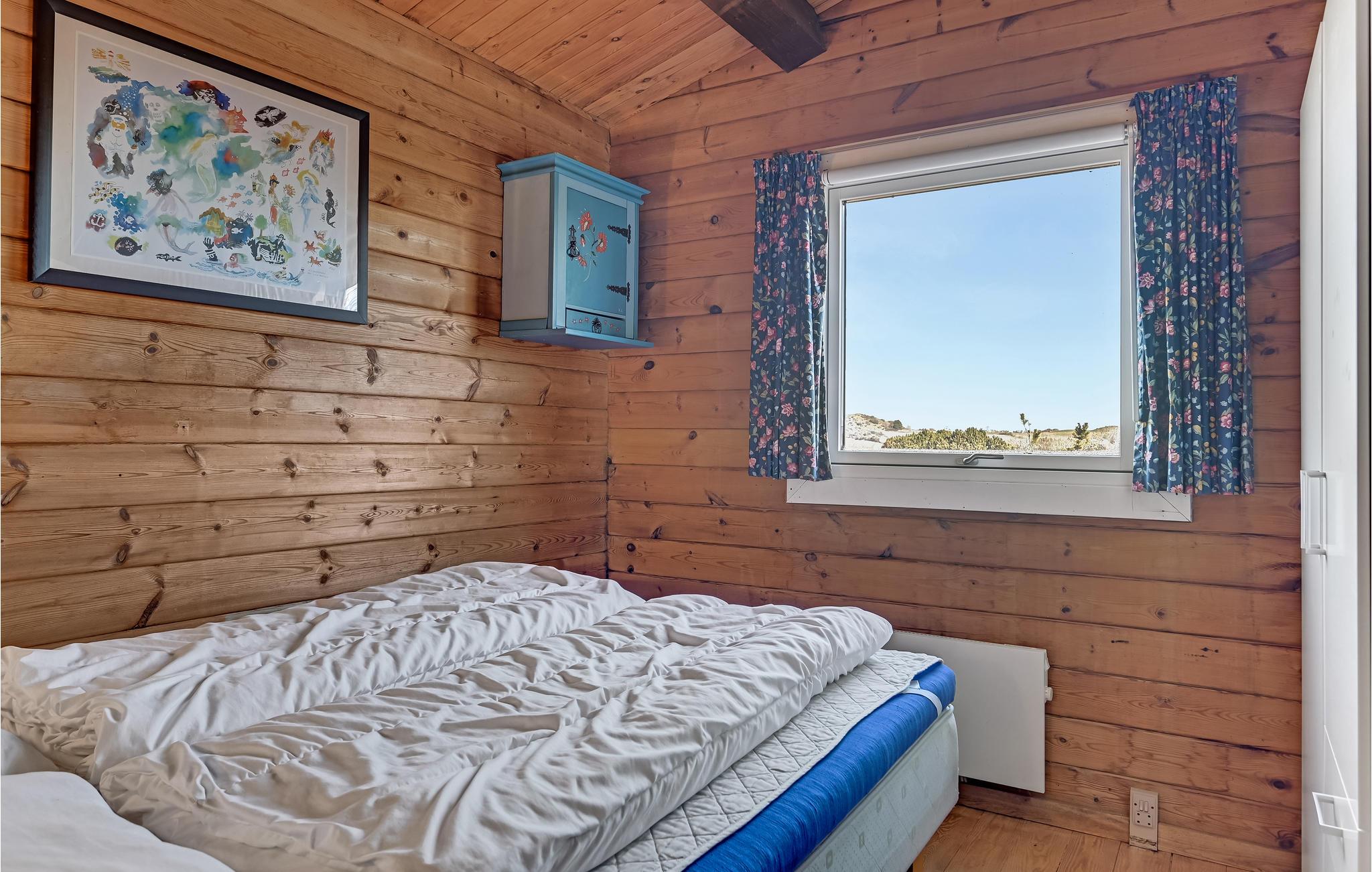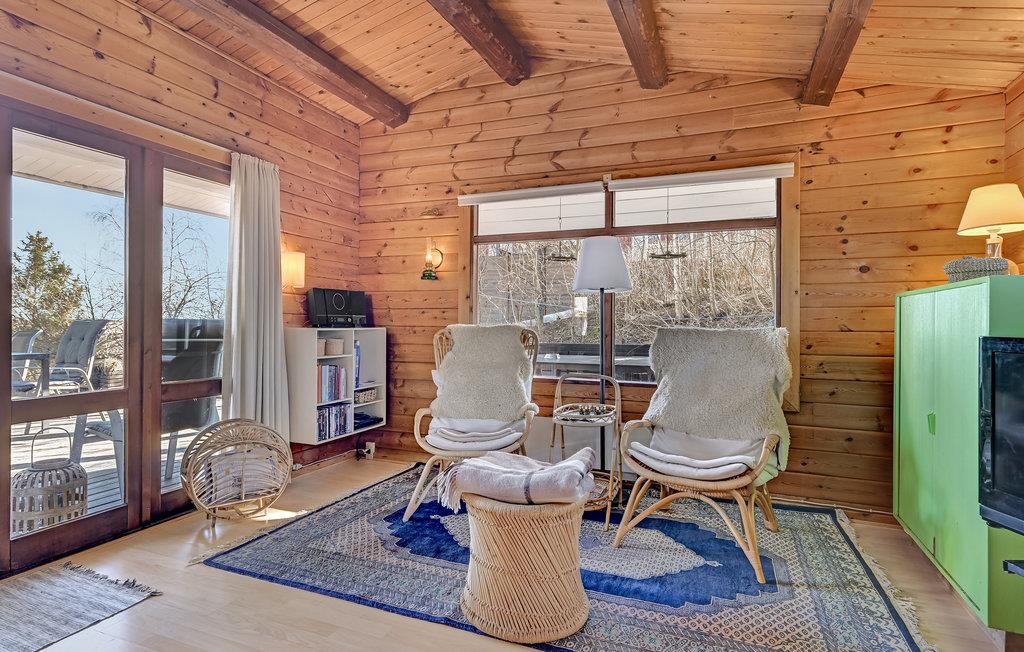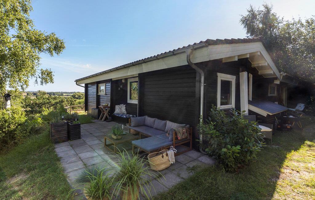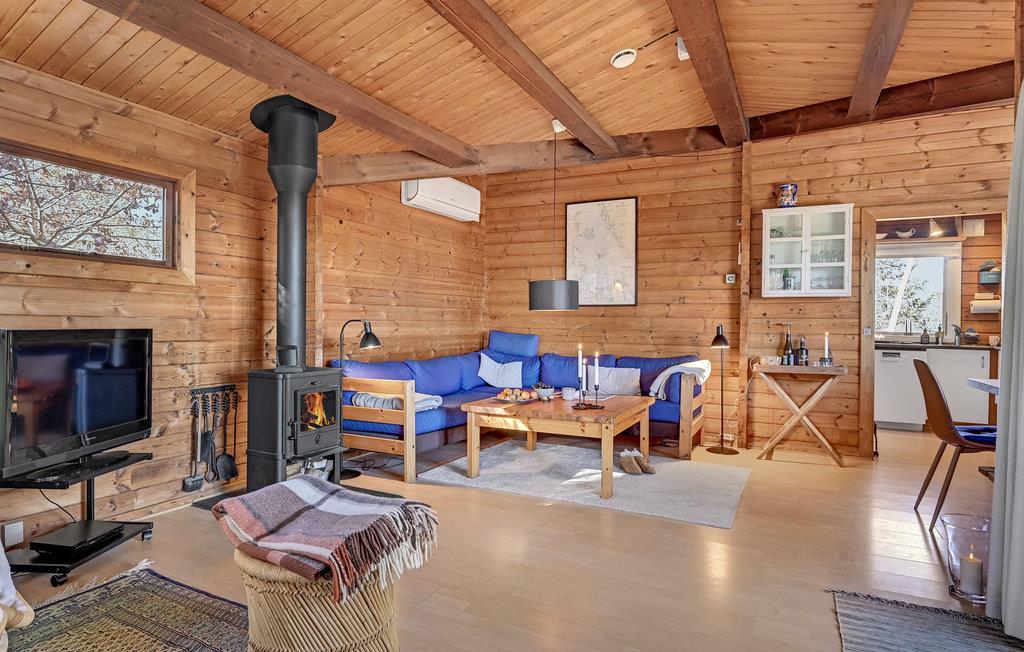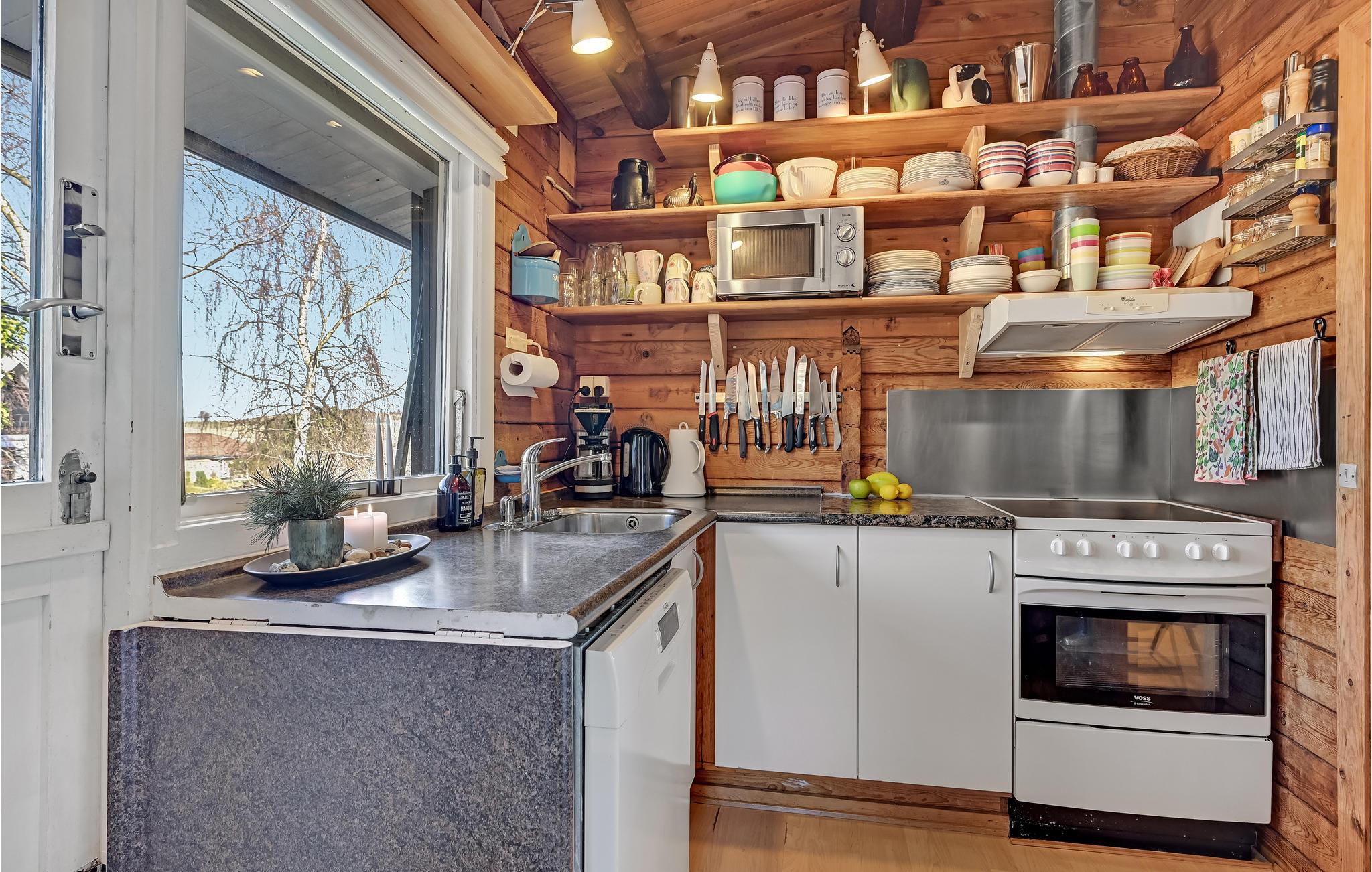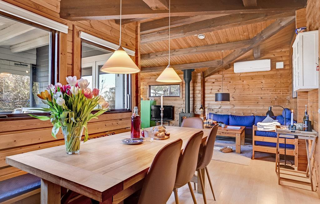 I dette dejlige træhus venter til en hjemling og varm indretning, hvor I kan se frem til en skøn ferie i rolige omgivelser. Køkkenet er veludstyret, og her kan I smide nogle lækre retter sammen, som I kan nyde i den rummelige stue eller i grønne omgivelser på terrassen. I stuen kan I slappe helt af efter en begivenhedsrig dag, mens ilden gnitrer i brændeovnen.