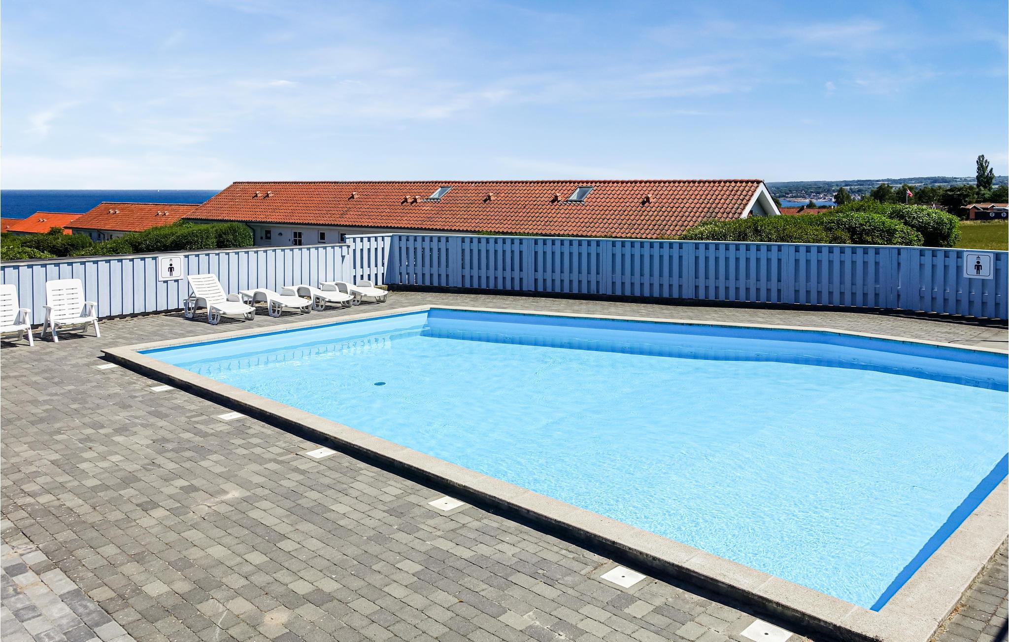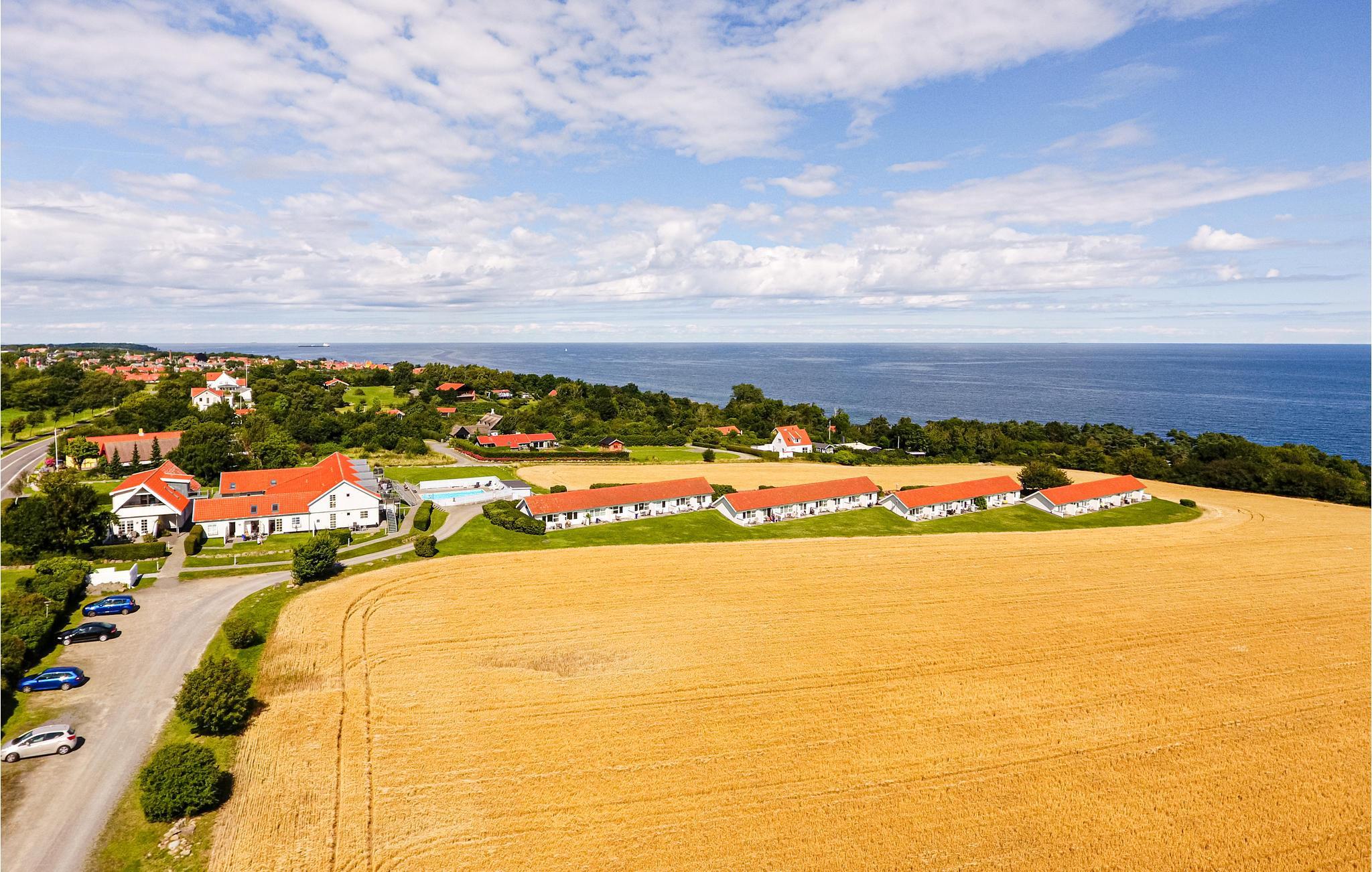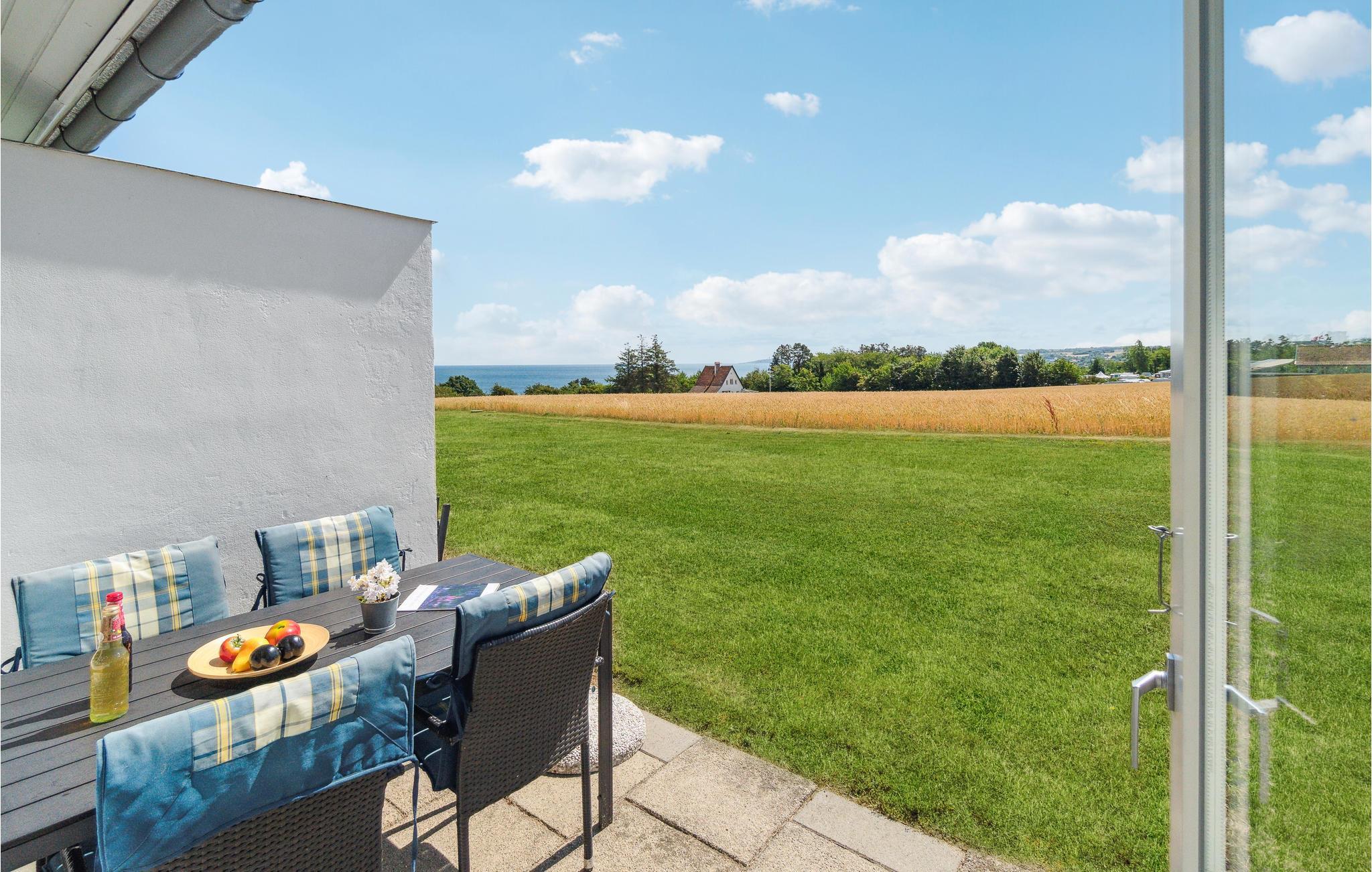 Lys ferielejlighed ved marker nær Allinge med privat terrasse, havudsigt og adgang til opvarmet pool.