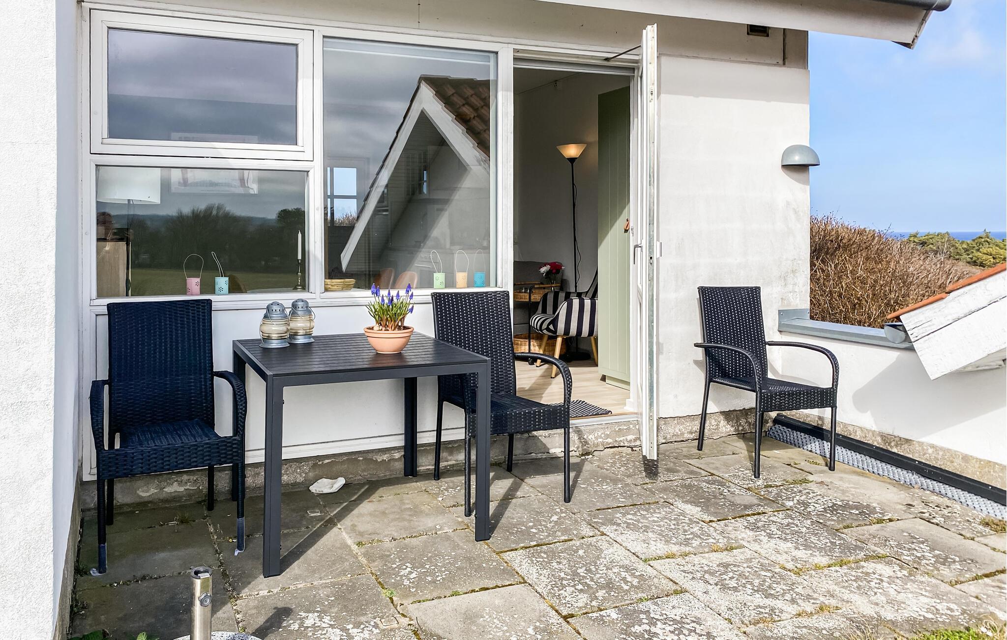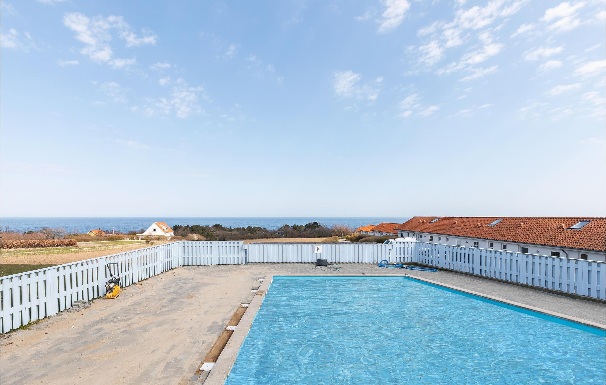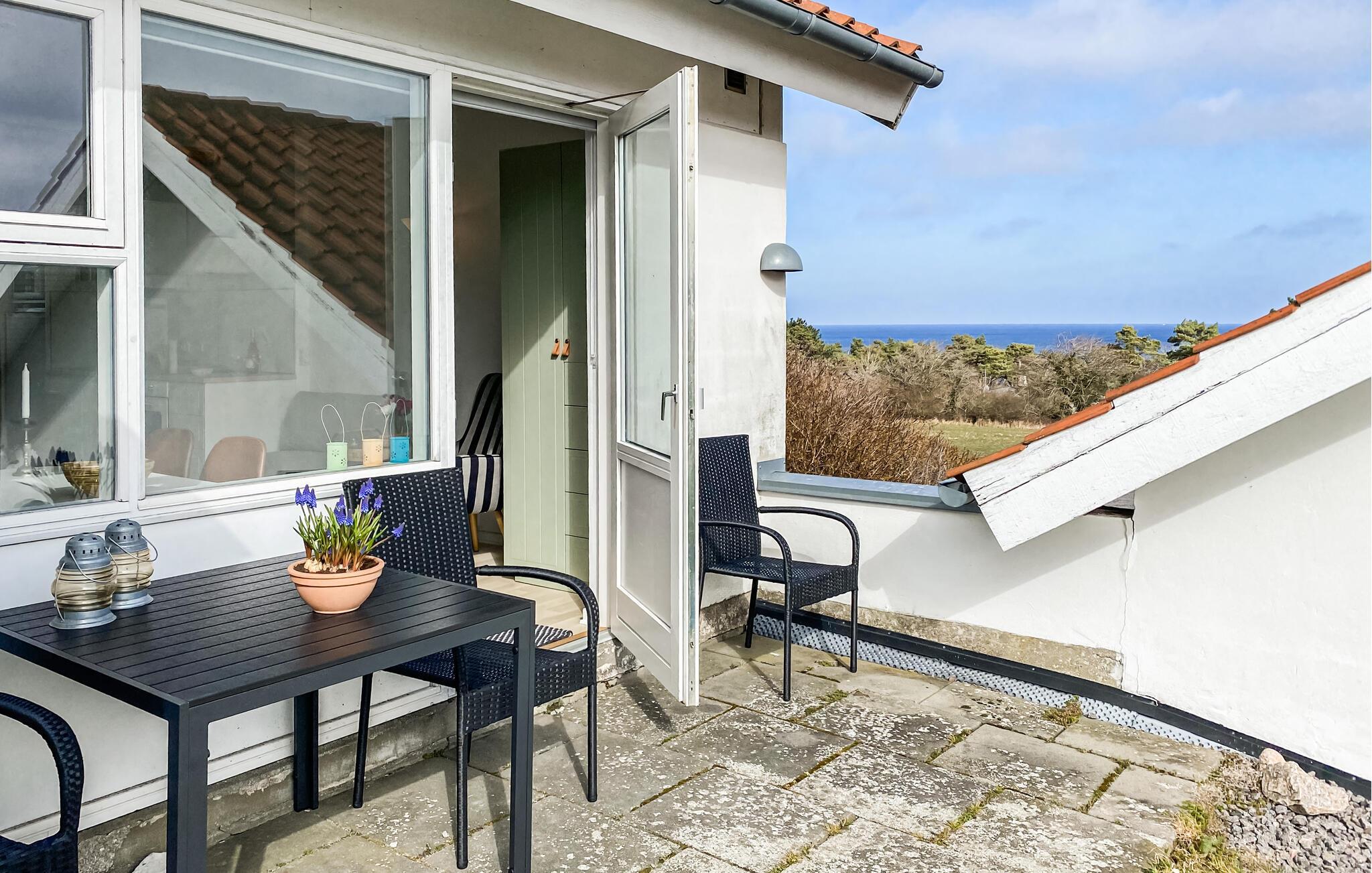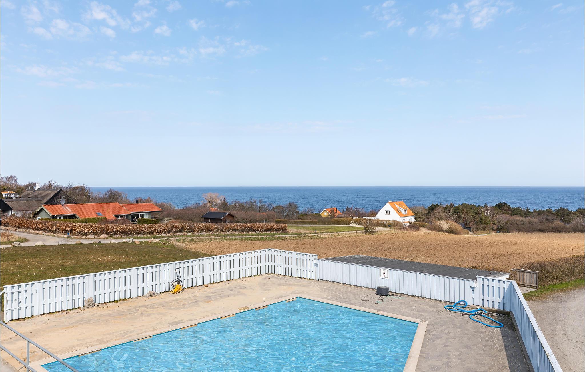 Godt beliggende ferielejlighed med udsigt til Østersøen og markerne omkring. Lejligheden er lyst indrettet. Udgang til lille fliseterrasse, hvor I kan sidde og nyde ferien. I tilknytning til ferieligheden er der adgang til en stor åben swimmingpool, der er opvarmet i perioden ca. 15. juni - ca. 15 september. Lejligheden indgår i et større ferielejlighedskompleks, og ligger i et attraktivt område nær den flotte klippekyst og Nordbornholms kuperede terræn. For 2 personer er denne ferielighed et godt udgangspunkt for et skøn ferie på Bornholm.