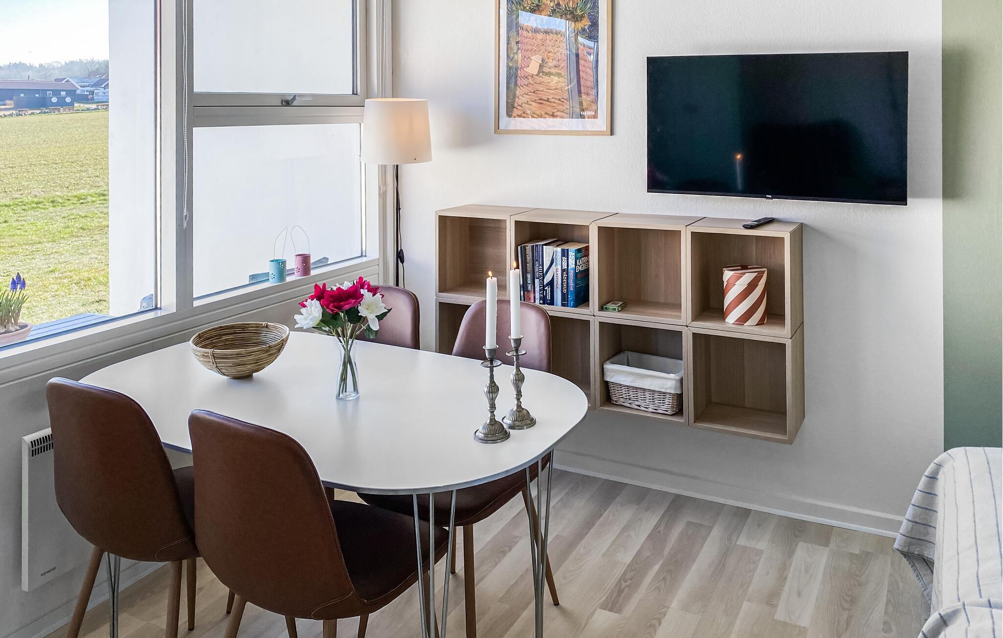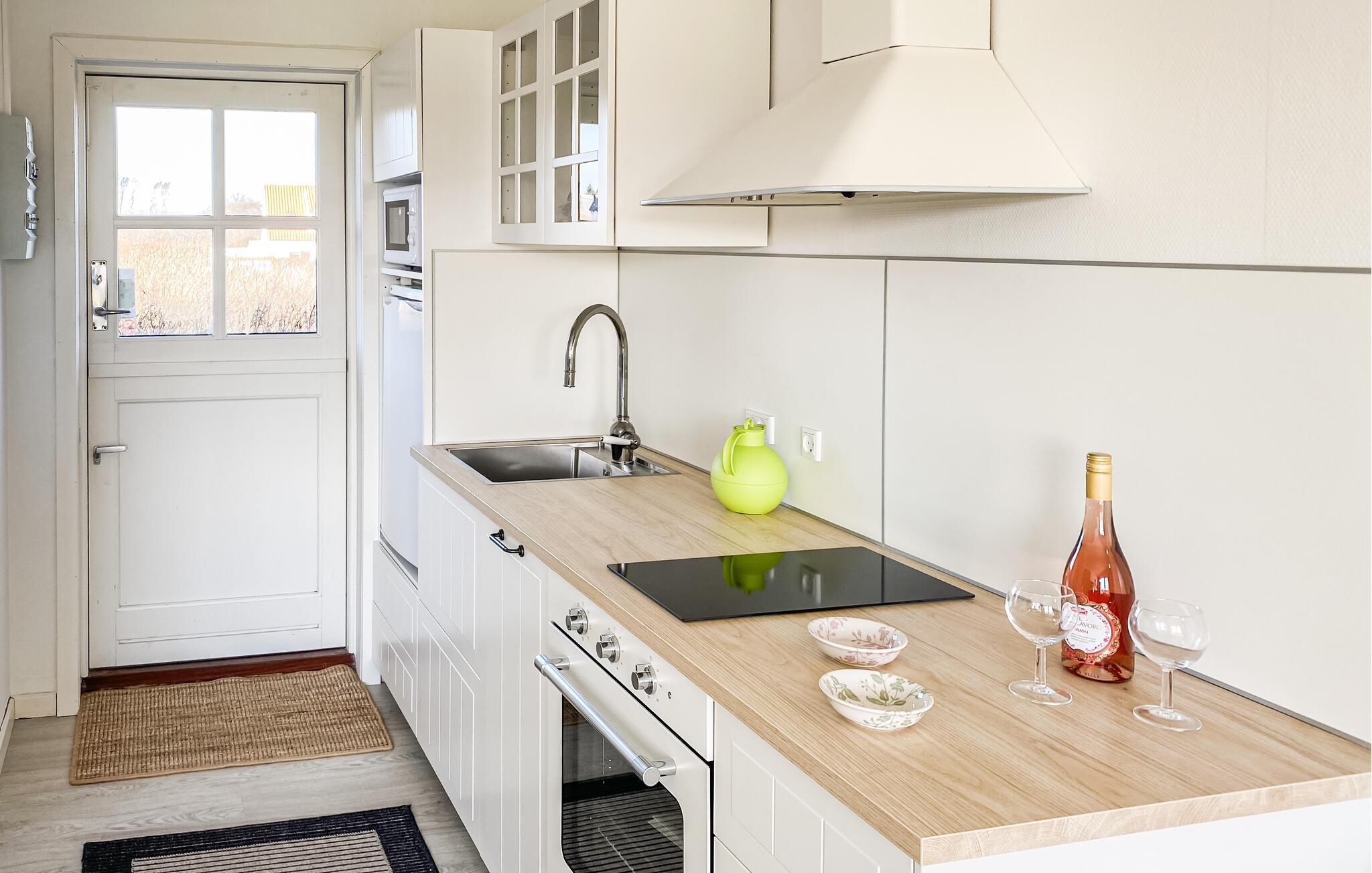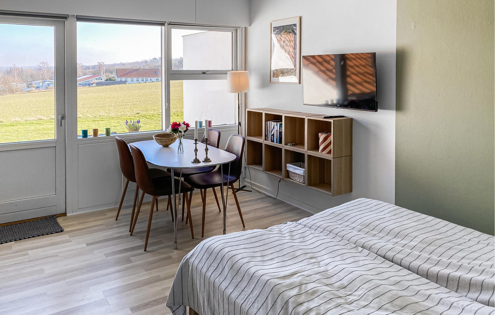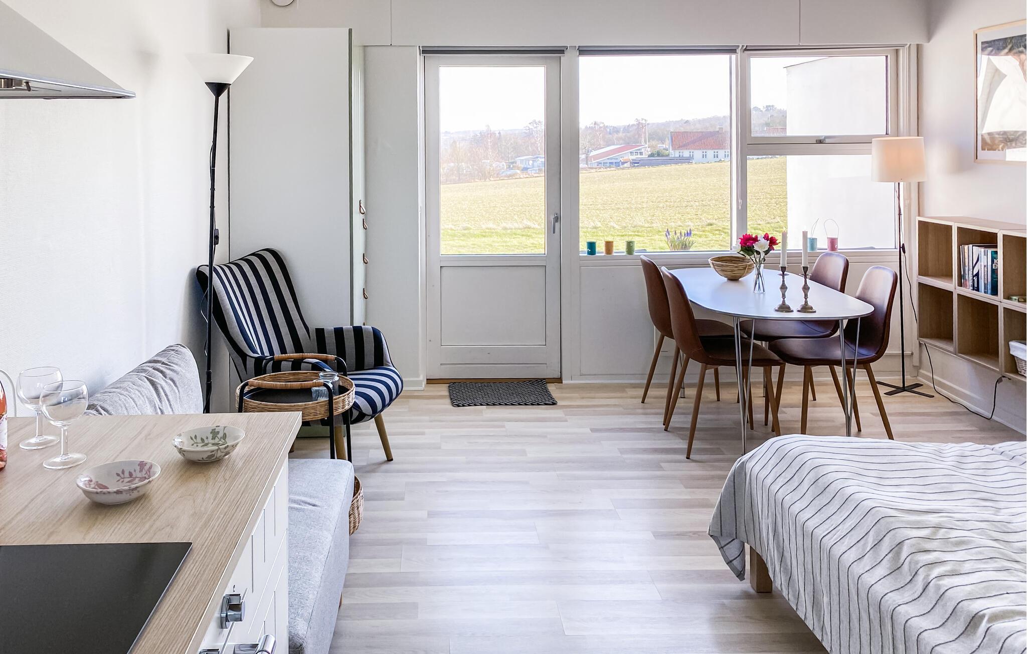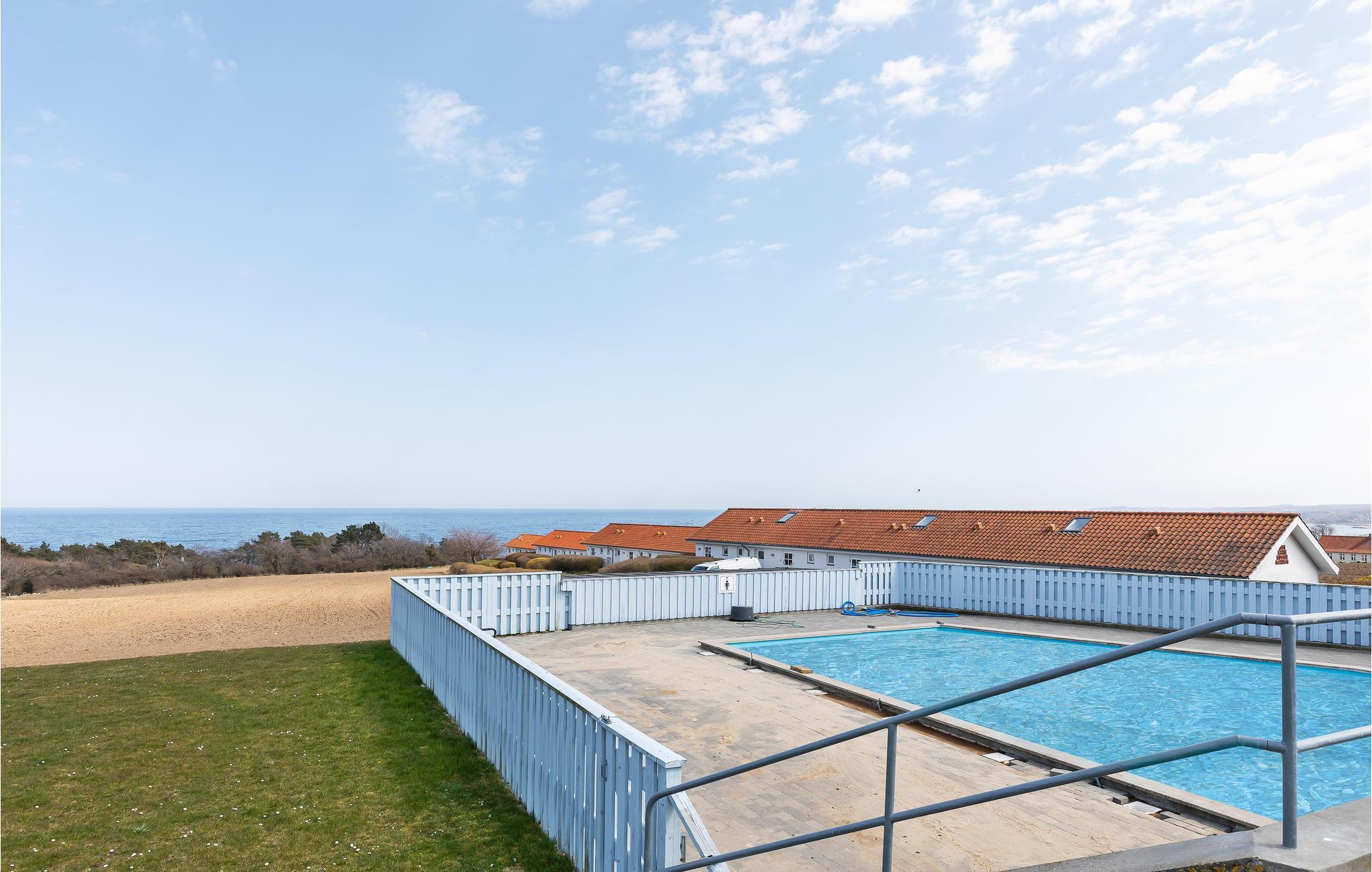 Godt beliggende ferielejlighed med udsigt til Østersøen og markerne omkring. Lejligheden er lyst indrettet. Udgang til lille fliseterrasse, hvor I kan sidde og nyde ferien. I tilknytning til ferieligheden er der adgang til en stor åben swimmingpool, der er opvarmet i perioden ca. 15. juni - ca. 15 september. Lejligheden indgår i et større ferielejlighedskompleks, og ligger i et attraktivt område nær den flotte klippekyst og Nordbornholms kuperede terræn. For 2 personer er denne ferielighed et godt udgangspunkt for et skøn ferie på Bornholm.