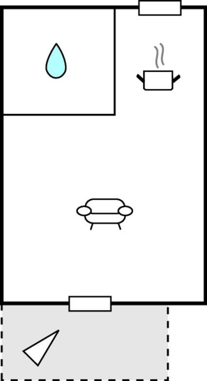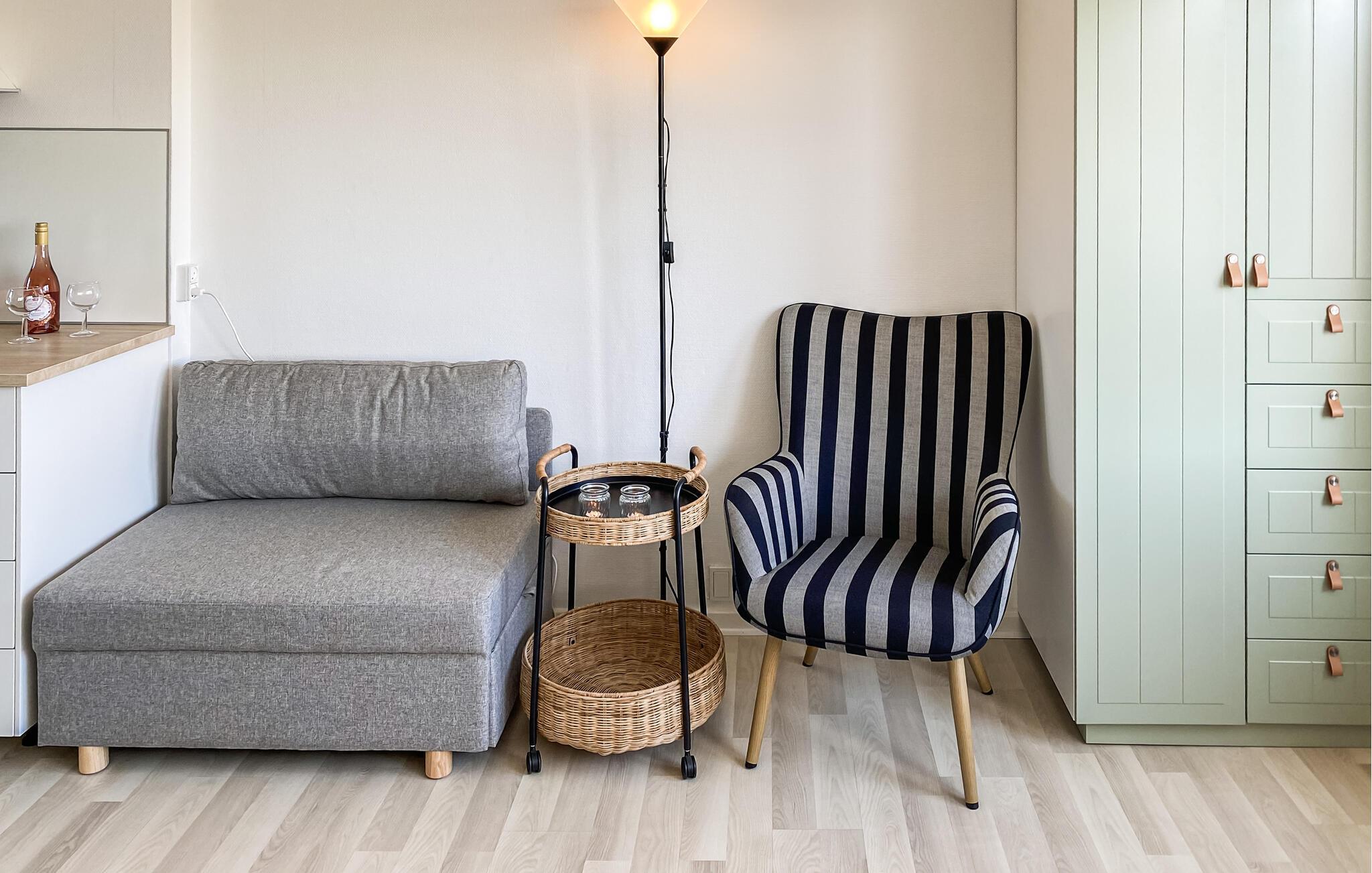 Opholdsstue/køkken 22m2 - 2 Sovepladser. (Enkeltseng(e)). 1 Soveplads. (Sofa, madras eller lignende).