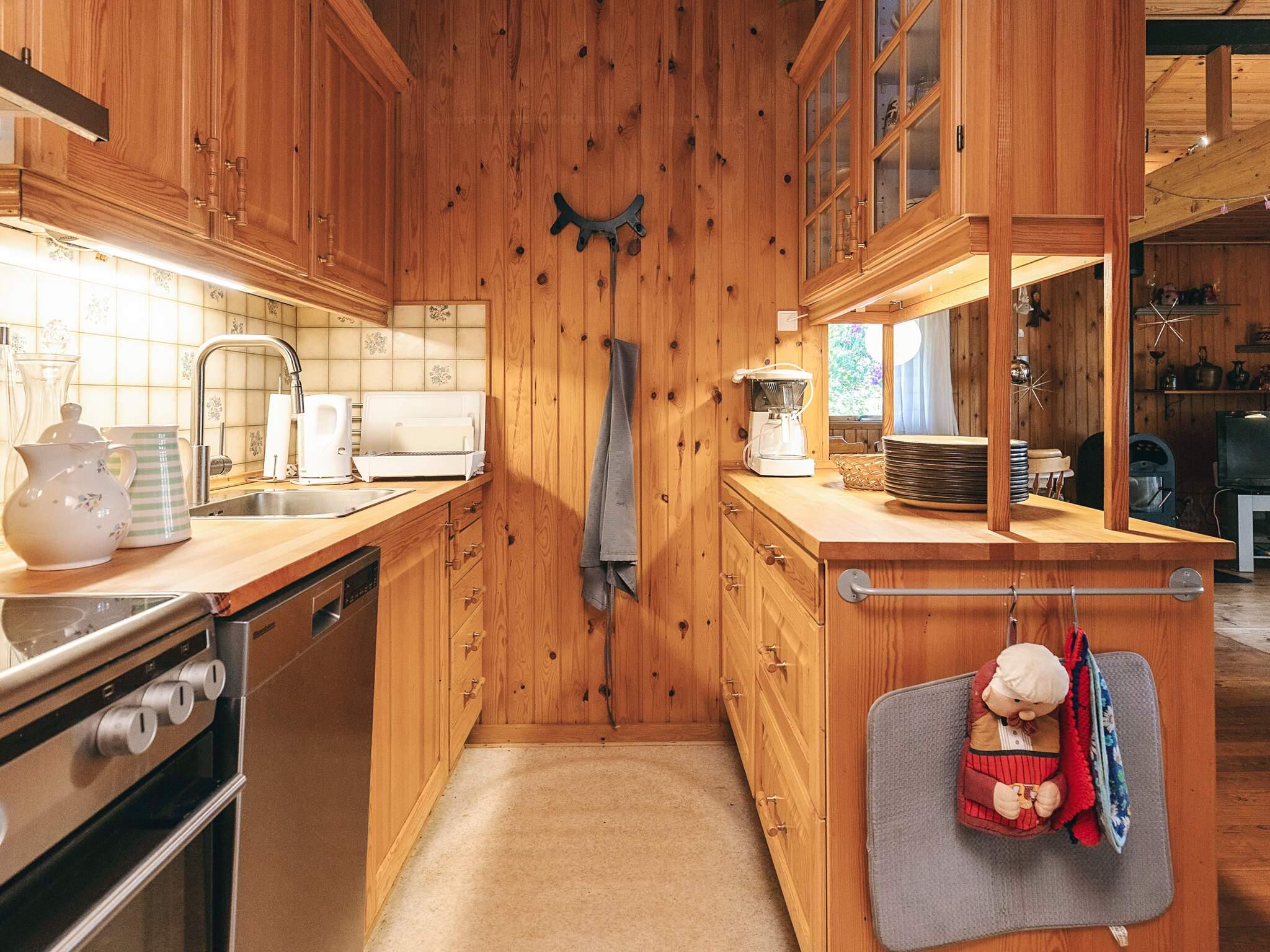 Fra entréen er der adgang til et hyggeligt soveværelse og et praktisk badeværelse, mens det åbne køkken og opholdsstue udgør boligens hjerte. Rummet omfatter et spise- og opholdsområde, der er ideelt til familiesammenkomster og fælles måltider. En brændeovn giver varme på køligere aftener og skaber en indbydende atmosfære. Store vinduer fylder rummet med naturligt lys og fører direkte til en glaseret veranda med udsigt til haven og et lyst, luftigt sted at slappe af.