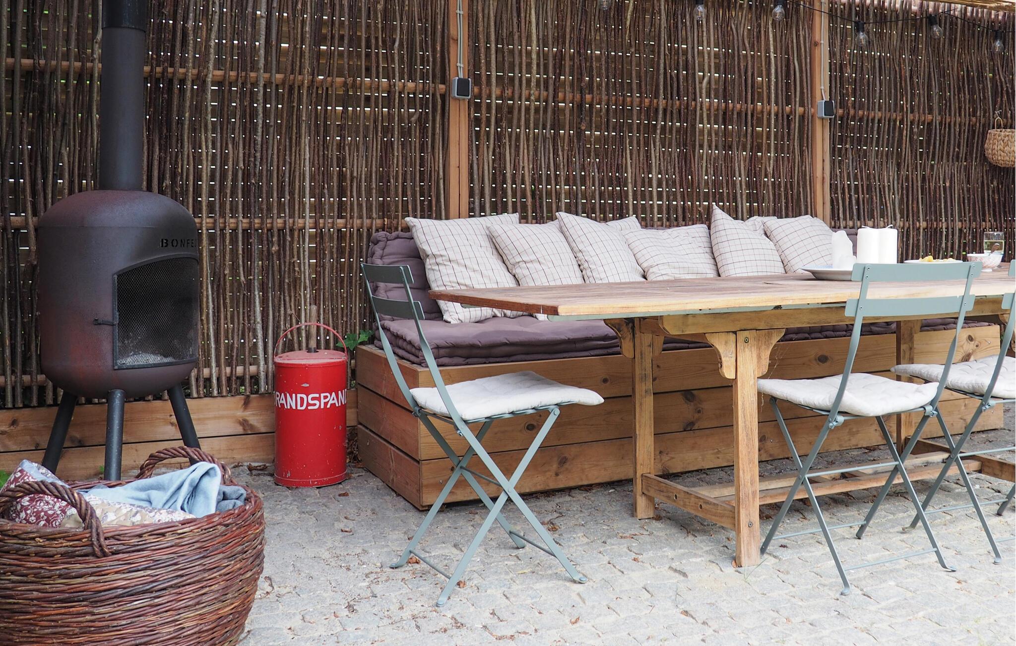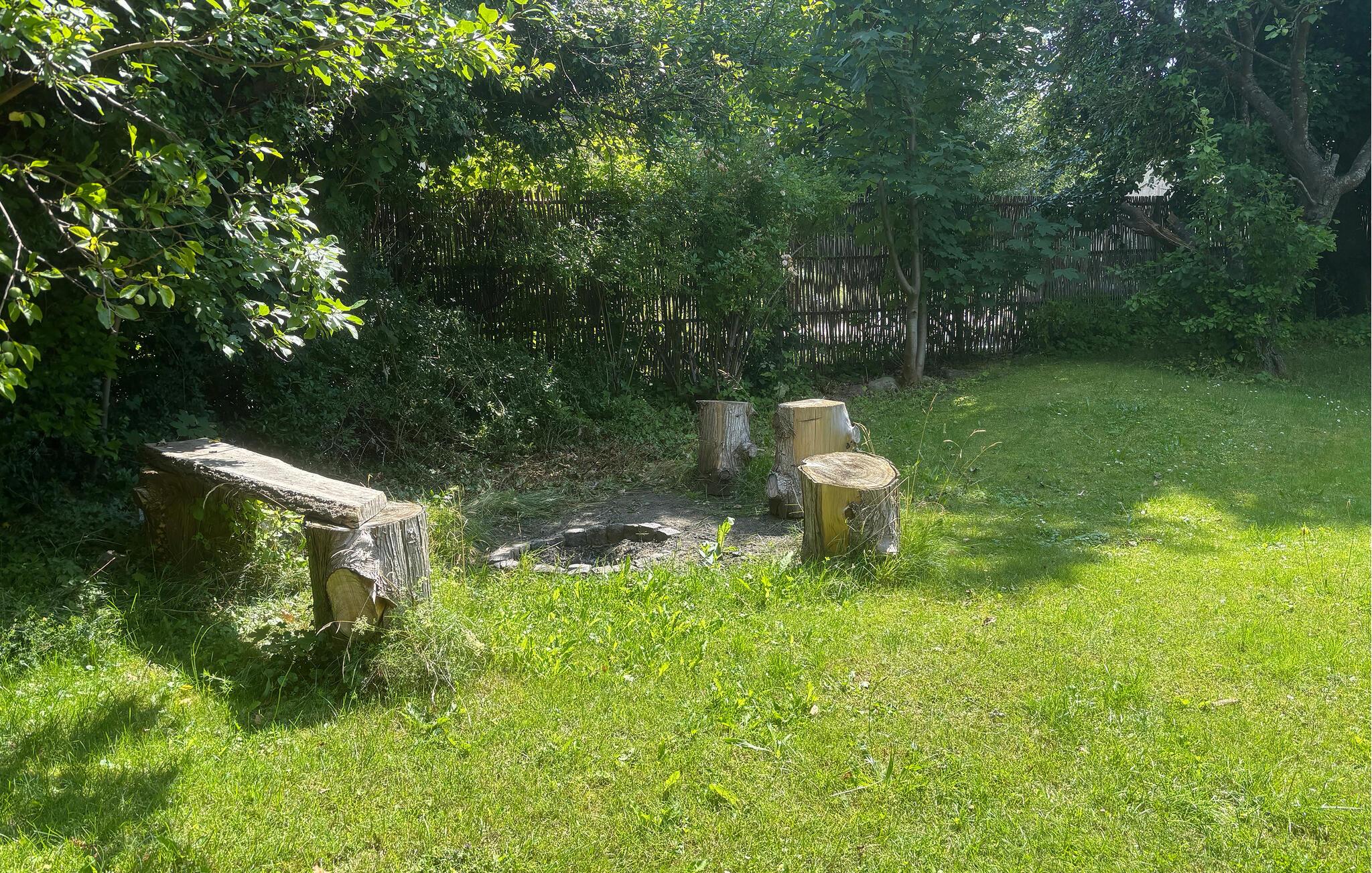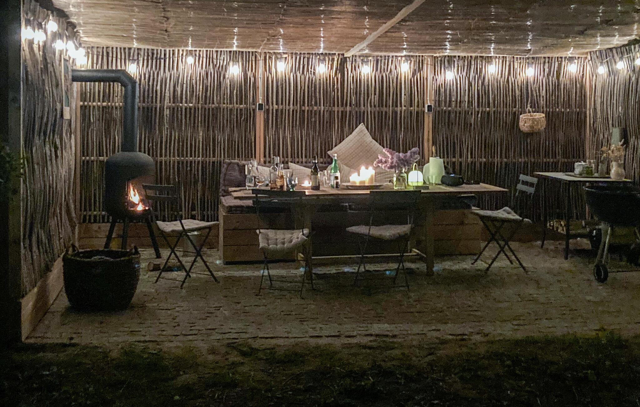 Tilbring mange timer i det overdækkede udendørsområde. Under den overdækkede terrasse med trætag og naturmateriale-skærm kan I sidde beskyttet mod vinden på den polstrede bænk. Tænd op i brændeovnen på kølige aftener. Den store have med græsplæne giver jer gode rammer til at lege eller slappe af. Brug bålstedet med de enkle træsæder til en fredelig afslutning på dagen.