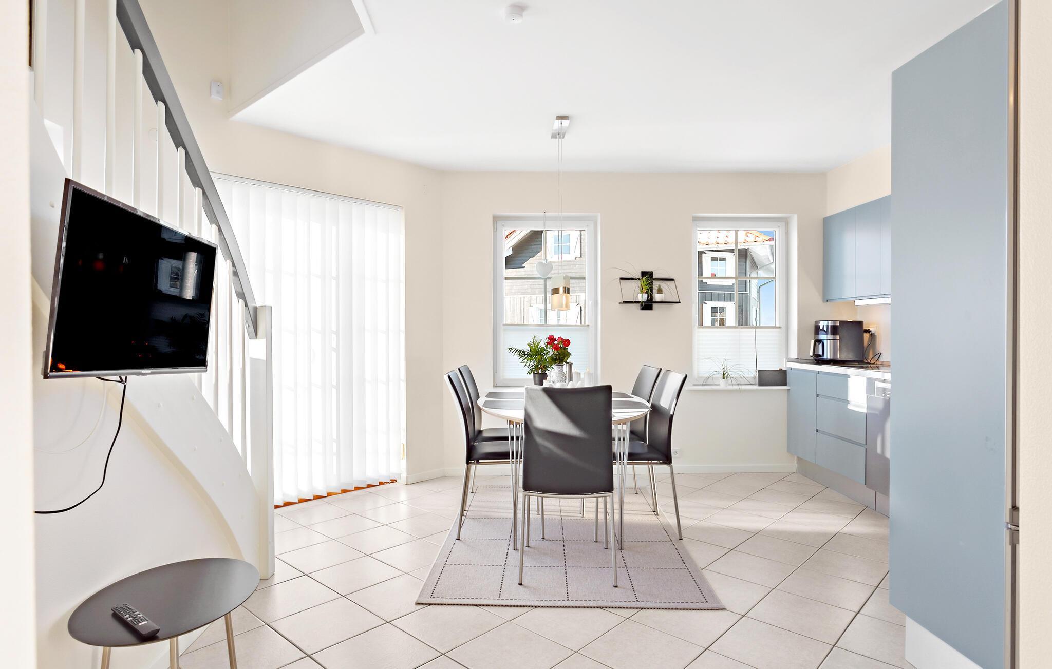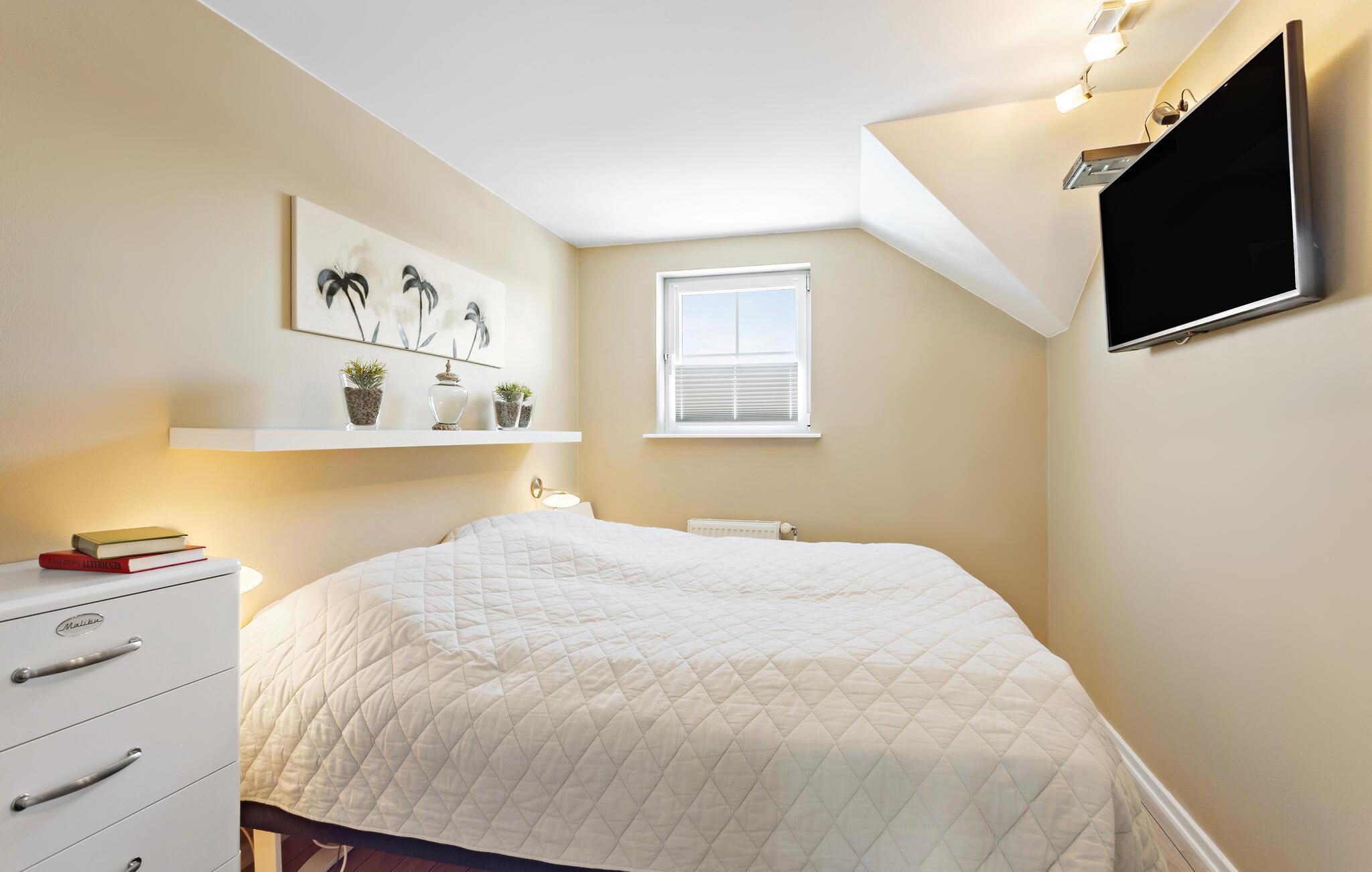 Lad turen gå til Bogense, hvor I få skridt fra vandet finder denne skønne lejlighed, der er indrettet over flere etager, og som har udsigt til havet. Interiøret er lyst med et moderne udtryk, og i stuen er der loft-til-kip, hvilket får boligen til at fremstå yderst luftig og rummelig. Lejligheden er veludstyret med alle nødvendige faciliteter, så I kan slappe af uden at skulle bekymre jer.