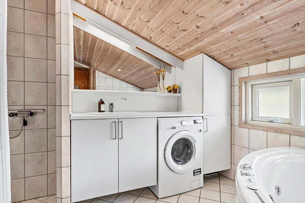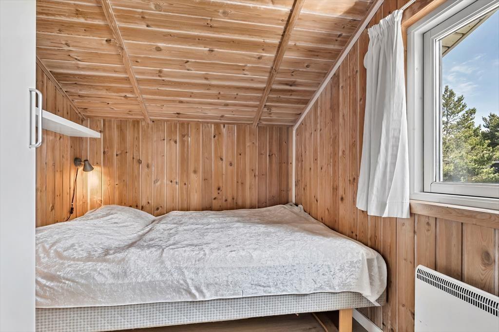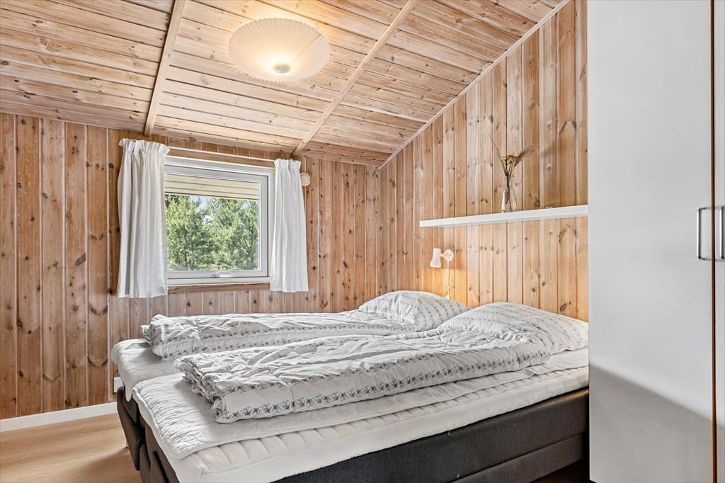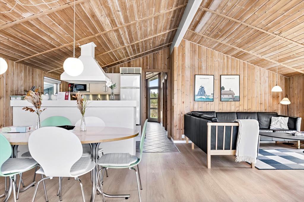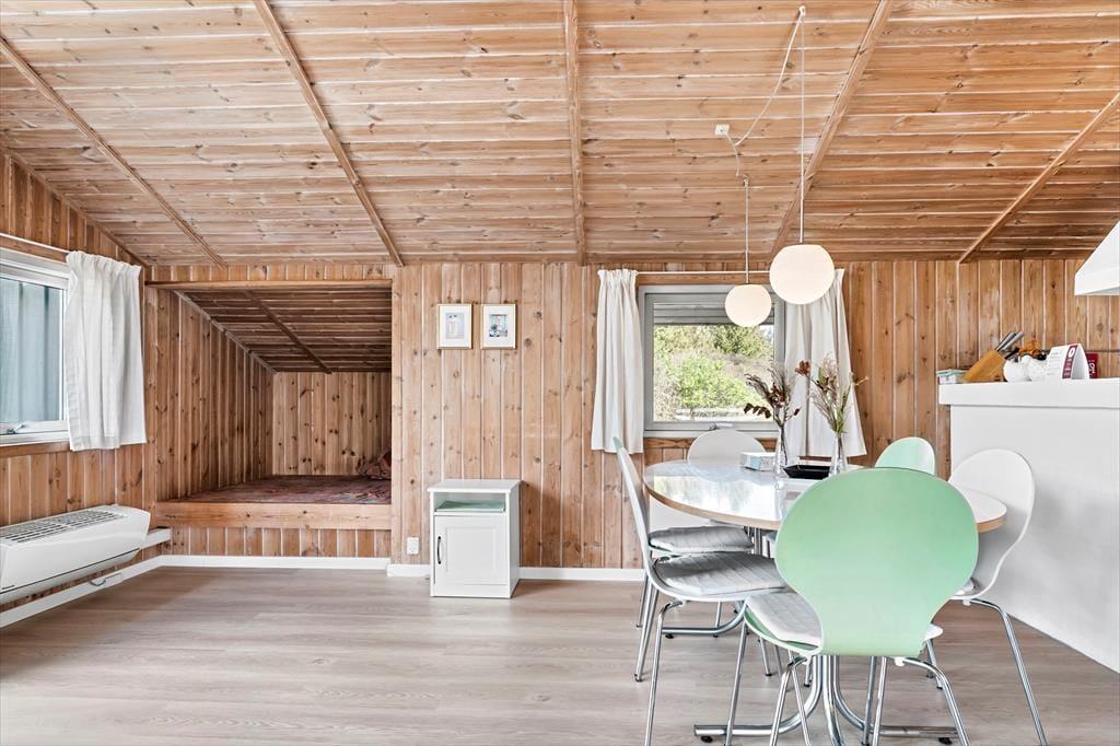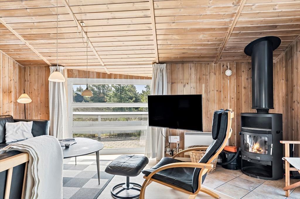 Sommerhuset kan bedst beskrives som en både funktionel og hyggelig feriebolig på 90 m2, der har en glimrende planløsning til seks overnattende gæster. Soveværelser er der tre af, hvoraf to er indrettet med dobbeltseng hvor det ene sæt er med elevationsseng og et med to enkeltsenge. På husets badeværelse er der ikke bare bruser, gulvvarme og vaskemaskine, men også spabad og sauna, så I kan se frem til wellnessaftner og total afslapning. Når I skal samles inden døre, kommer det formentlig til at foregå i sommerhusets stue, som ligger i åben forbindelse med et veludstyret køkken. Ligesom i resten af huset er atmosfæren lys og indbydende i opholdsrummet, og på charmerende vis er der loft til kip, brændeovn og store vinduespartier, der inviterer sollyset og de naturskønne omgivelser indenfor.