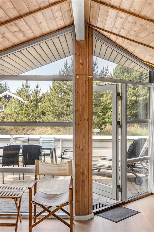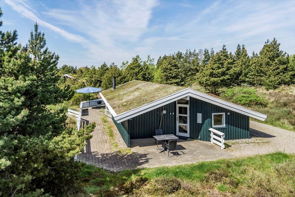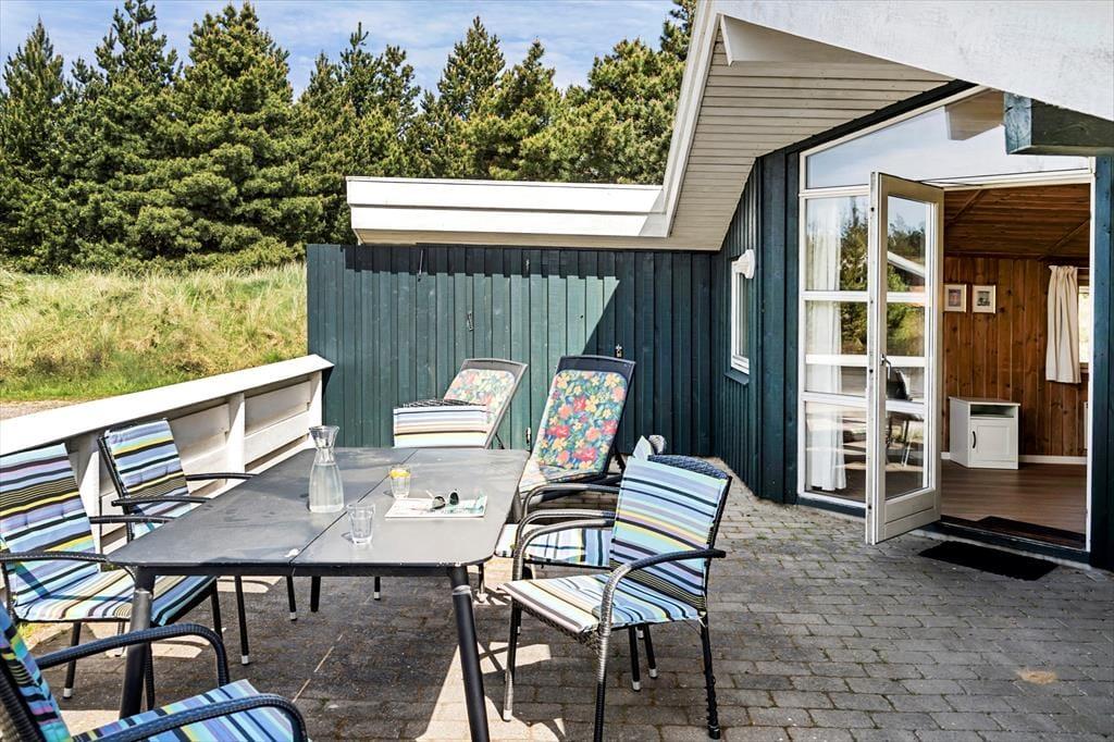 Fra stuen har I direkte adgang til en stor, delvist overdækket terrasse, der breder sig om tre sider af sommerhuset. Her kan I stornyde områdets ro og den smukke udsigt, når I slapper af i havemøblerne og forbereder aftensmaden på grillen. Har I små børn med på ferie, er det rart, at der er både sandkasse og gynger på grunden, så de kan lege, mens de voksne får gang i grillkullene og skænker sig en kølig drink i glassene.
