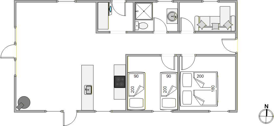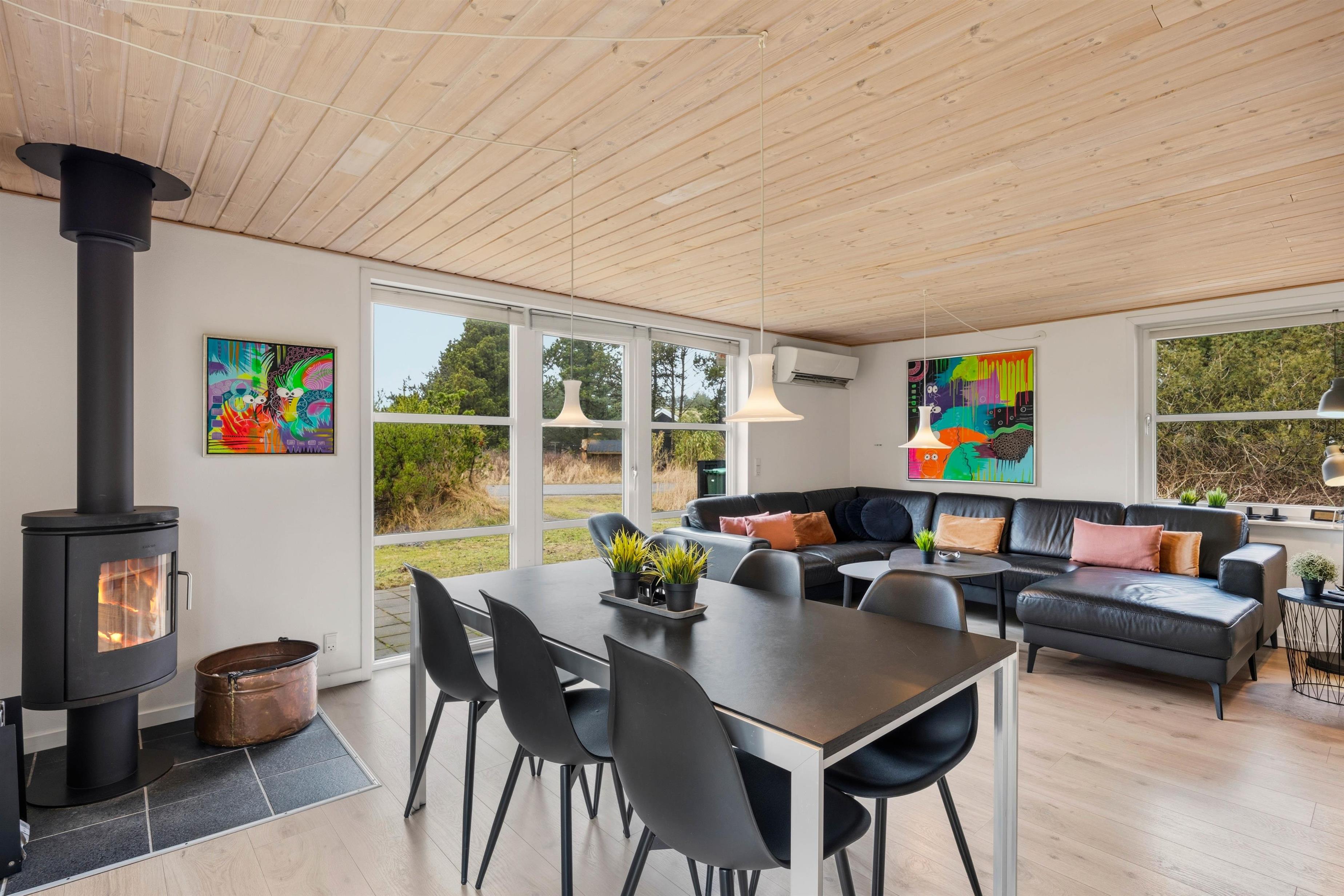 Sommerhuset har plads til op til 6 personer og byder på 72 m² velindrettet boligareal. Her kan I nyde hyggelige aftener foran brændeovnen i den rummelige opholdsstue. Huset rummer 3 soveværelser: 1 med dobbeltseng og 2 med enkeltsenge. Det åbne opholdsrum er udstyret med varmepumpe, og badeværelset har gulvvarme, som skaber en behagelig atmosfære året rundt. Som ekstra forkælelse er der også spabad.