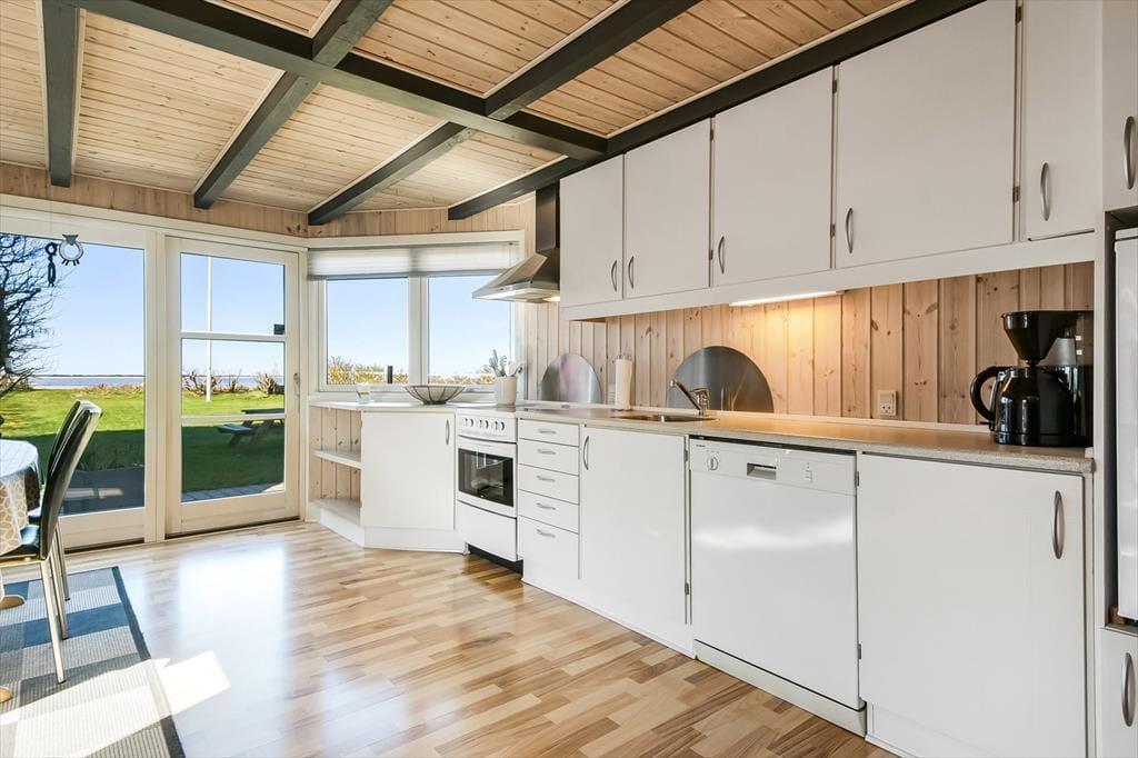 Sommerhuset, som er opført i 1977 og senere moderniseret i 2006, giver jer 80 m2 til rådighed fordelt på to etager. I stueplan kan I samles nær brændeovnen i det rummelige spisekøkken, når aftensmaden først skal tilberedes og siden fortæres, og bagefter kan I rykke det gode selskab op i førstesalens stue, som er indrettet med komfortable sofaer og en hyggelig alkove. Et TV er her også– men det kræver dog, at I kan løsrive blikket fra den flotte fjordudsigt, som især imponerer her fra etagen. Soveværelser er der to af i sommerhuset, og de er begge placeret i stueplan og er udstyret med hver sin dobbeltseng. Med til planløsningen hører også et badeværelse, der fremstår lige så pænt og velholdt som husets øvrige rum.