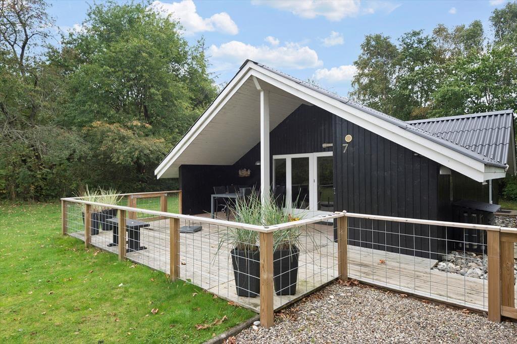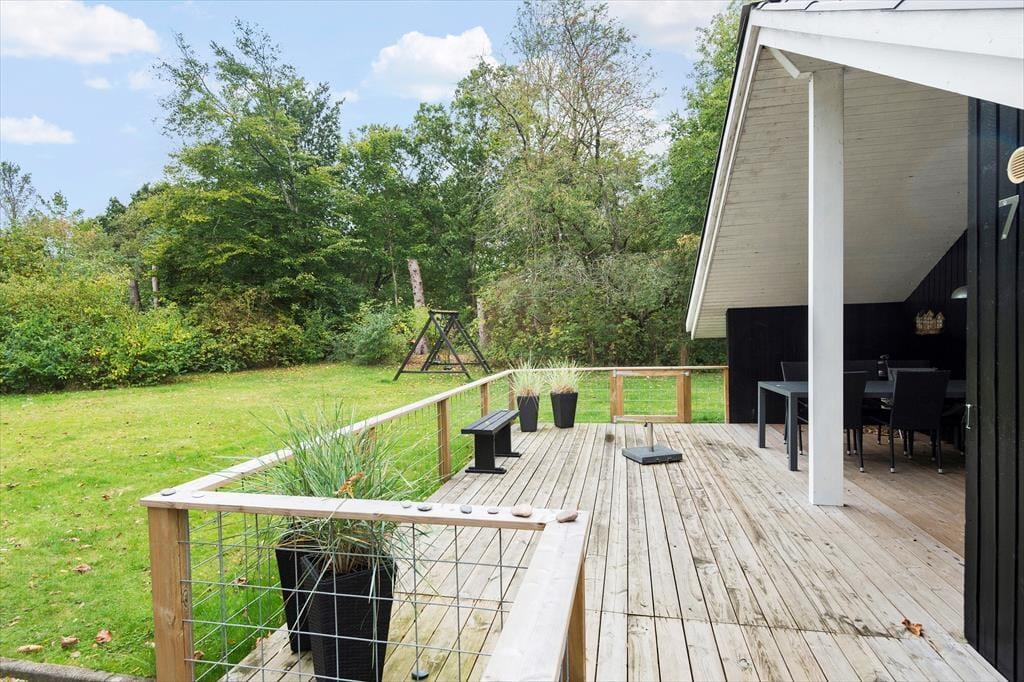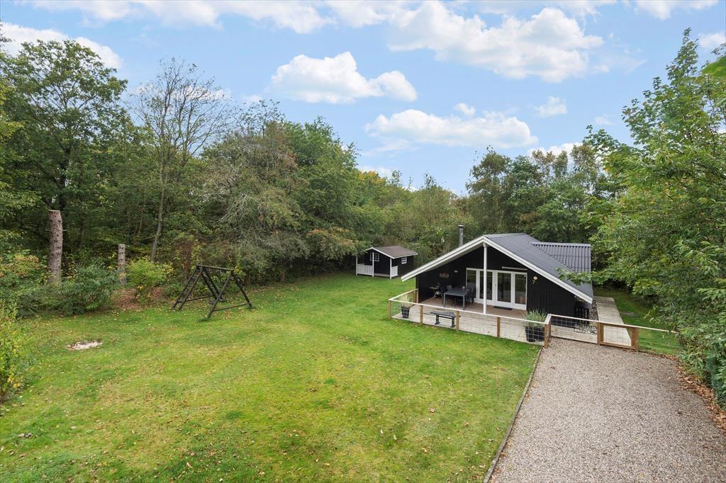 Ude på den store, ugenerede grund kan I slå jer ned på den delvist overdækkede, sydvendte træterrasse, når I vil nyde livet i en liggestol eller spise sommerfrokost i solen. Grillen kan I tænde op i forud for aftensmaden – med mindre menuen står på snobrød og anden bålmad, som I tilbereder ved bålstedet. De yngste familiemedlemmer kan gynge, boltre sig på græsplænen og hygge sig med saftevand på deres egen terrasse ved legehuset. Hundehegnet rundt omkring sommerhuset muliggør, at hunden nemt kan luftes.