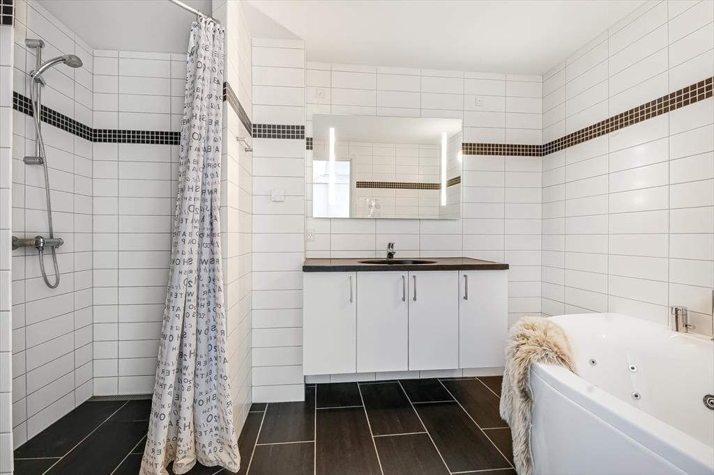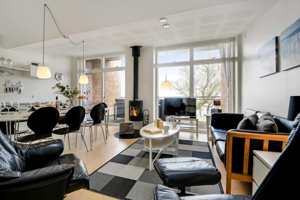 Den attraktive beliggenhed i første parket til vandet er kun en af mange kvaliteter, for lejligheden er nemlig et rummeligt og særdeles velindrettet eksemplar på hele 132 m2. Både i stueplan og på førstesalen er lysindfaldet gennem de store vinduespartier særdeles godt – men det er selvfølgelig på førstesalen, at udsigten er mest forrygende. Her ligger et stort opholdsrum med stue og køkken i åben forbindelse, og ligesom de øvrige rum er det smagfuldt indrettet med moderne og komfortabelt møblement, inklusiv en flot brændeovn. De fire soveværelser har i alt plads til otte personer, og hvis I er mange samlet, er det rart, at der er to badeværelser til rådighed i lejligheden. Det største badeværelse er endda udstyret med et spabad, så I kan forkæle jer selv med en rigtig wellness-stund i ny og næ.