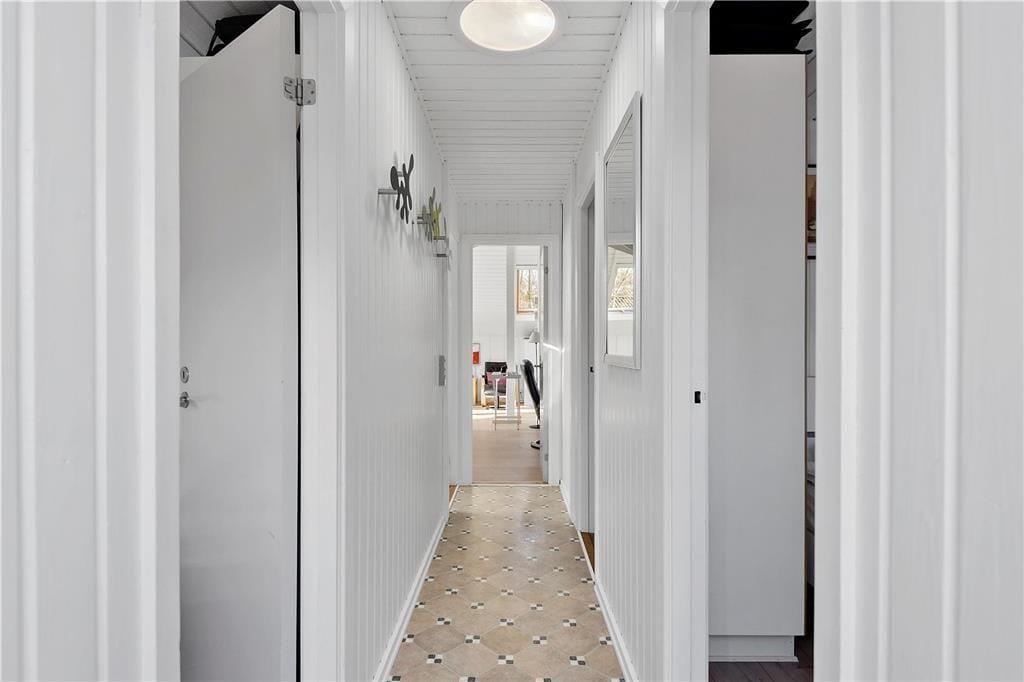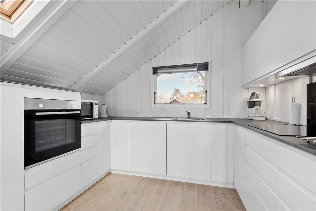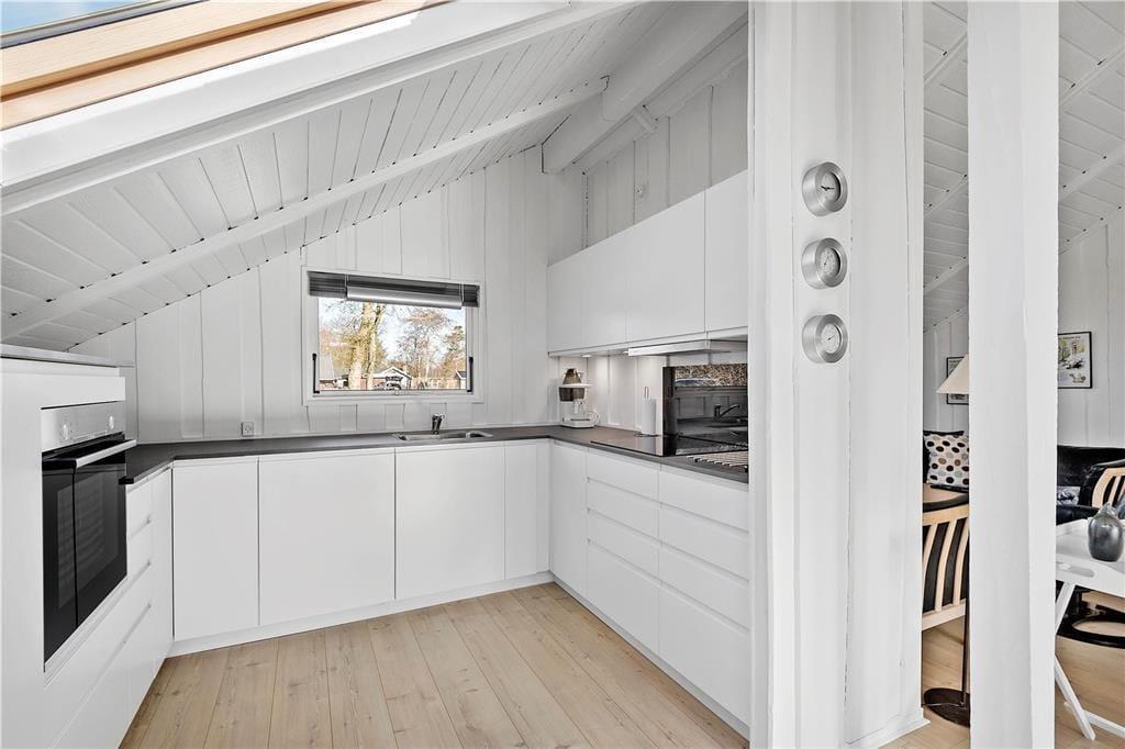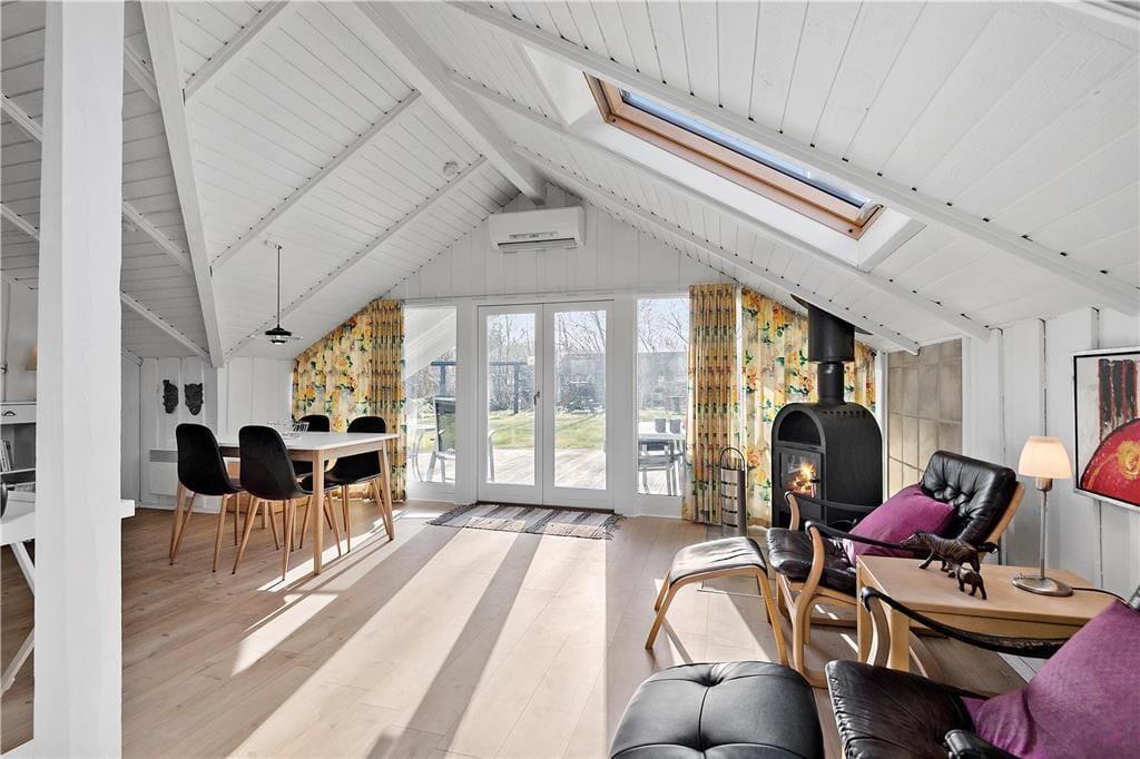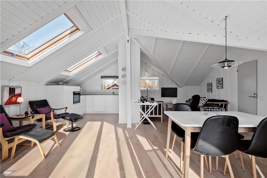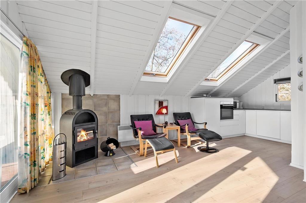 En af de ting, I sikkert hurtigt vil bemærke, når I træder indenfor, er sommerhusets lette atmosfære. Trævæggene og de skrå lofter er holdt i hvidt, og i opholdsafdelingen er der ikke bare gennemstrømmende lysindfald, men også ovenlysvinduer, så I kan se solen og havens grønne trætoppe i løbet af dagen. Opholdsafdelingen består af stue og køkken i åben forbindelse, så det er formentlig her, en stor del af indelivets vågne timer kommer til at udspille sig. Nattesøvn og middagslure kan foregå på de to soveværelser, og på badeværelset kan I blive frisket op med et morgenbad og tandbørstning.