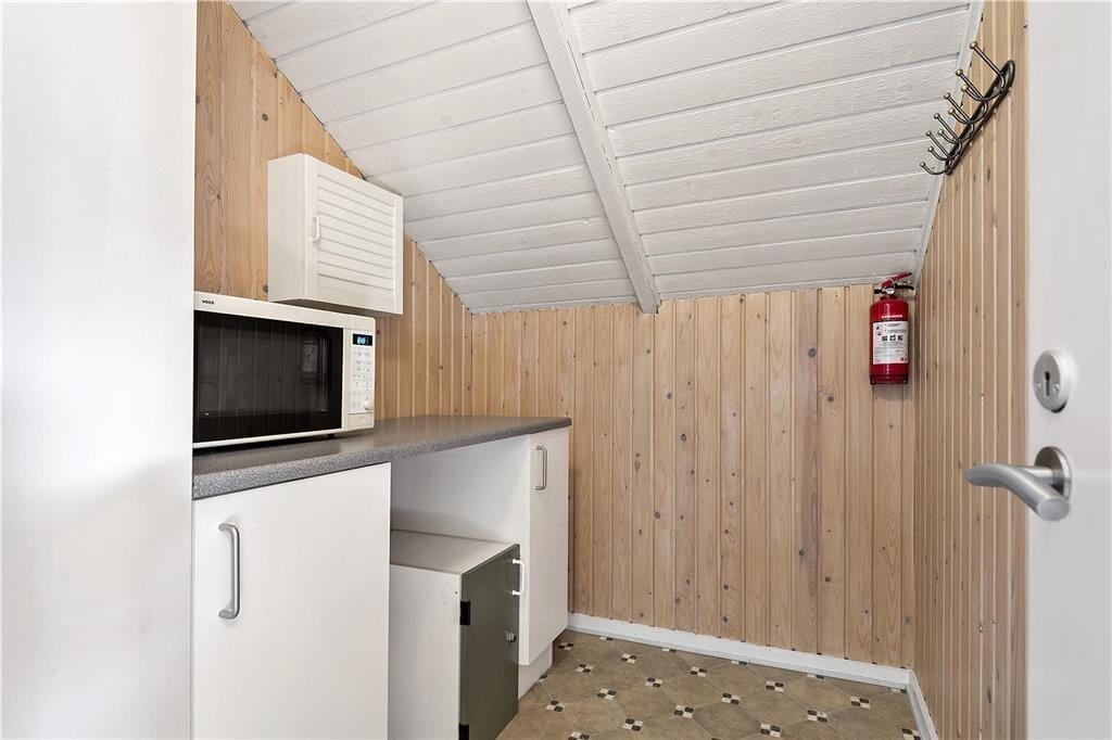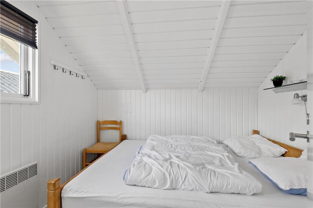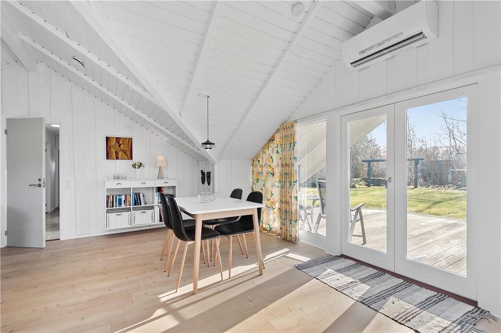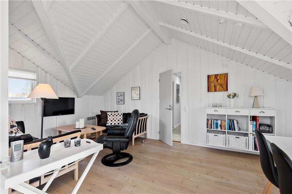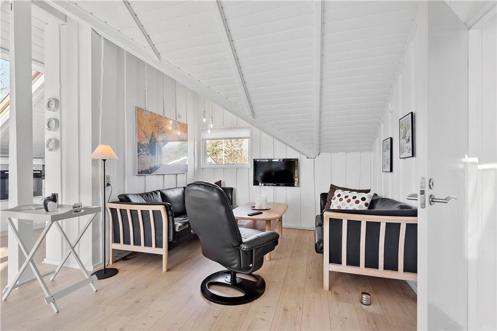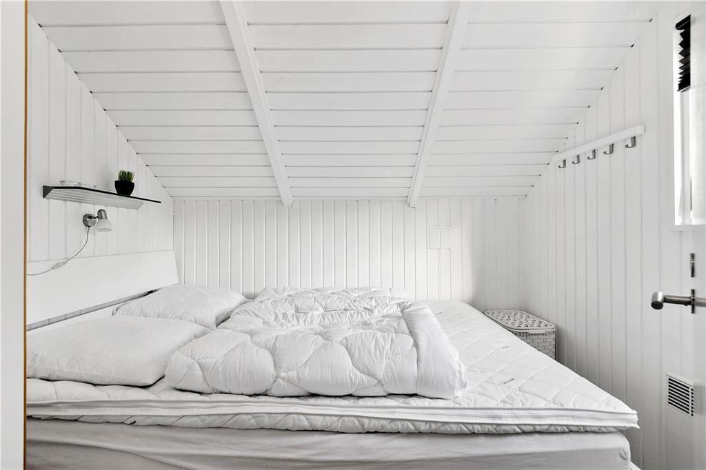 En af de ting, I sikkert hurtigt vil bemærke, når I træder indenfor, er sommerhusets lette atmosfære. Trævæggene og de skrå lofter er holdt i hvidt, og i opholdsafdelingen er der ikke bare gennemstrømmende lysindfald, men også ovenlysvinduer, så I kan se solen og havens grønne trætoppe i løbet af dagen. Opholdsafdelingen består af stue og køkken i åben forbindelse, så det er formentlig her, en stor del af indelivets vågne timer kommer til at udspille sig. Nattesøvn og middagslure kan foregå på de to soveværelser, og på badeværelset kan I blive frisket op med et morgenbad og tandbørstning.