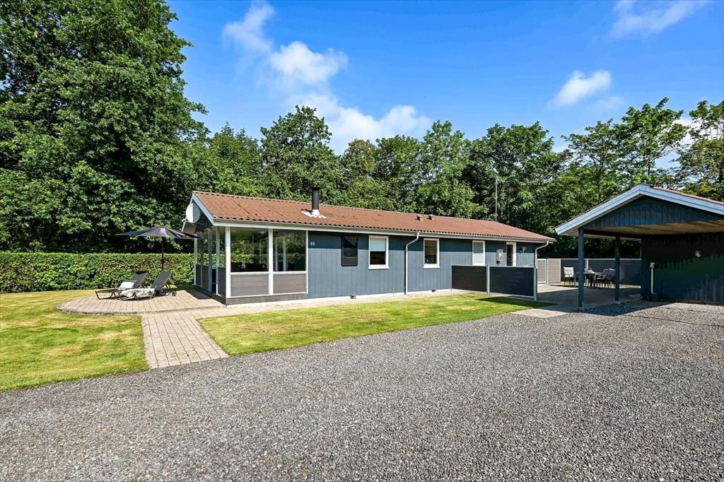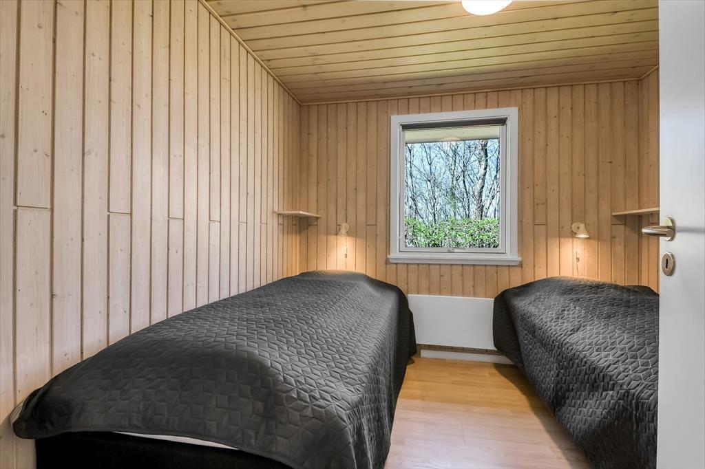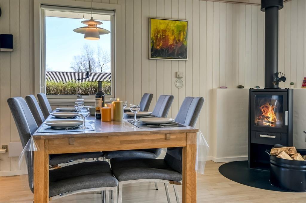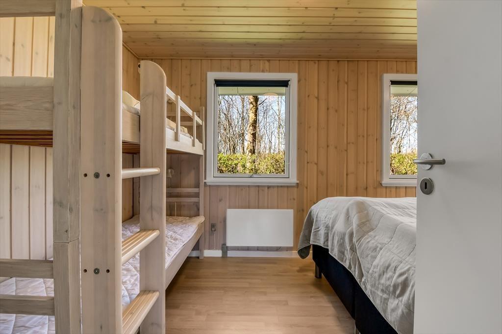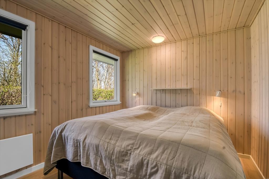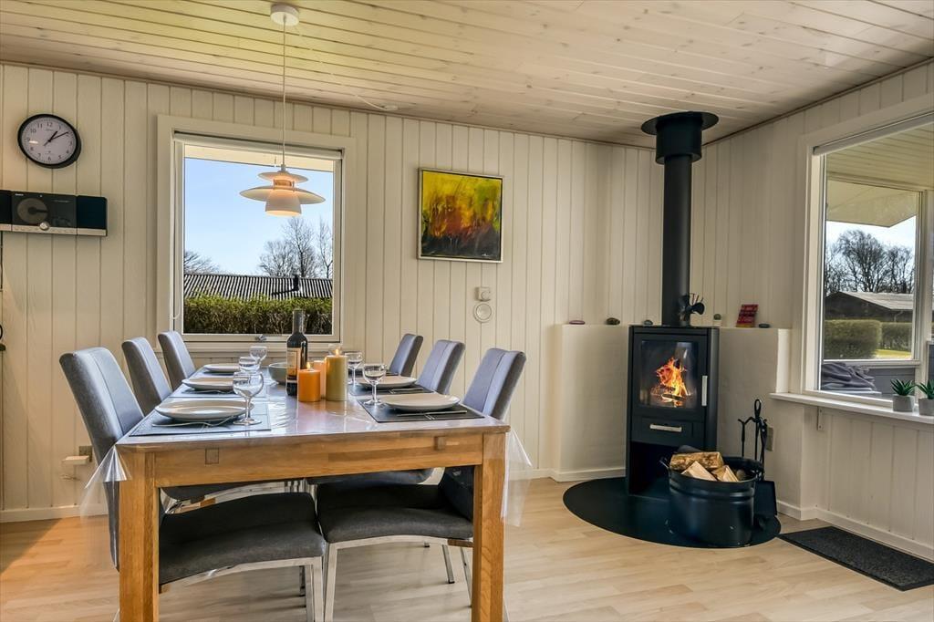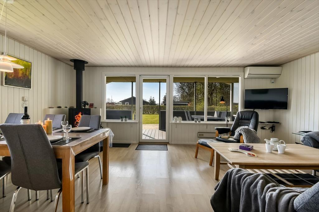 Sommerhuset har ligget her på den skønne, tilbagetrukne adresse siden 1974, og takket være en grundig renovering i 2020 præsenterer det sig på pæn og velholdt vis. Inden døre er trævæggene lyse, og møblementet passer godt ind i de indbydende rum. I et hjørne af stuen står en brændeovn klar til at bidrage med varme og hyggestemning på de kolde dage, og varmepumpen kan også tages i brug – og den kan for øvrigt også køle, når sommersolen stråler over Bork Havn. Udover sofaafdeling, TV med Chromecast og spisebord ligger køkkenet også som en velfungerende del af stuen, så selvom aftensmaden skal forberedes, går I ikke glip af det gode selskab. I huset finder I desuden et pænt badeværelse og et gæste WC - begge dele totalrenoveret i 2022. Desuden er der vaske- og tørrefaciliteter og endelig tre soveværelser, der i alt kan rumme otte feriegæster.