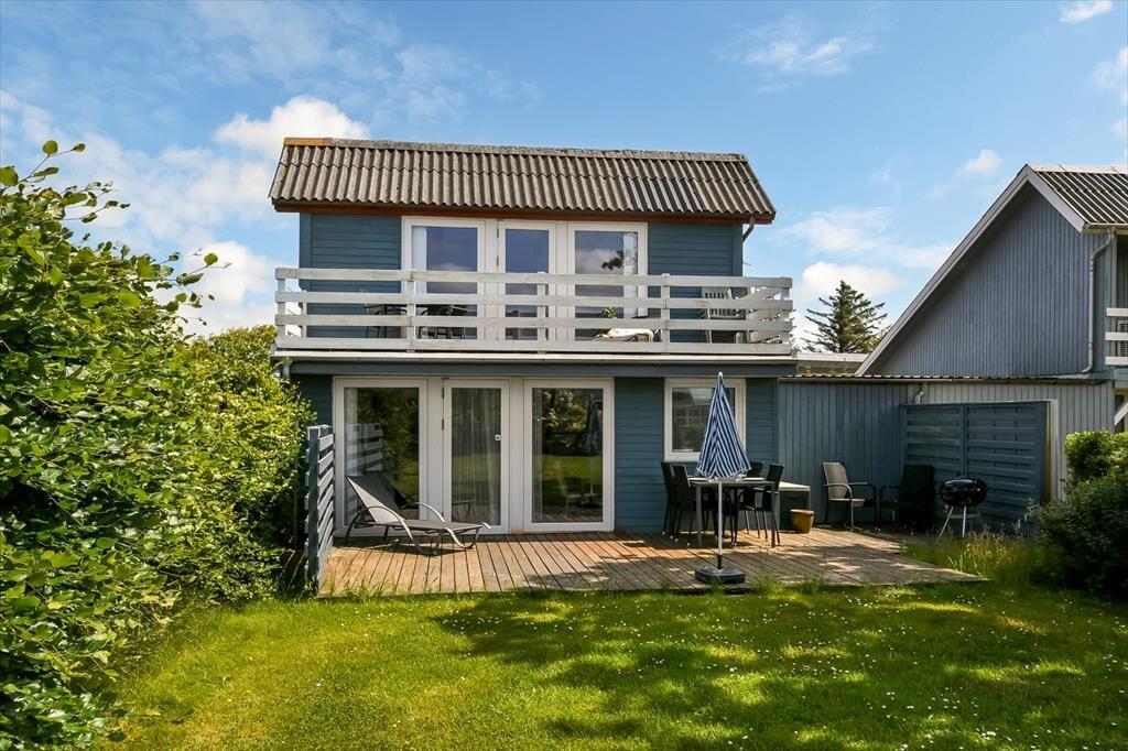 På sommerhusgrunden er der carport til bilen og en græsplæne til leg og boldspil. Afslapningsstunderne kan oplagt foregå på den 20 m2 store træterrasse, der er udstyret med havemøbler, liggestole og grill. I kan også sætte jer på førstesalens dejlige altan: Ligesom terrassen ligger den godt i forhold til solen, og så kan I samtidig nyde, at der er kig til fjorden.