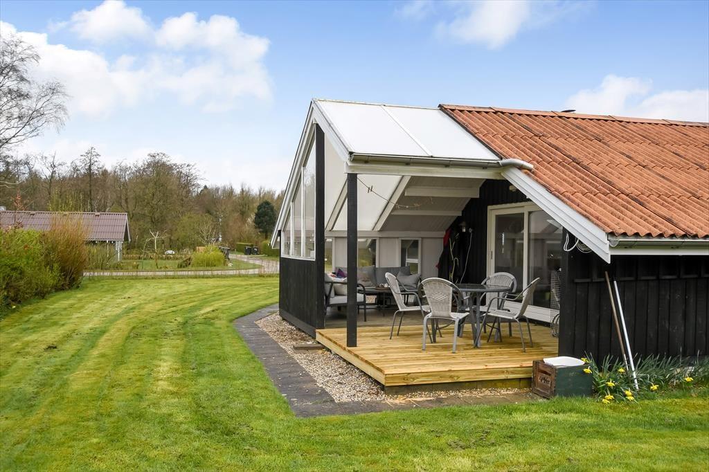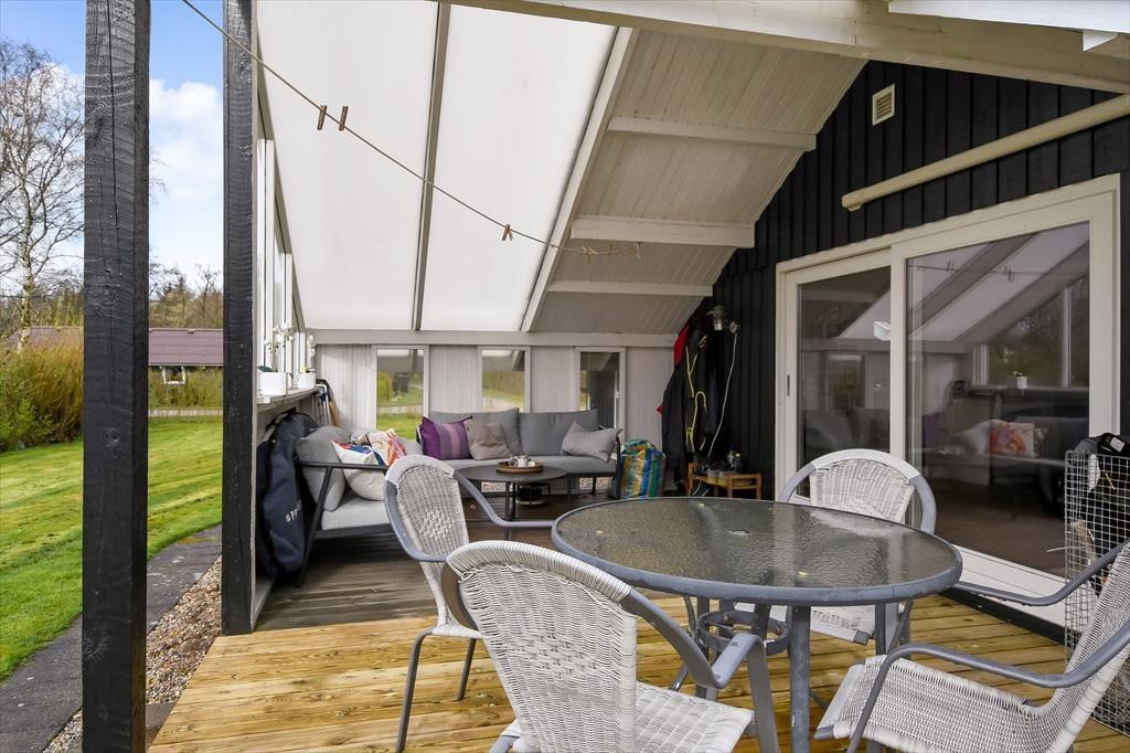 I forlængelse af stuen ligger en delvist overdækket terrasse, og her er halvtaget så stort, at I sagtens kan sidde her alle sammen – for eksempel hvis I vil hygge jer i loungehjørnet om aftenen uden at tænke på, om duggen falder. På en lys sommerdag er det selvfølgelig også fristende at rykke driverlivet helt ud under åben himmel, og hvis børnene lokker dig op af havestolen for at lege eller spille bold, har I god plads til at folde jer ud på græsplænen. Bilen kan holde i den grusbelagte indkørsel, og hvis I er løbet tør for mælk til morgenkaffen, kan du takket være husets cykel hurtigt smutte hen til købmanden efter nye forsyninger.