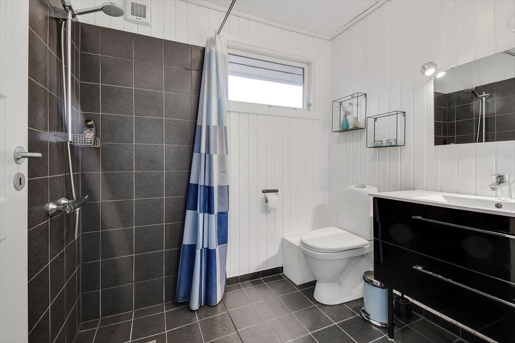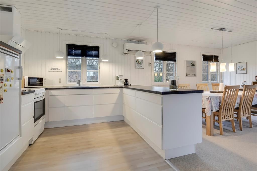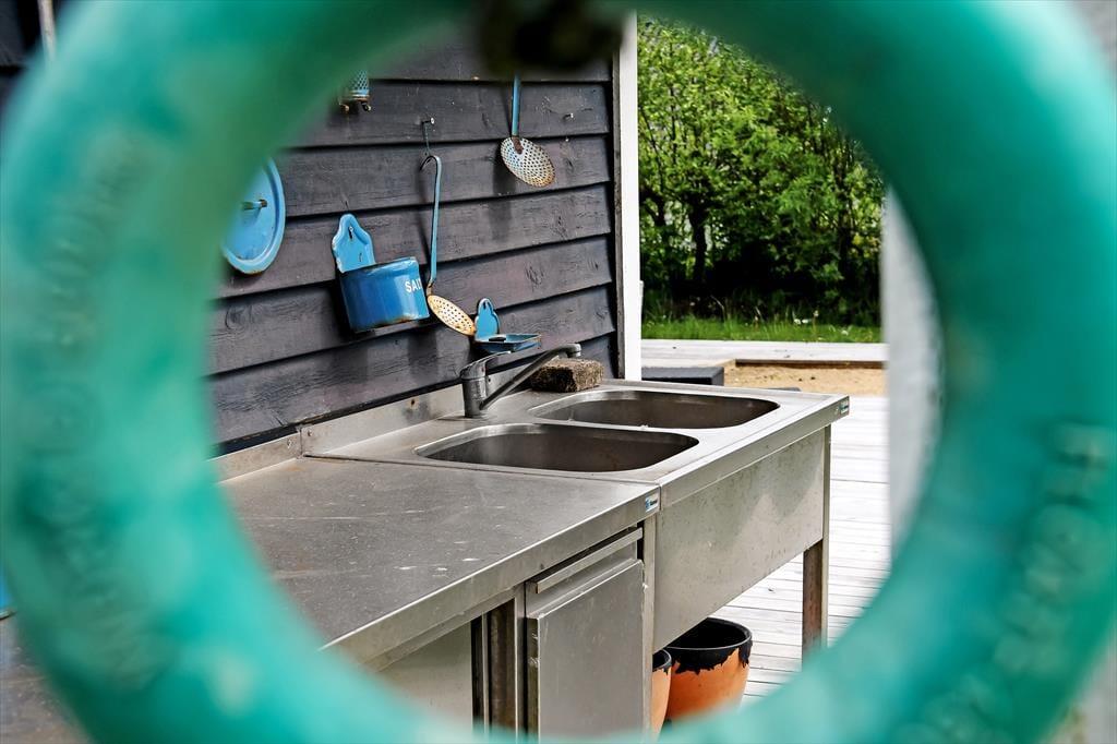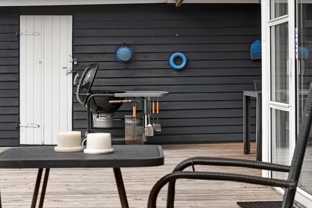 Huset har lige så meget at byde på udendørs – en del af terrassen er overdækket, og her er der spiseplads og grill. Yderligere er der et udekøkken til rådighed, hvor maden eller den friskfangede fisk kan tilberedes. Her er også plads til både afslapning og liggestole, hvis nogen skulle have brug for en lur i den friske luft. For enden af terrassen er der også en stor græsplæne, så alt i alt er her masser af plads for både store og små under den åbne himmel.