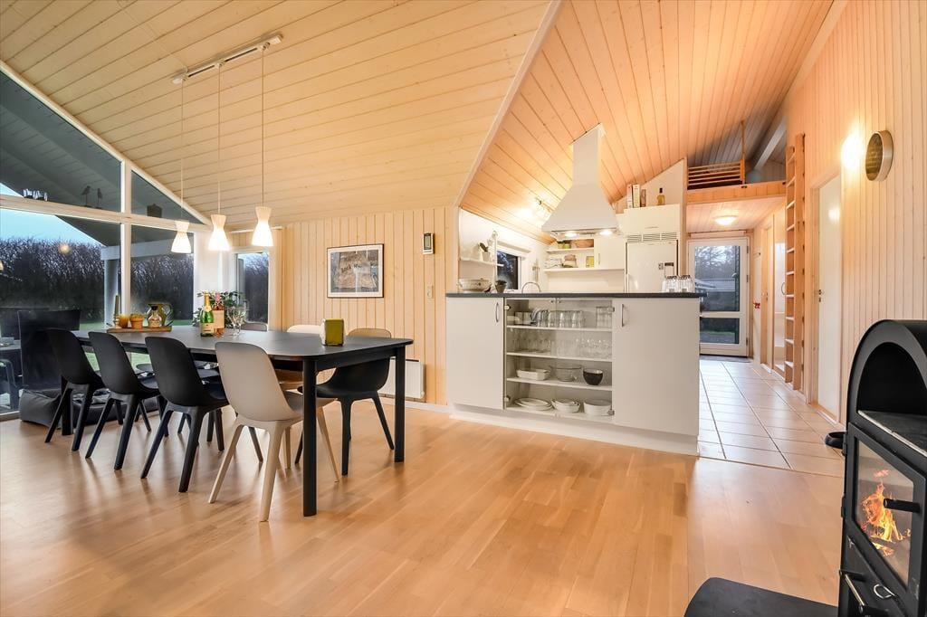 Når I ankommer til huset, træder I direkte ind i det store køkken-alrum, der er selve hjertet i huset. Her er der højt til loftet og masser af plads til alle i familien – og køkken-alrummet vil uden tvivl være det primære opholdsrum i løbet af jeres ferie. Her kan I både lave mad, hygge jer ved spisebordet eller nyde tiden i sofaen med en god bog eller en god film i fjernsynet – og herfra kan I også nyde blikket ud, da der er masser af store vinduer ud til haven. Over køkkenet er der også en hems, hvor man kan trække sig tilbage, hvis man ønsker en pause. Huset har hele fire store soveværelser med lys og skabsplads. Udover det er der hele to rummelige badeværelser i huset – det ene er udstyret med vaskemaskine og tørretumbler, og i det andet badeværelse er der både spa og en sauna – uden tvivl det perfekte touch til en afslappet ferie.