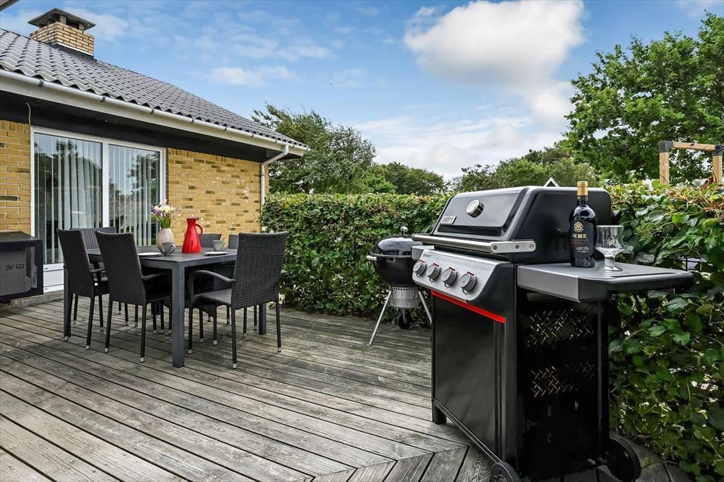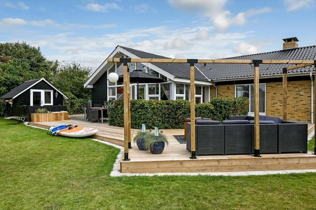 Sommerhusets grund er stor og velanlagt, og selv hvis I er mange samlet, har I godt med plads til at lege, spille bold og nyde det lune og solrige vejr på helt rolig vis. Den pæne græsplæne kan danne rammen om børnenes kolbøtter og andre fysiske udfoldelser, og omkring huset ligger der flere terrasser, så du og dine kære kan sætte jer der, hvor der er mest sol og læ. Parasollen kan du slå op, hvis I vil have skygge til sommerfrokosten, og hvis du elsker at grille, kan aftensmaden blive tilberedt i det fri hver eneste dag.