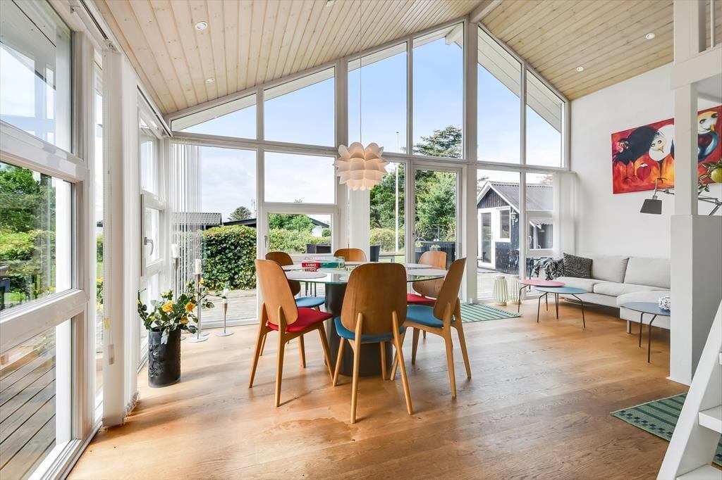 Der er mange skønne opholdspladser at vælge imellem i det 125 m2 store sommerhus, så uanset årstiden og dit humør kan du altid finde et dejligt sted at sidde. Havestuen er et hit på sommerlige dage og aftener, og på en kølig efterårsdag vil du sikkert foretrække at slappe af i en af stuens sofaafdelinger – for eksempel i nærheden af indbygningspejsen. Den hyggelige hems er også et rart sted at være, og du kan oplagt tage en kop kaffe med herop, hvis du vil sidde en stund og kigge ud på fjorden. Køkkenet ligger for øvrigt helt centralt i huset, mens tre gode værelser og et brusebadeværelse er samlet i et soveafsnit.