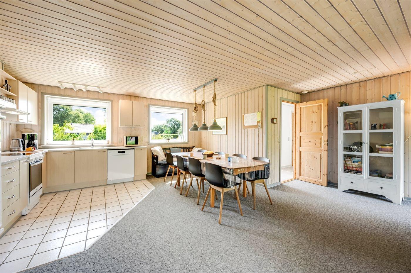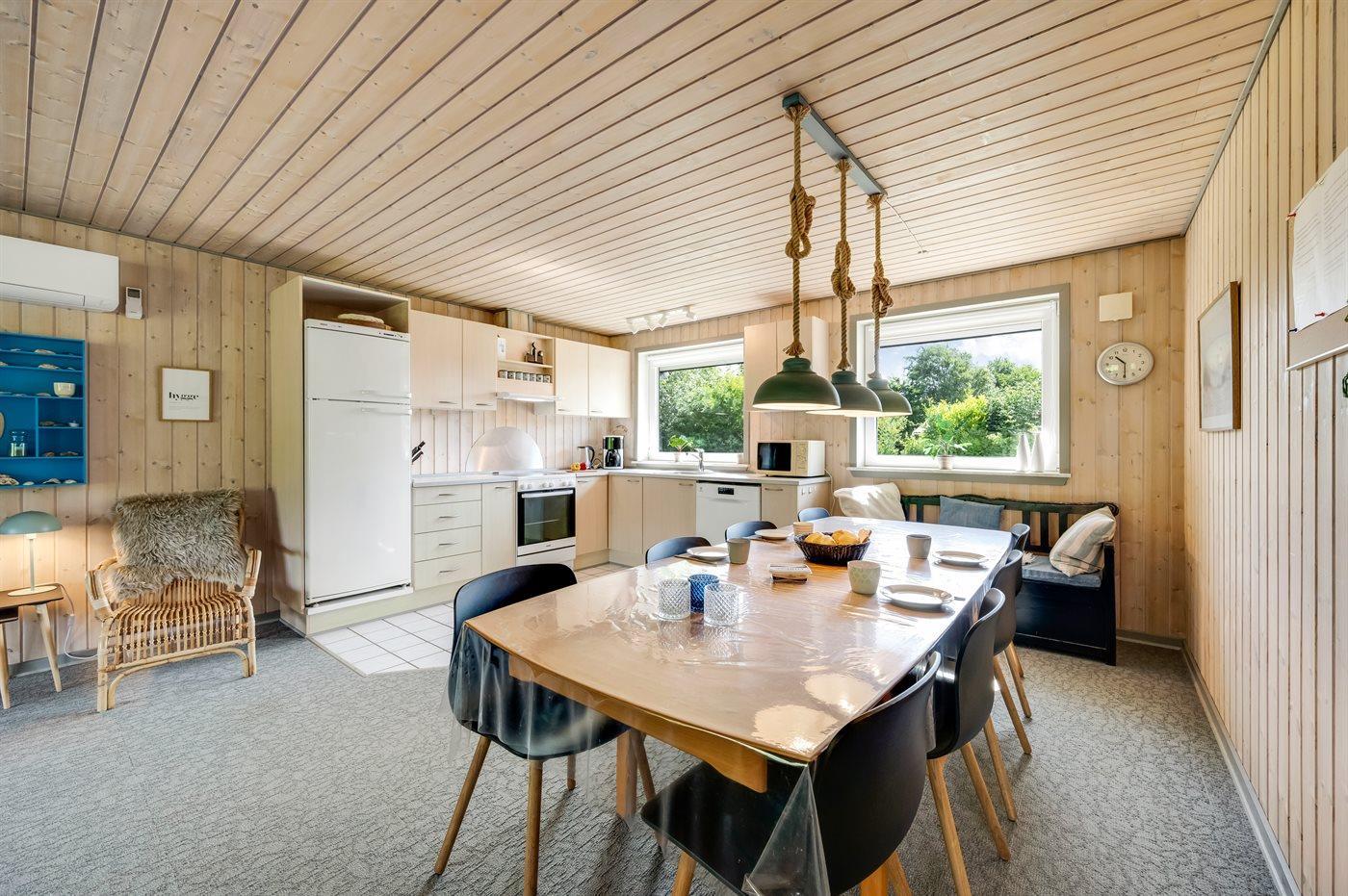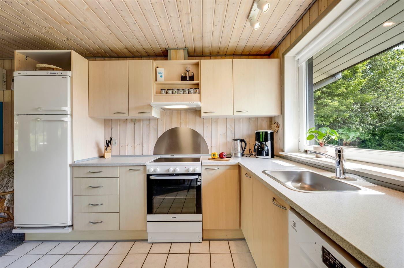 Køkkenet er udstyret med 1 køleskab. Der er 4 keramiske kogeplader, varmluftovn, mikrobølgeovn samt opvaskemaskine.