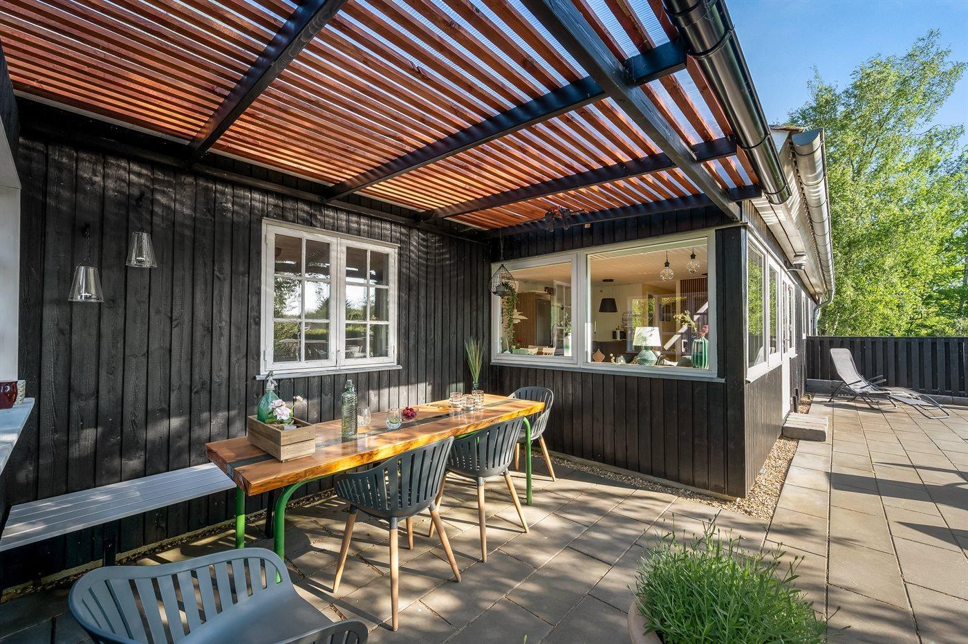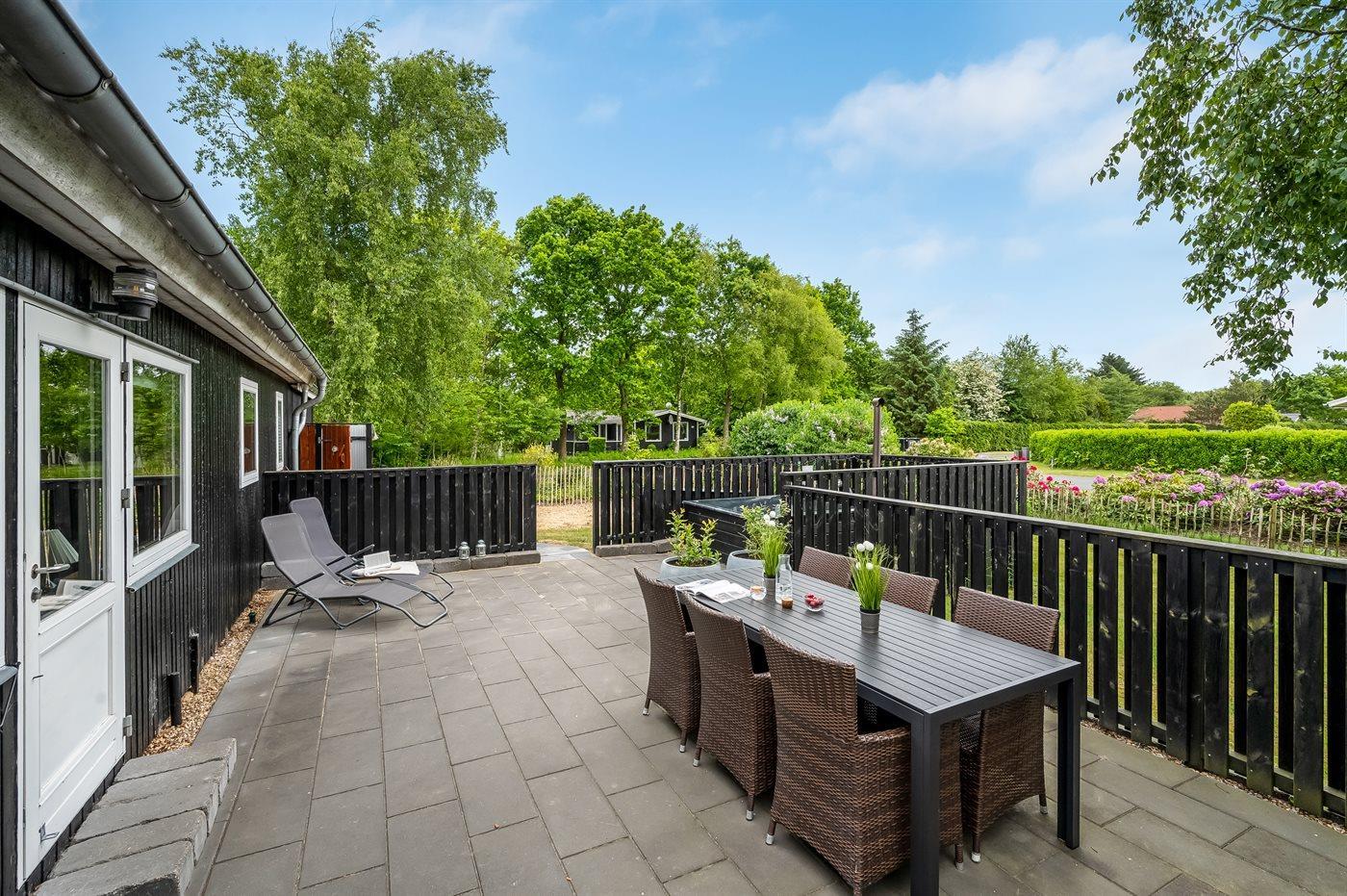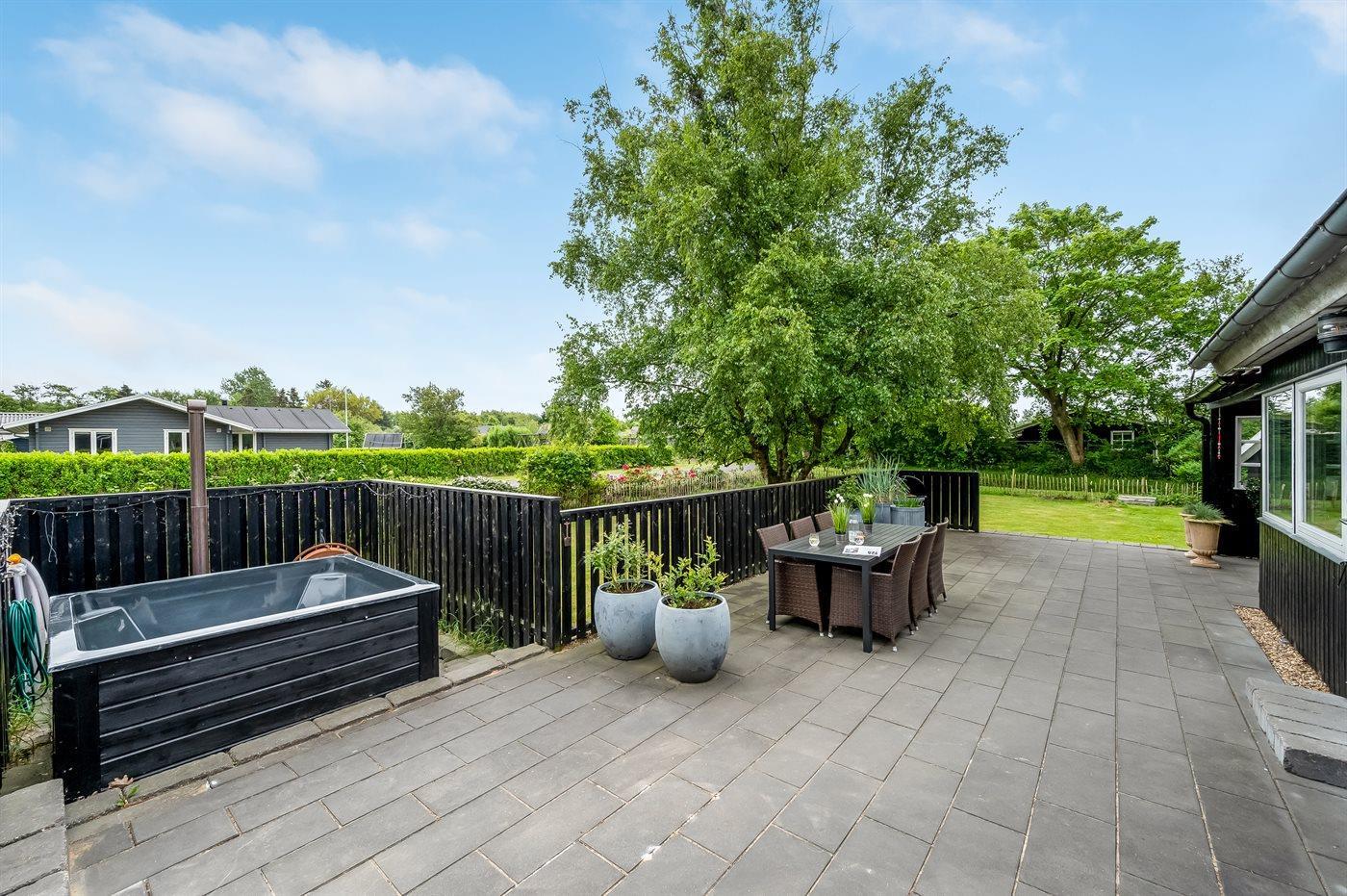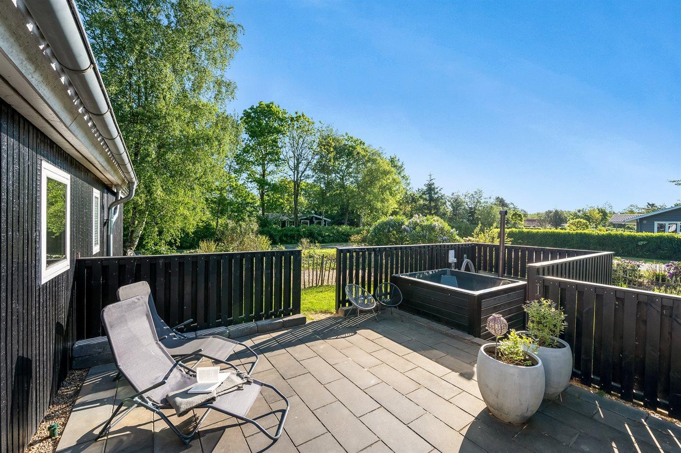Den store grund er indhegnet og er derfor en perfekt legeplads for hund og børn. På den store terrasse kan du nyde livet i vildmarksbadet, og dækket af det varme vand kan du slappe fuldstændigt af. Om aftenen er der frit udsyn til den smukke stjernehimmel. Ved siden af terrassen kan i også benytte den skønne udebruser.