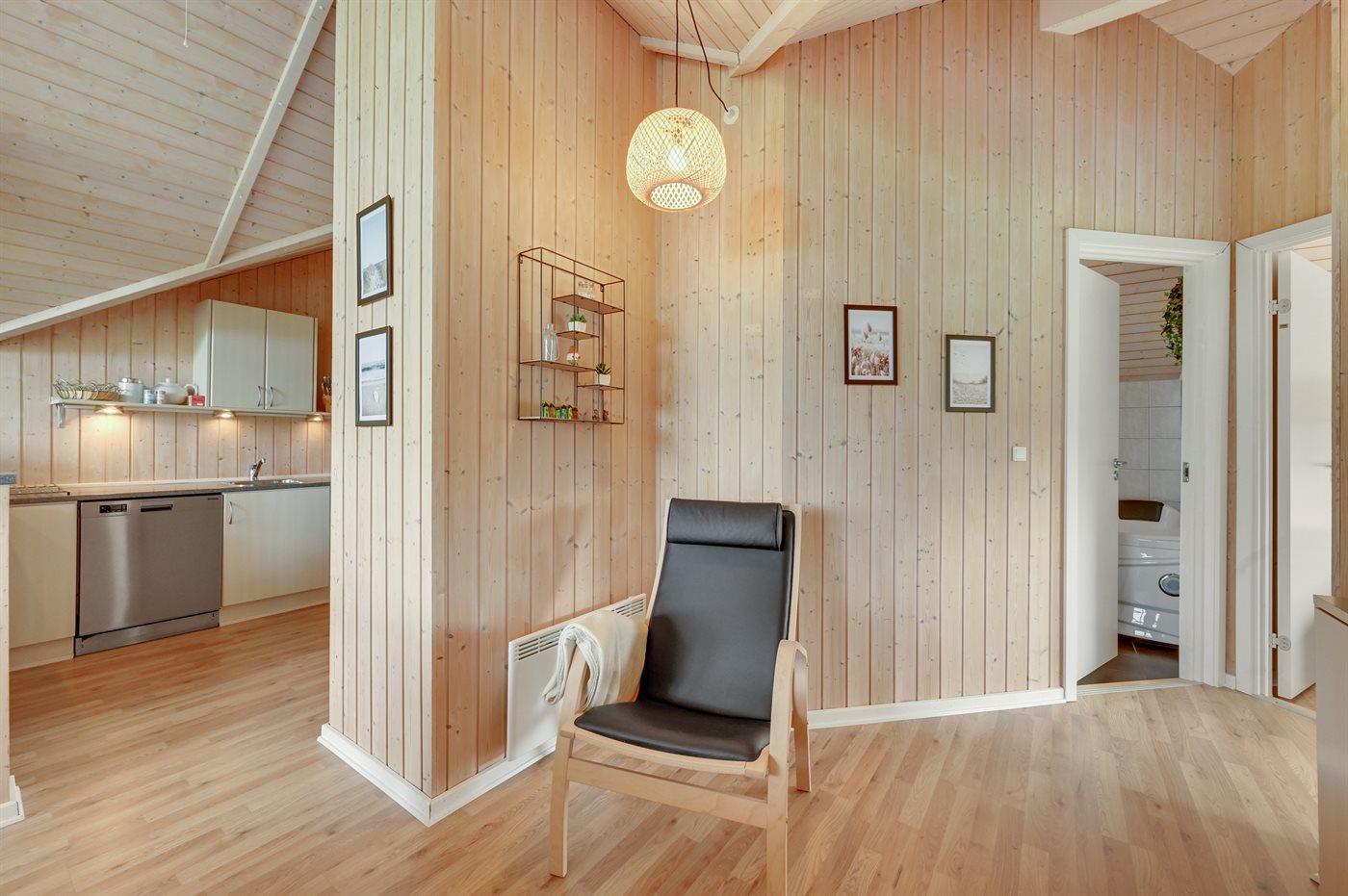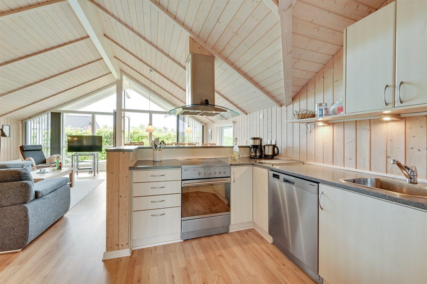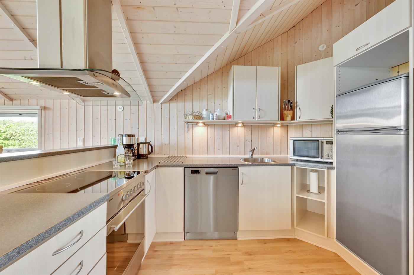 Køkkenet er udstyret med 1 køleskab. Der er 4 keramiske kogeplader, bageovn, mikrobølgeovn samt opvaskemaskine.