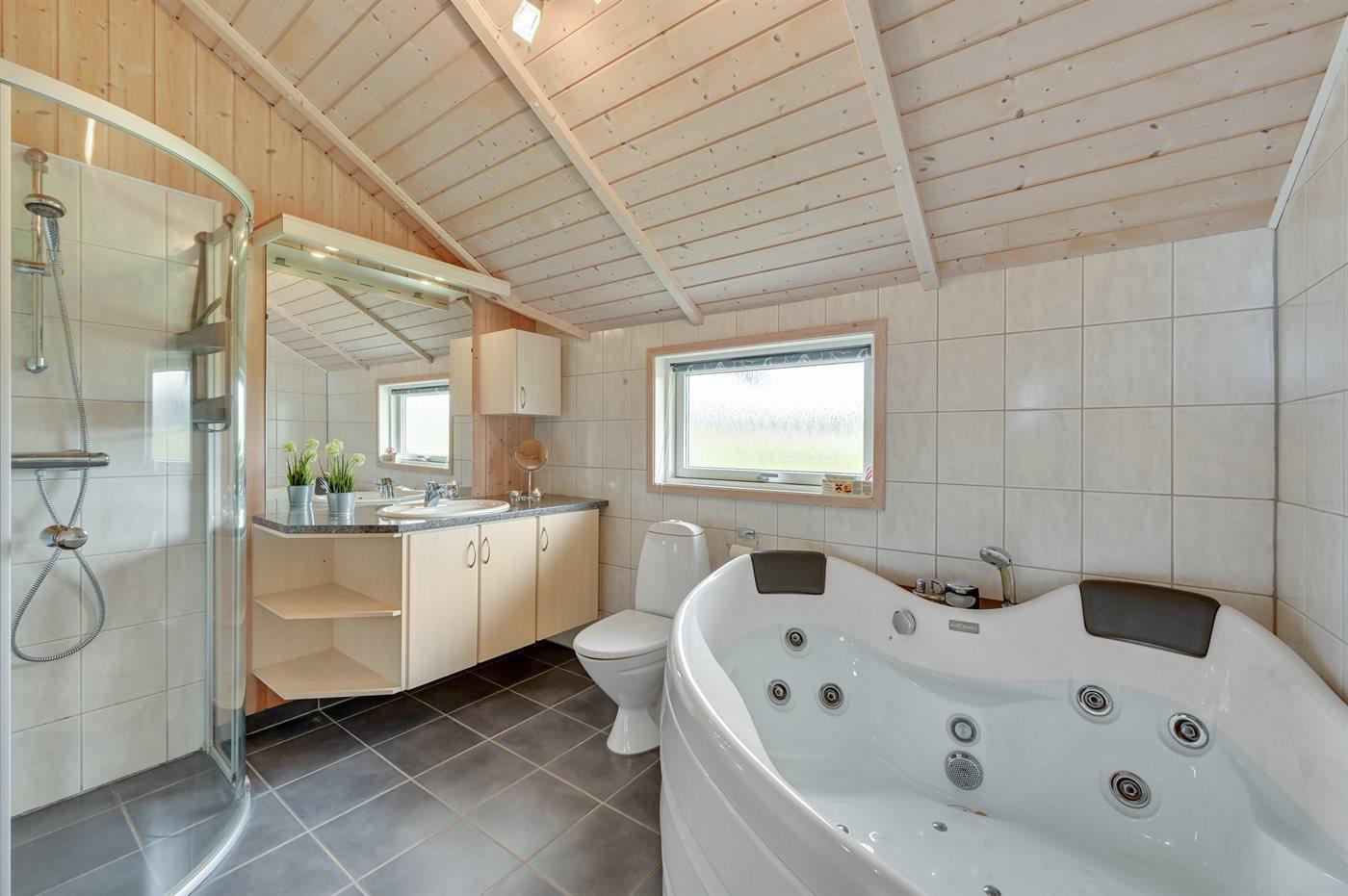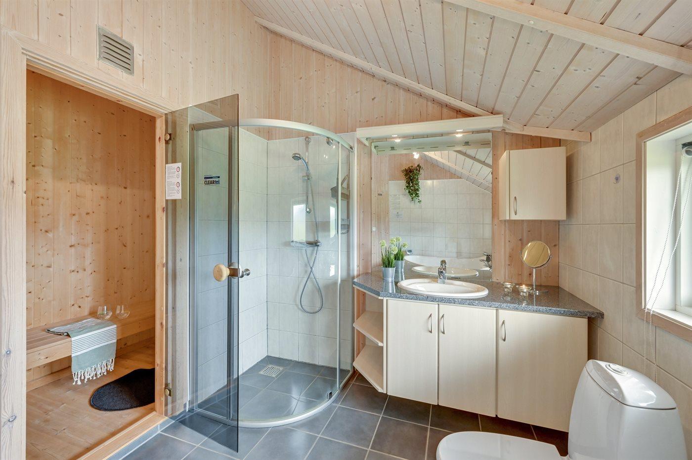 Der er 1 badeværelse med bruseniche og 2 toiletter, heraf 1 gæstetoilet. Der er gulvvarme på 1 badeværelse. Der er gulvvarme på gæstetoilettet. I saunaen er der mulighed for afslapning.
