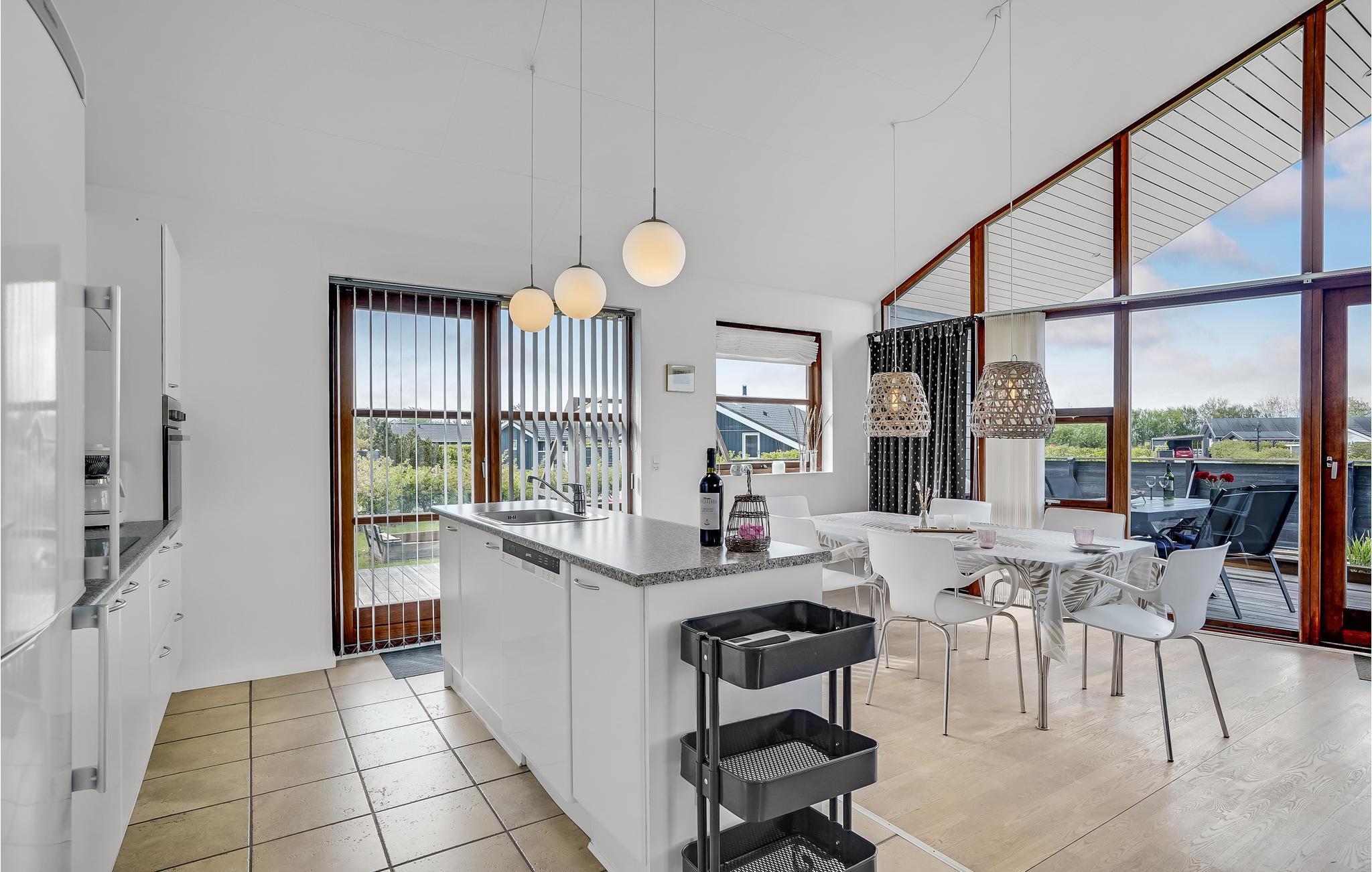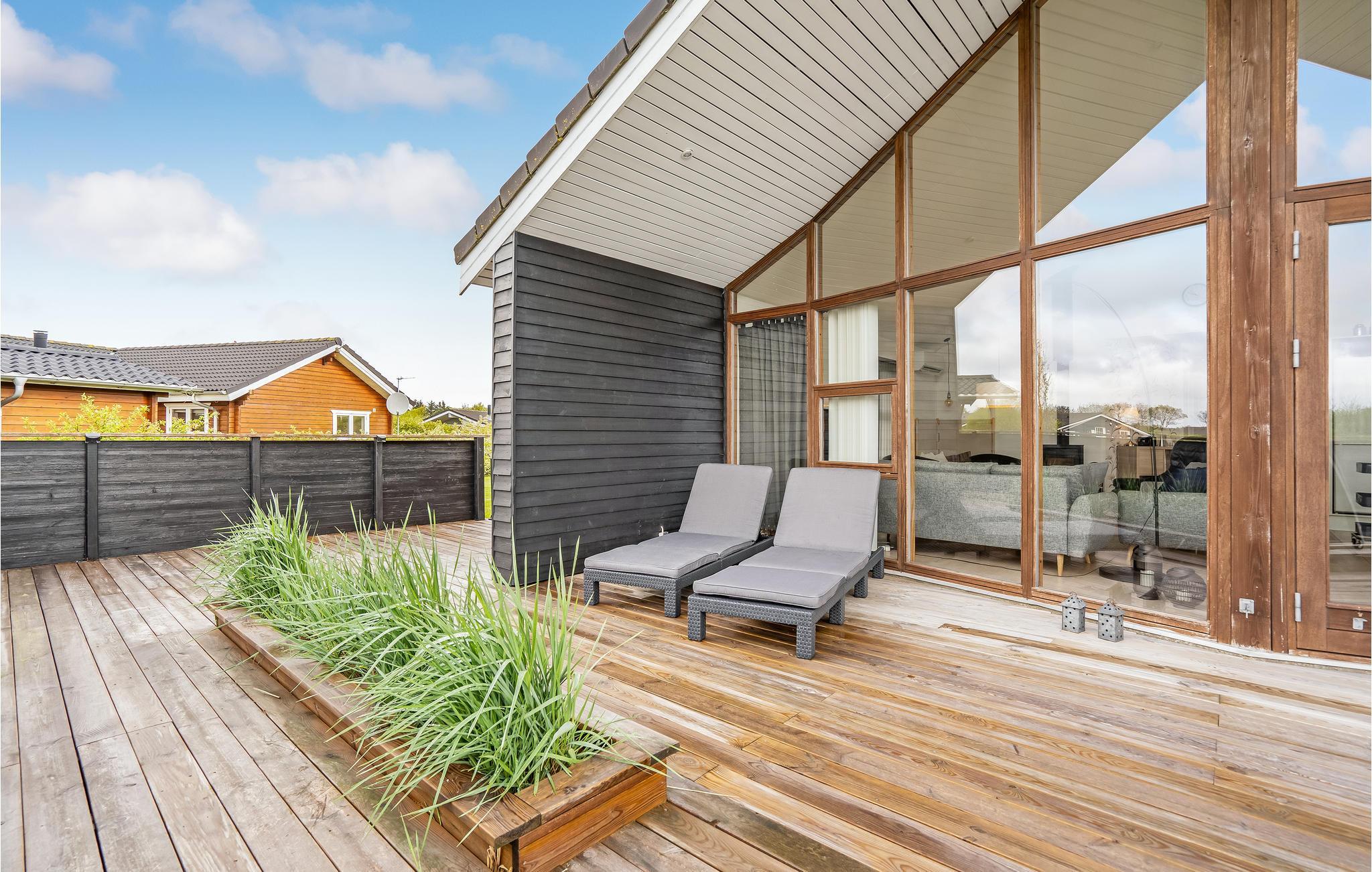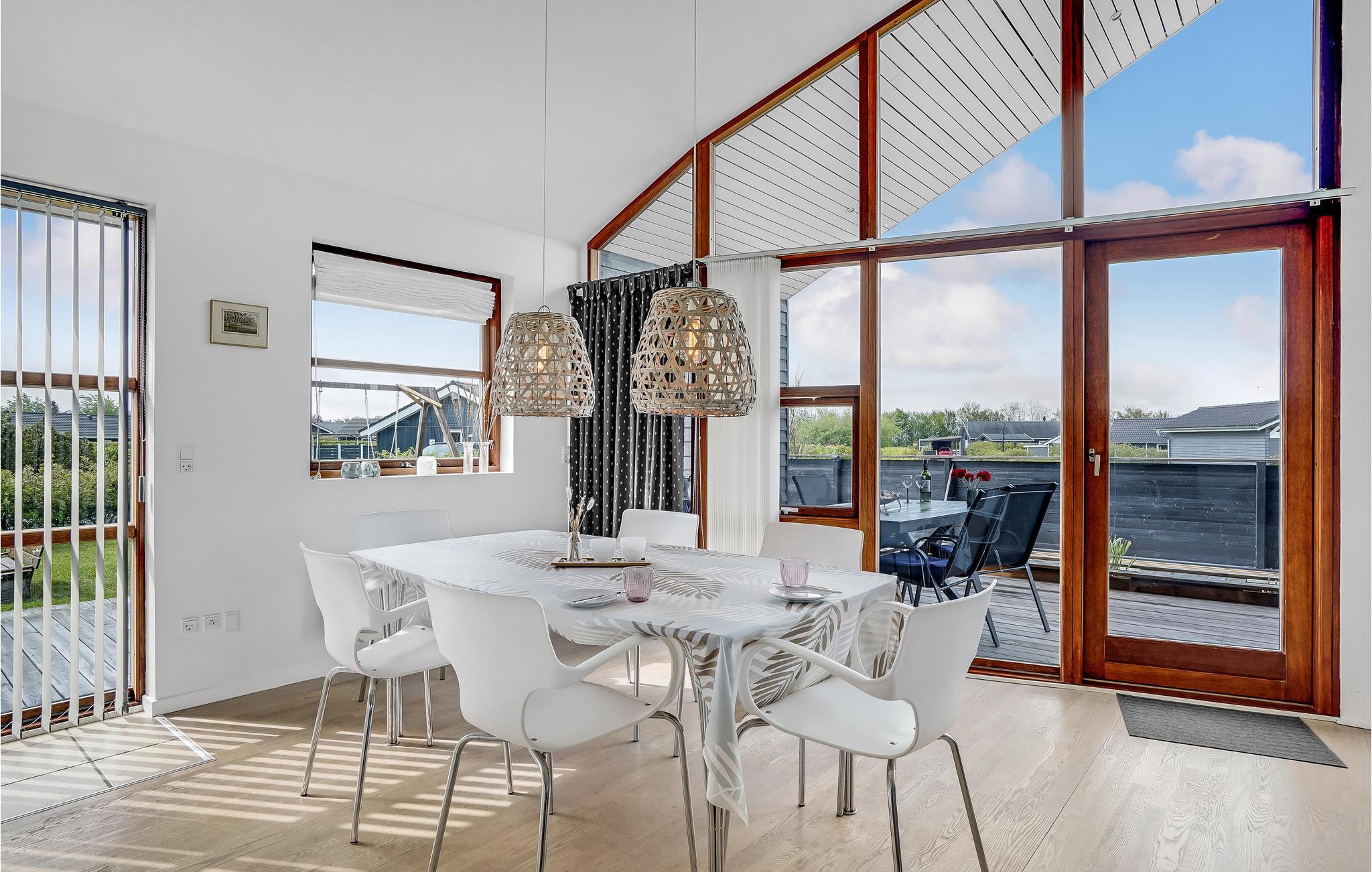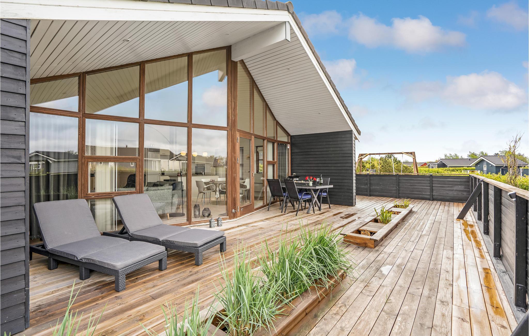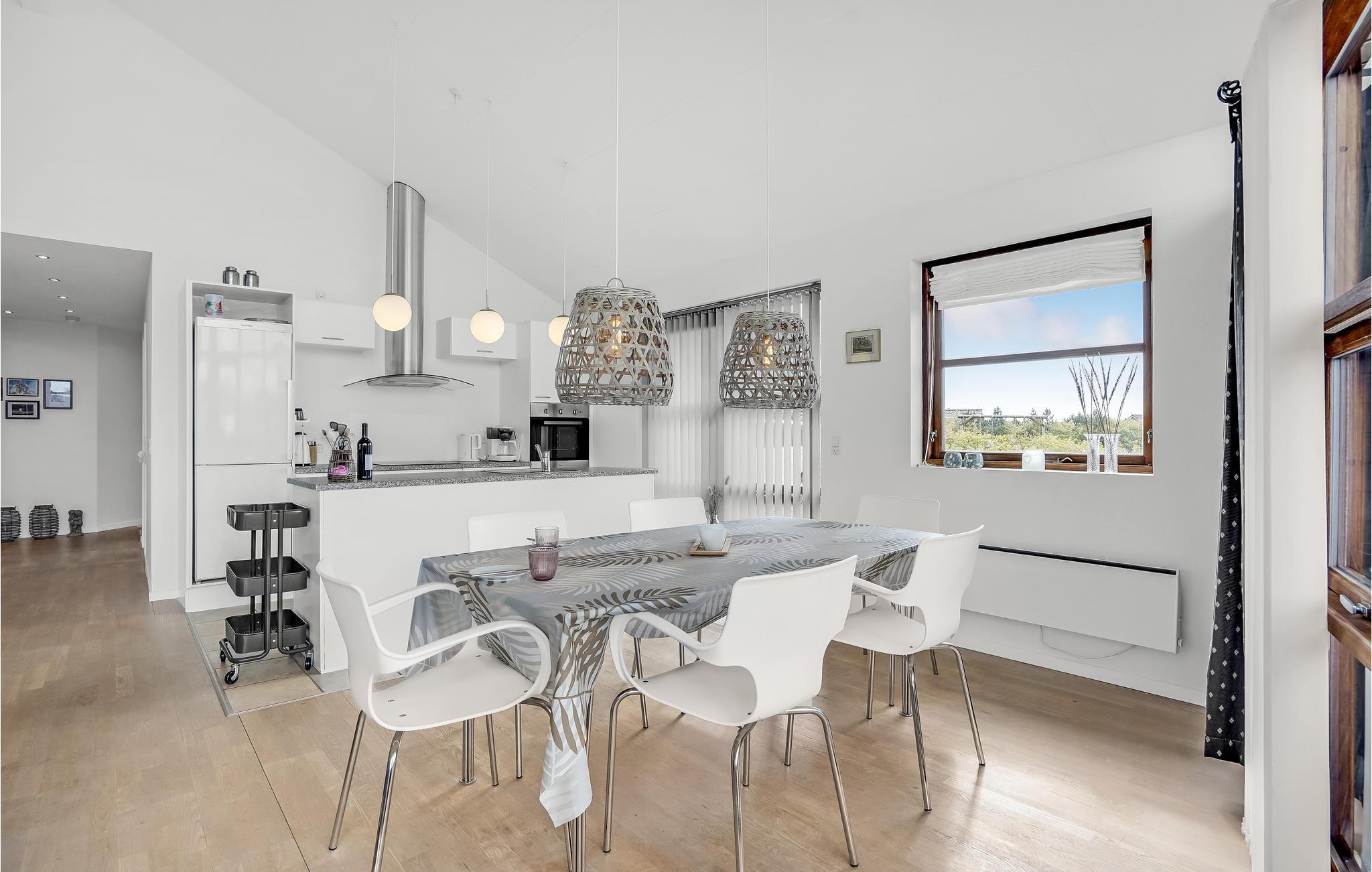 Meget lyst og venligt indrettet feriehus med et flot møbleret køkken/alrum med store panoramavinduer. Et af de to badeværelser er udstyret med spabad og sauna. Der er klinke- og trægulve overalt. Det er ikke tilladt at ryge indendørs. Huset er omgivet af flere gode og delvis overdækkede terrasser, hvor solen kan nydes dagen lang. Der er gåafstand til Ringkøbing Fjord med en dejlig og meget børnevenlig badestrand samt gode muligheder for windsurfing.