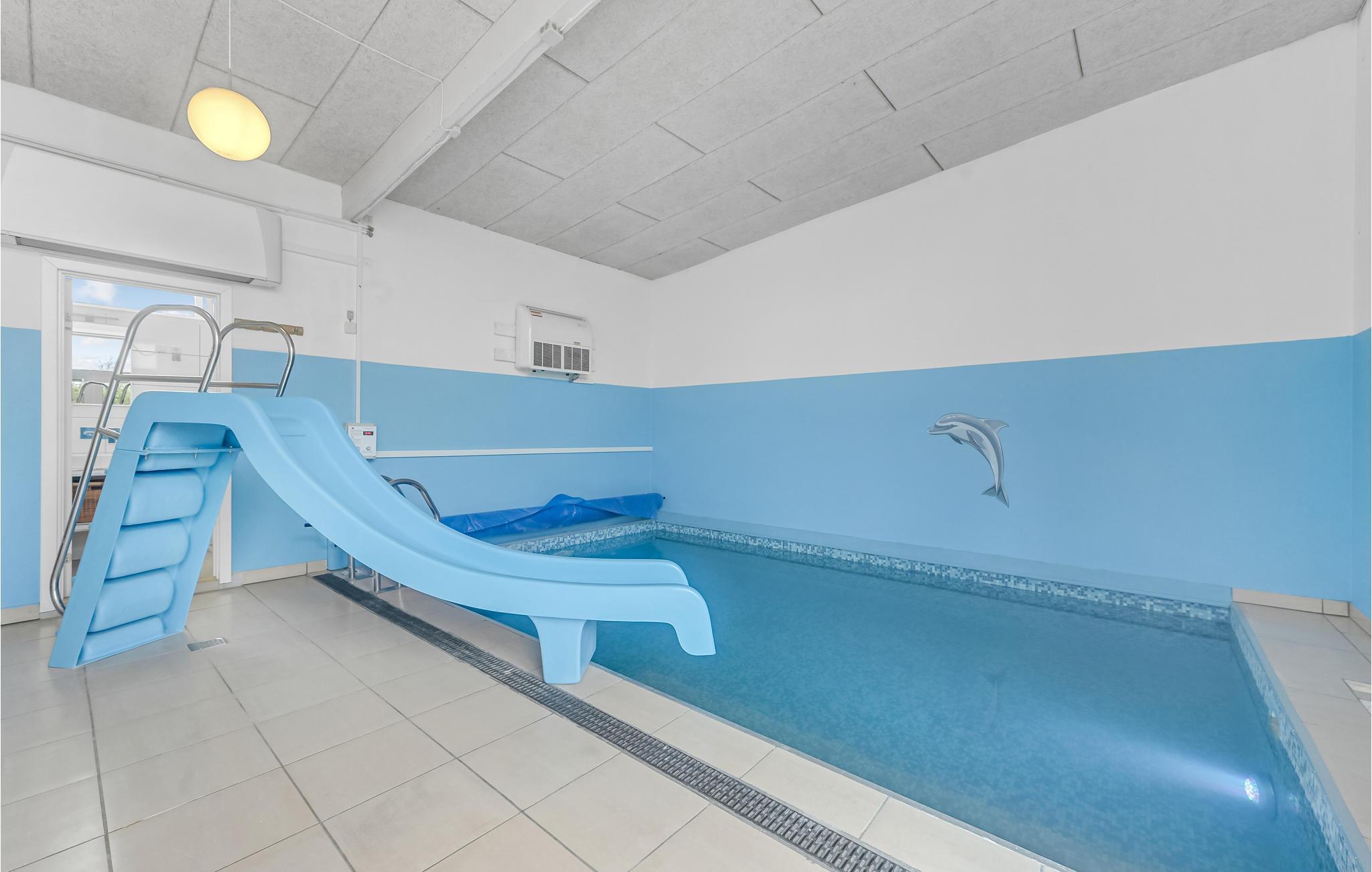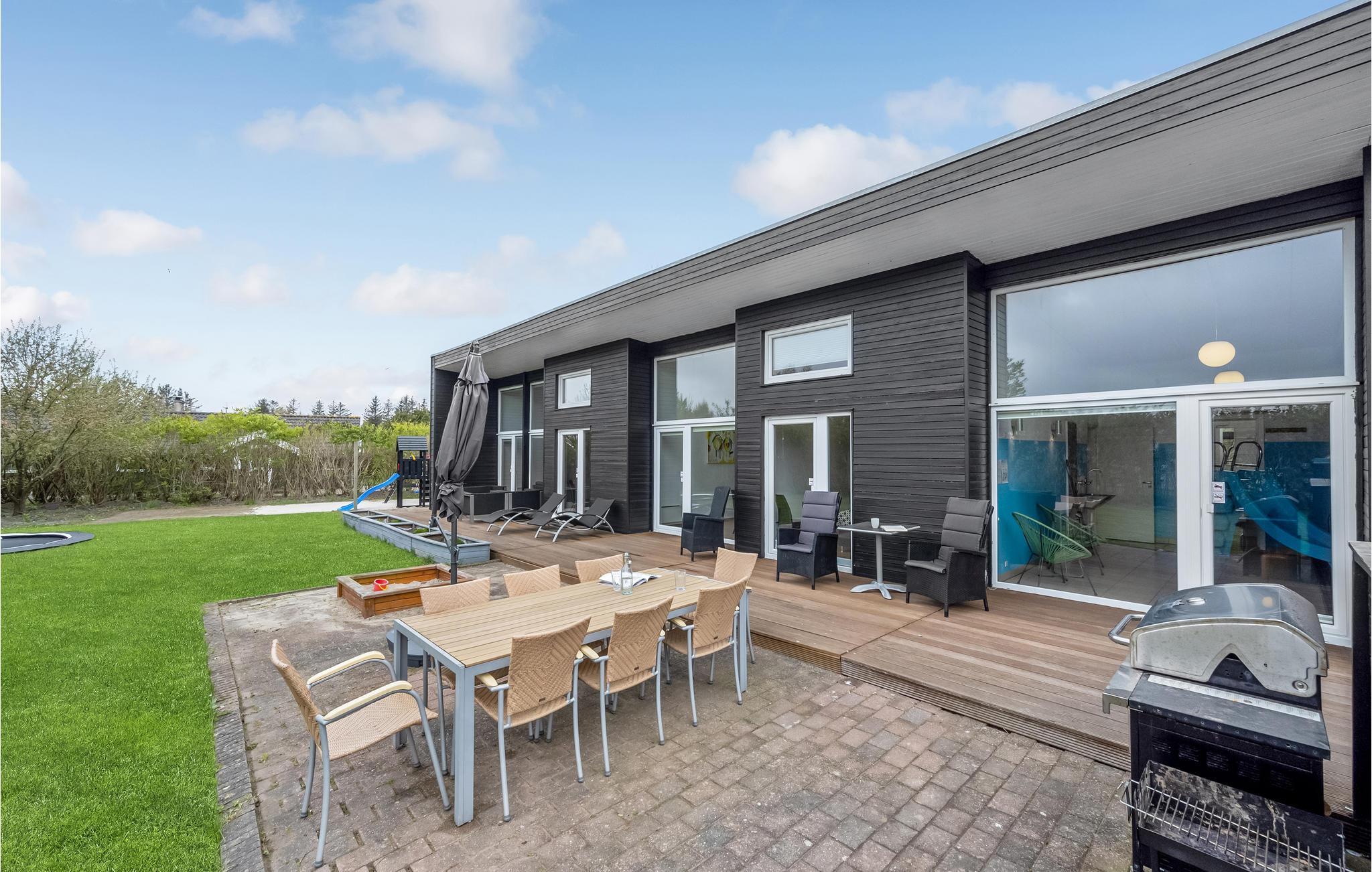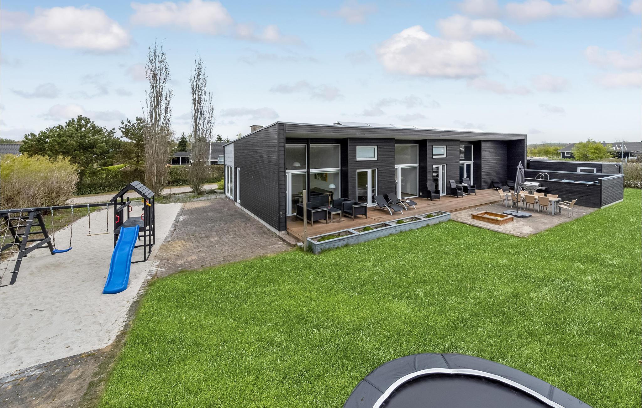 Unikt hus med pool bygget i en flot, arkitektonisk stil og indeholdende alt hvad I skal bruge på ferien. Poolen har svømmetræner og fra poolrummet er der udgang til den store udendørs 6 pers. standvandsspa. Den moderne byggestil gør, at alle værelser er meget rummelige og har højt til loftet. Begge badeværelser er gennemrenoverede. Det velindrettede køkken/alrum med brændeovn indeholder alt i hårde hvidevarer. Fra alle soveværelser samt stuen er der udgang til husets terrasser og på grunden er der petanquebane mm. I huset er der installeret flere varmepumper til billig opvarmning af pool, spa og badevand. Området er kendt for de gode surfmuligheder i Ringkøbing Fjord, den hyggelige og stemningsfyldte lystbådehavn samt den meget børnevenlige badestrand. Kort afstand til en put and take-sø.