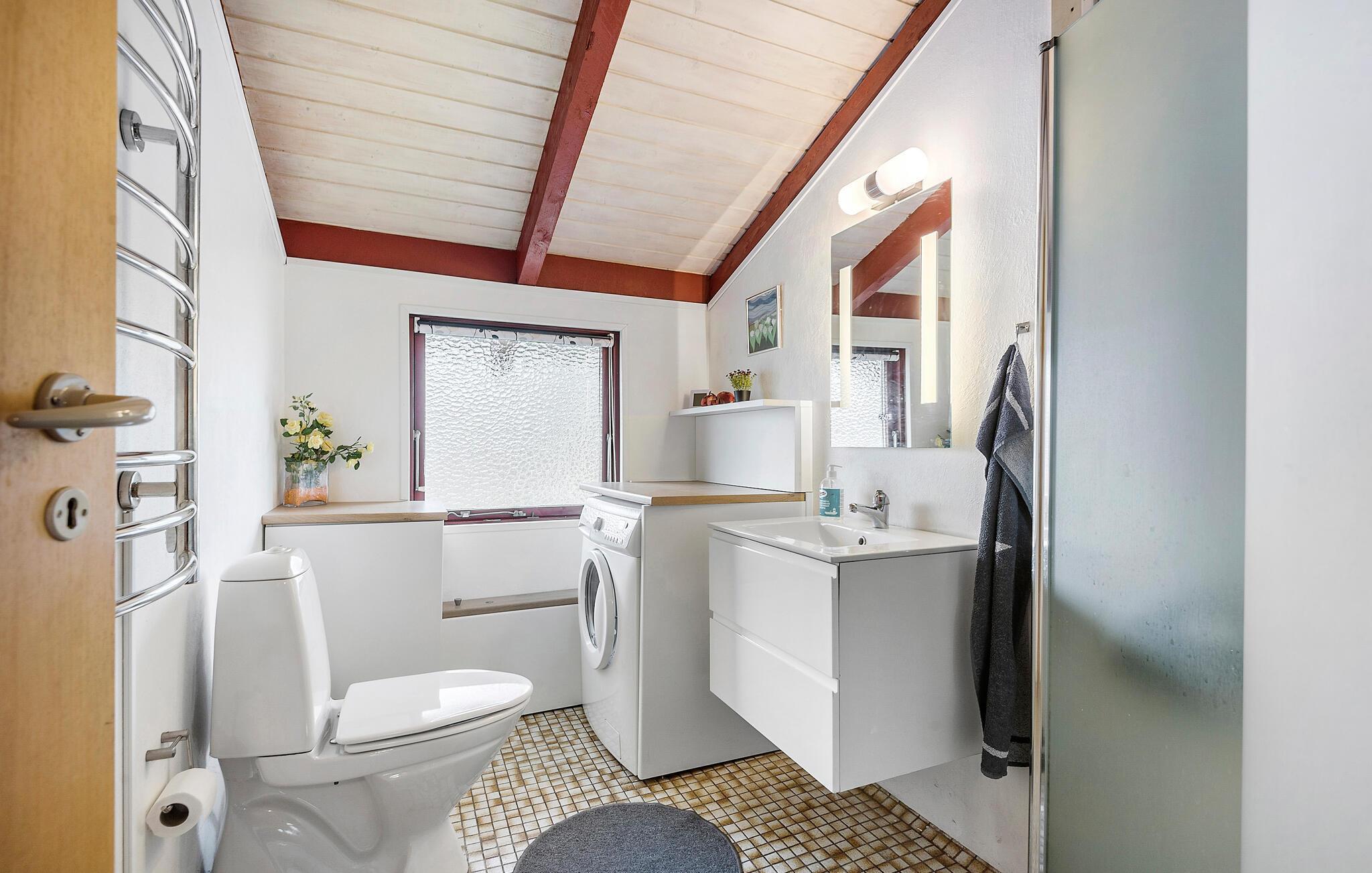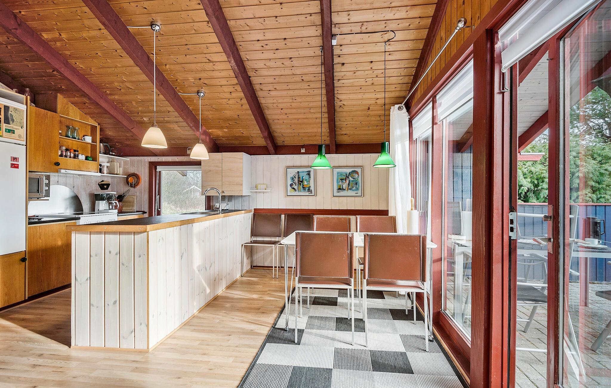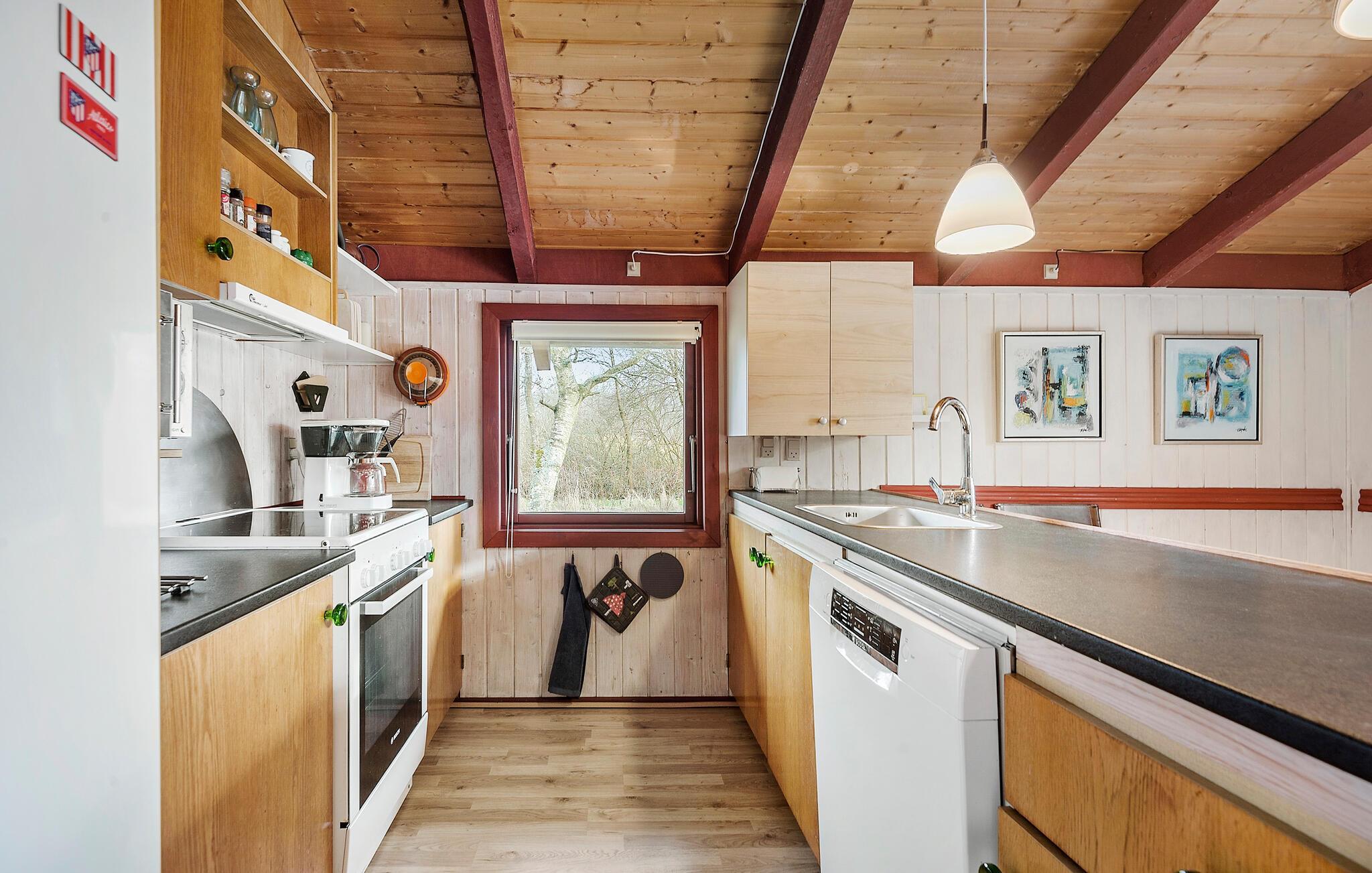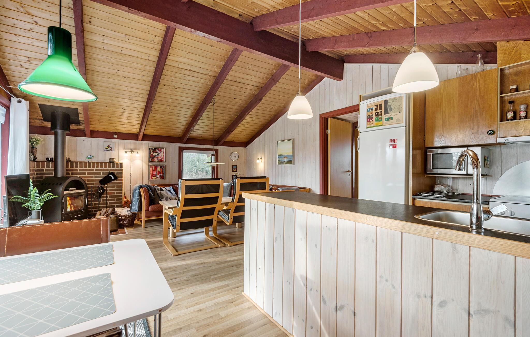 Dette charmerende hus ligger på en smukt beplantet naturgrund og emmer af autentisk sommerhusstemning. Her kan hele familien nyde nogle fredfyldte dage. Gør lækre ferieretter klar i det åbne køkken og sæt jer til rette ved spisebordet, hvor I har en dejlig udsigt gennem de store vinduespartier. Efter en lang dag på farten kan I slå jer ned i siddeområdet og snakke om dagens oplevelser, ??mens flammerne knitrer i brændeovnen.