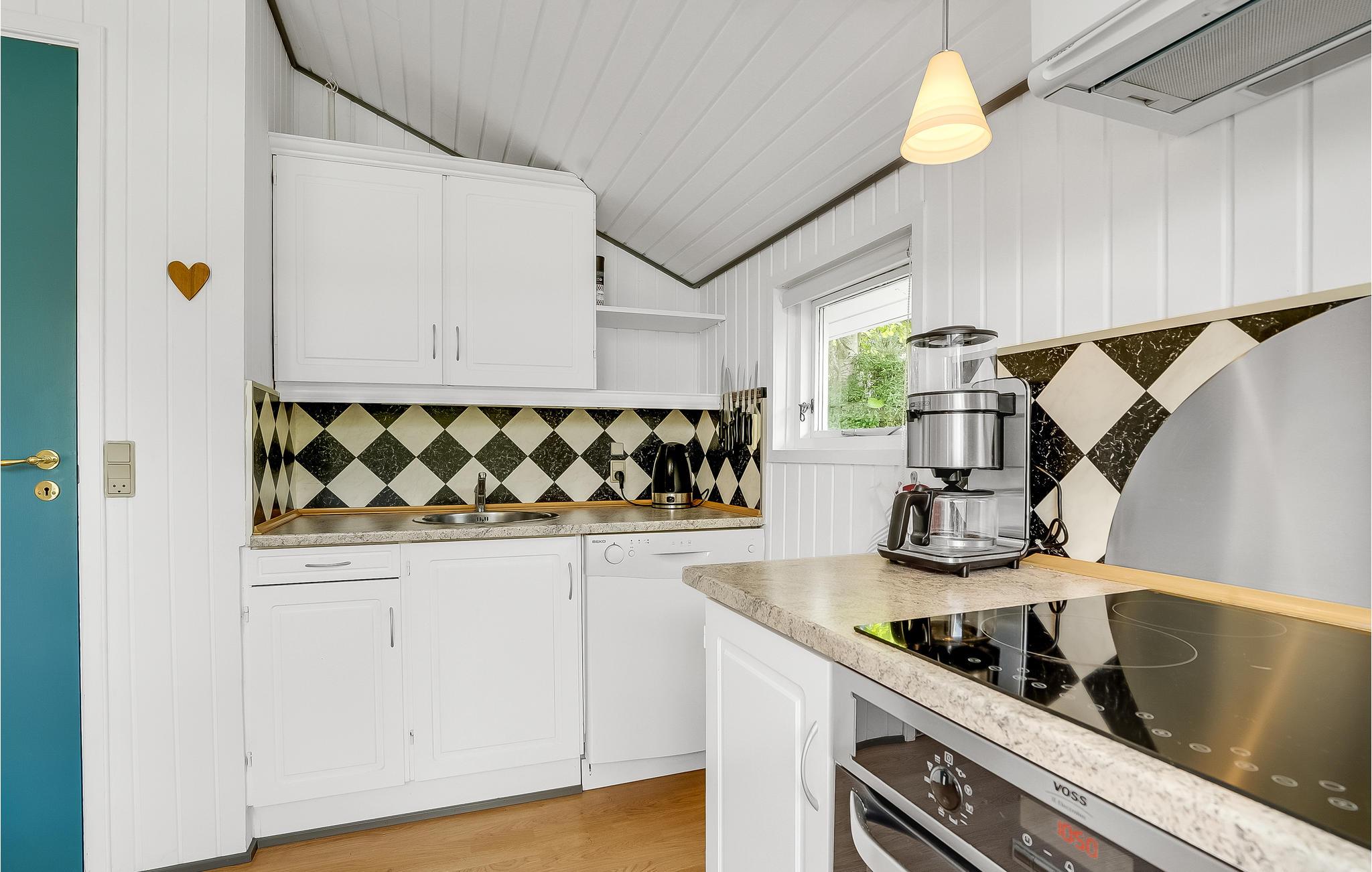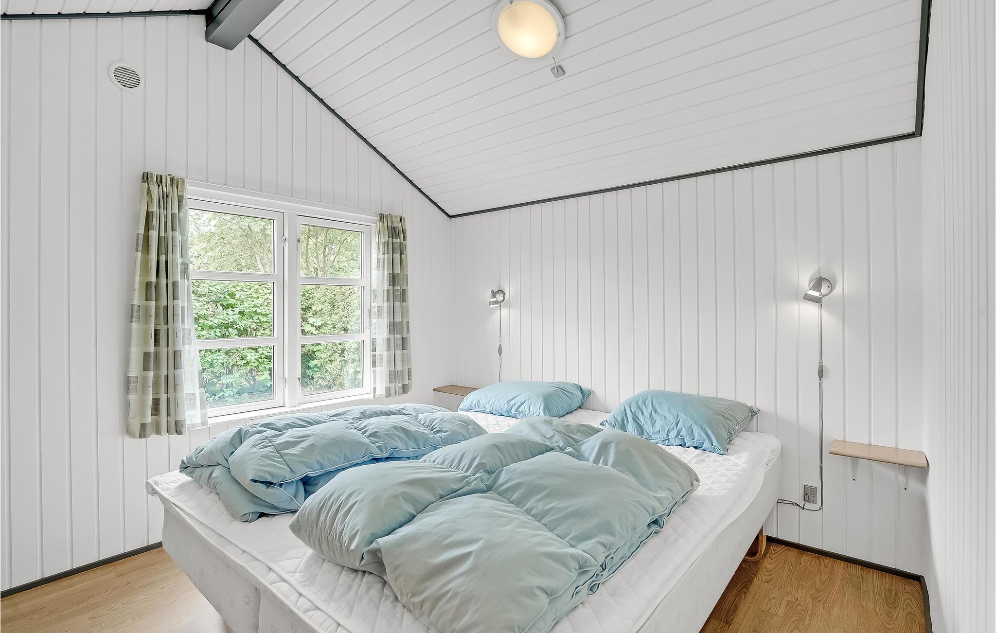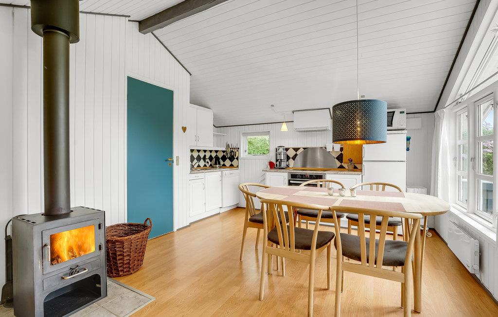 Sommerhuset er pænt møbleret, og et af dets højdepunkter er det åbne køkken og opholdsstuen, hvor I kan sidde ved brændeovnen eller se film. Der er også to soveværelser og et badeværelse.