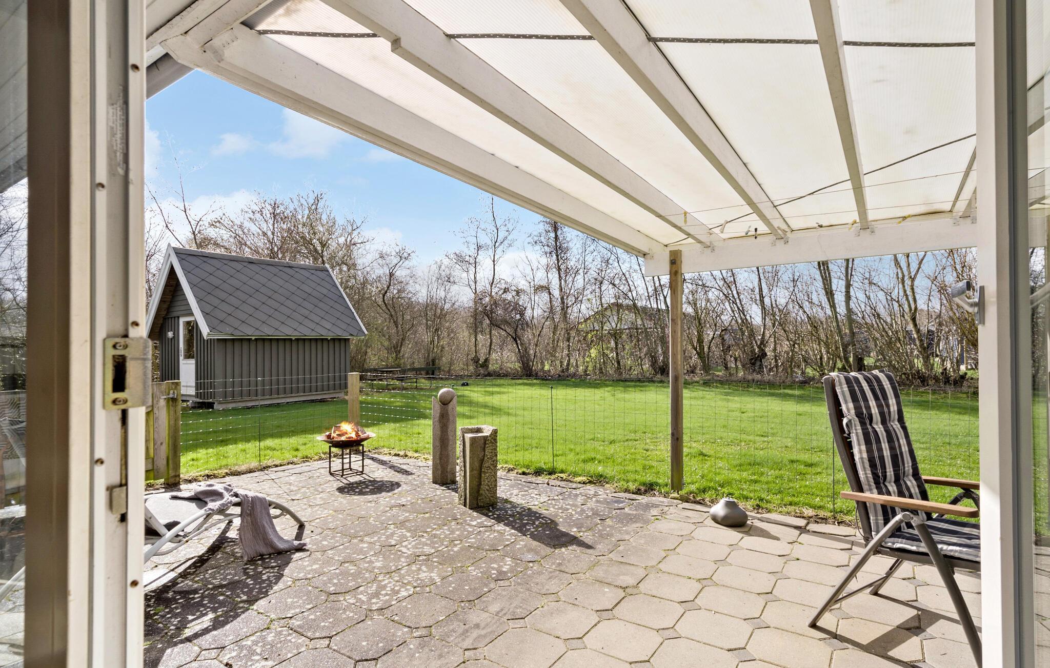 De to værelser har udgang til den store og delvist overdækkede terrasse, hvor I kan finde sol, skygge og læ efter behov i løbet af dagen, mens børnene løber rundt og spiller bold i haven.