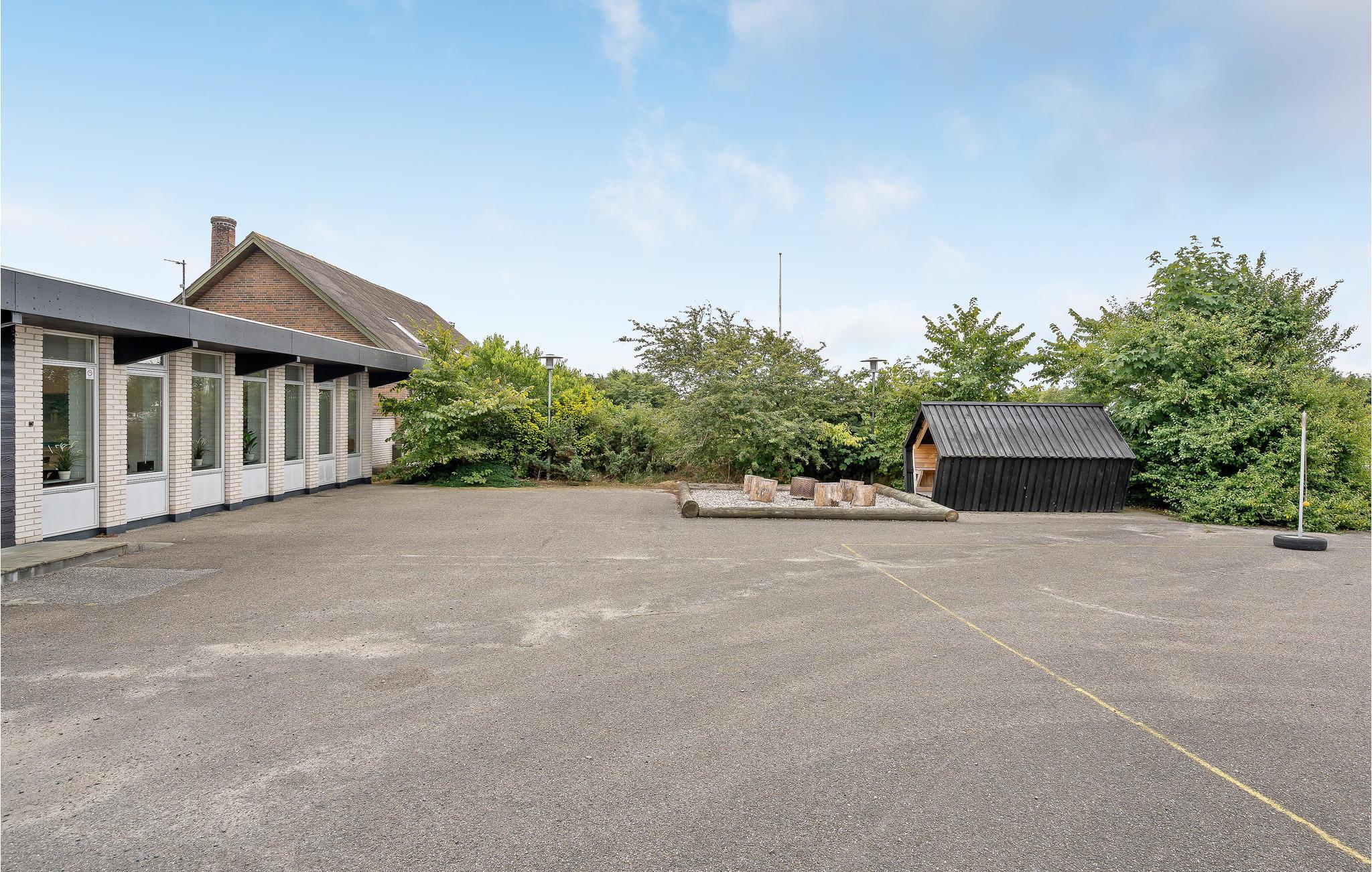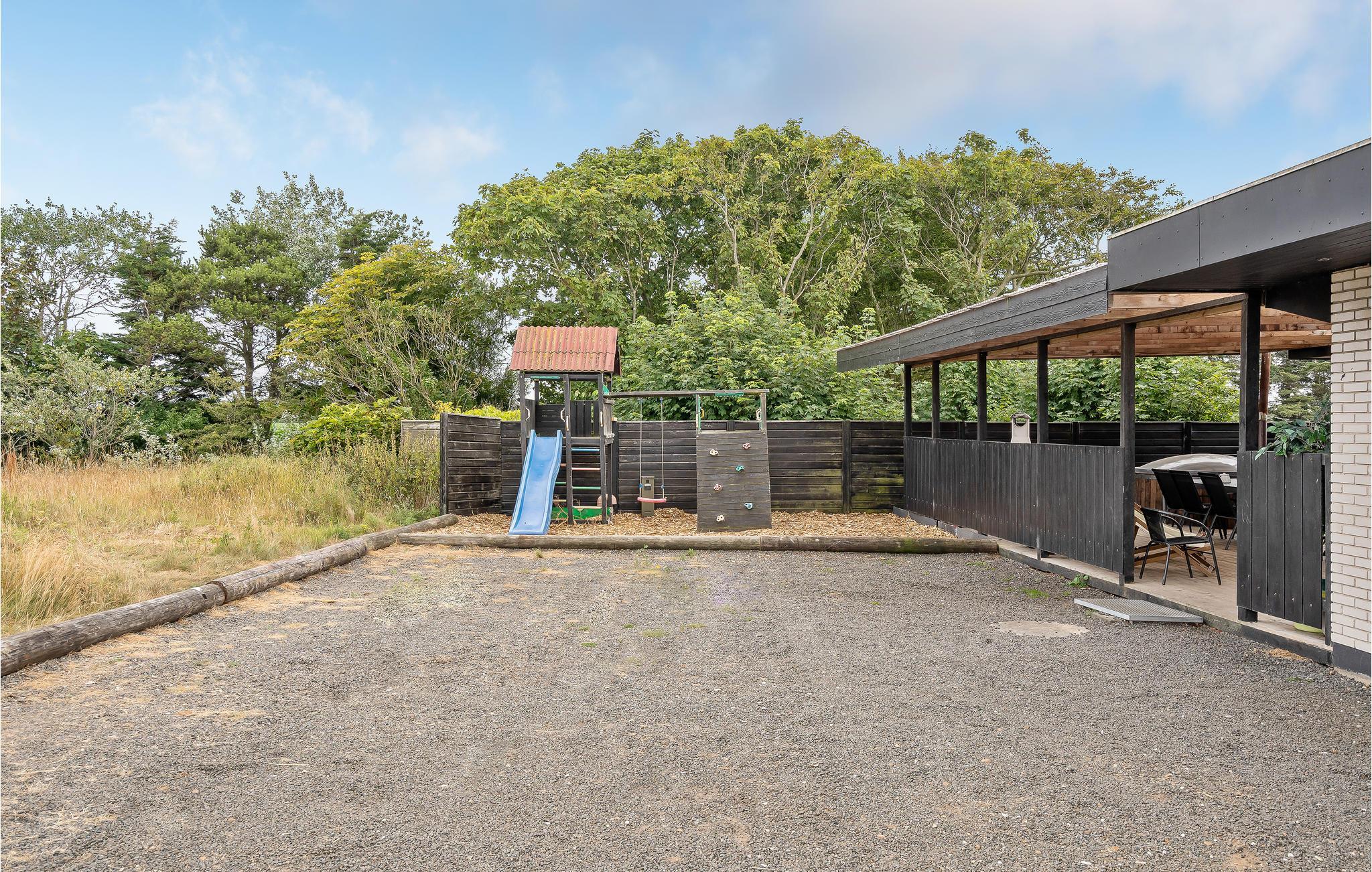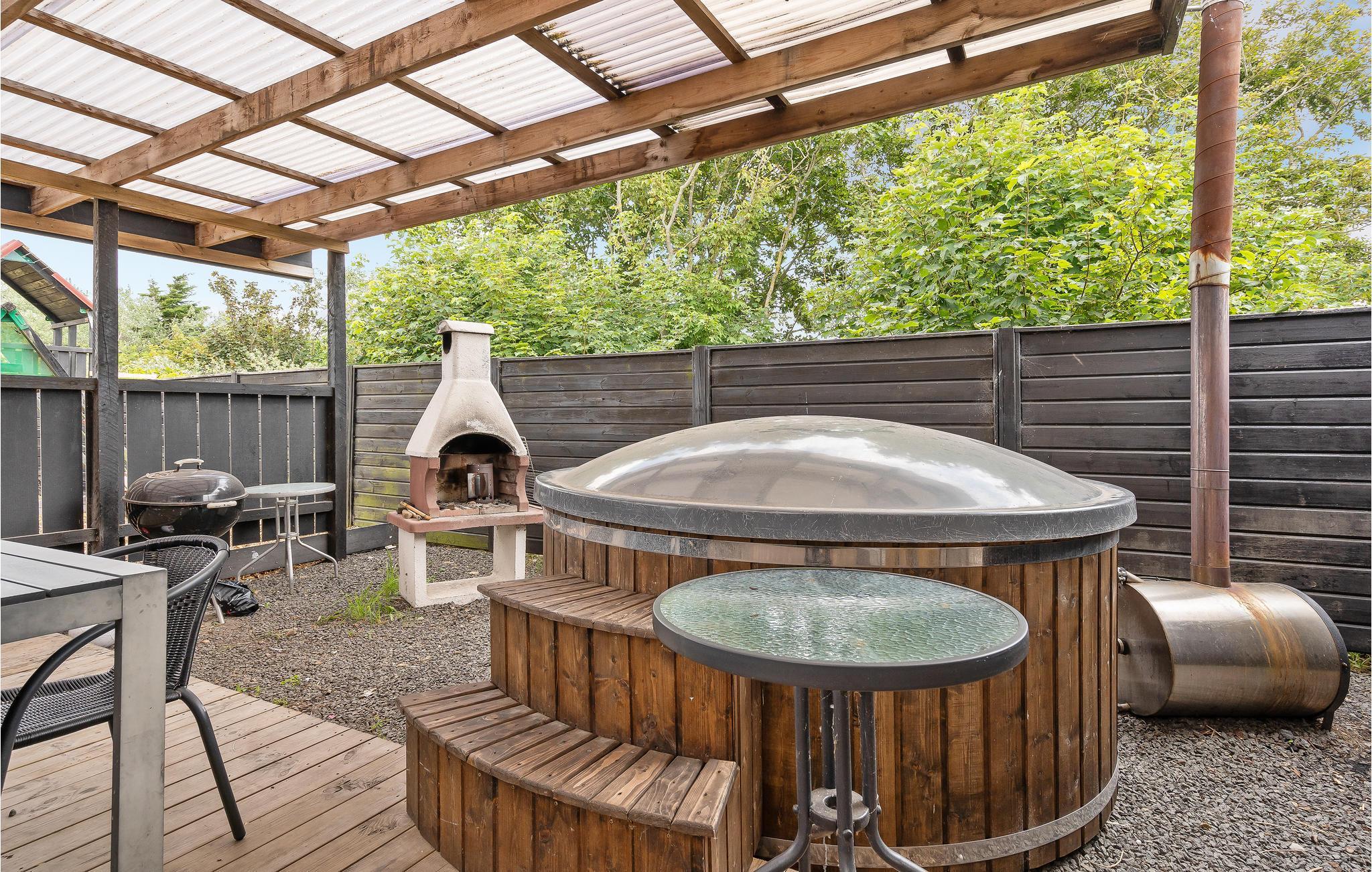 Træd ud på den overdækkede terrasse, der er møbleret med havemøbler, grill og liggestole. Læn jer godt tilbage i vildmarksbadet, som I selv kan varme op, og nyd den friske luft. Børnene vil elske den lille legeplads med rutsjebane og legetårn, mens de voksne kan slappe af i det hyggelige siddeområde eller ved grillen. Der er også et hyggeligt område med bålplads og hytte, hvor I kan samles i aftentimerne.