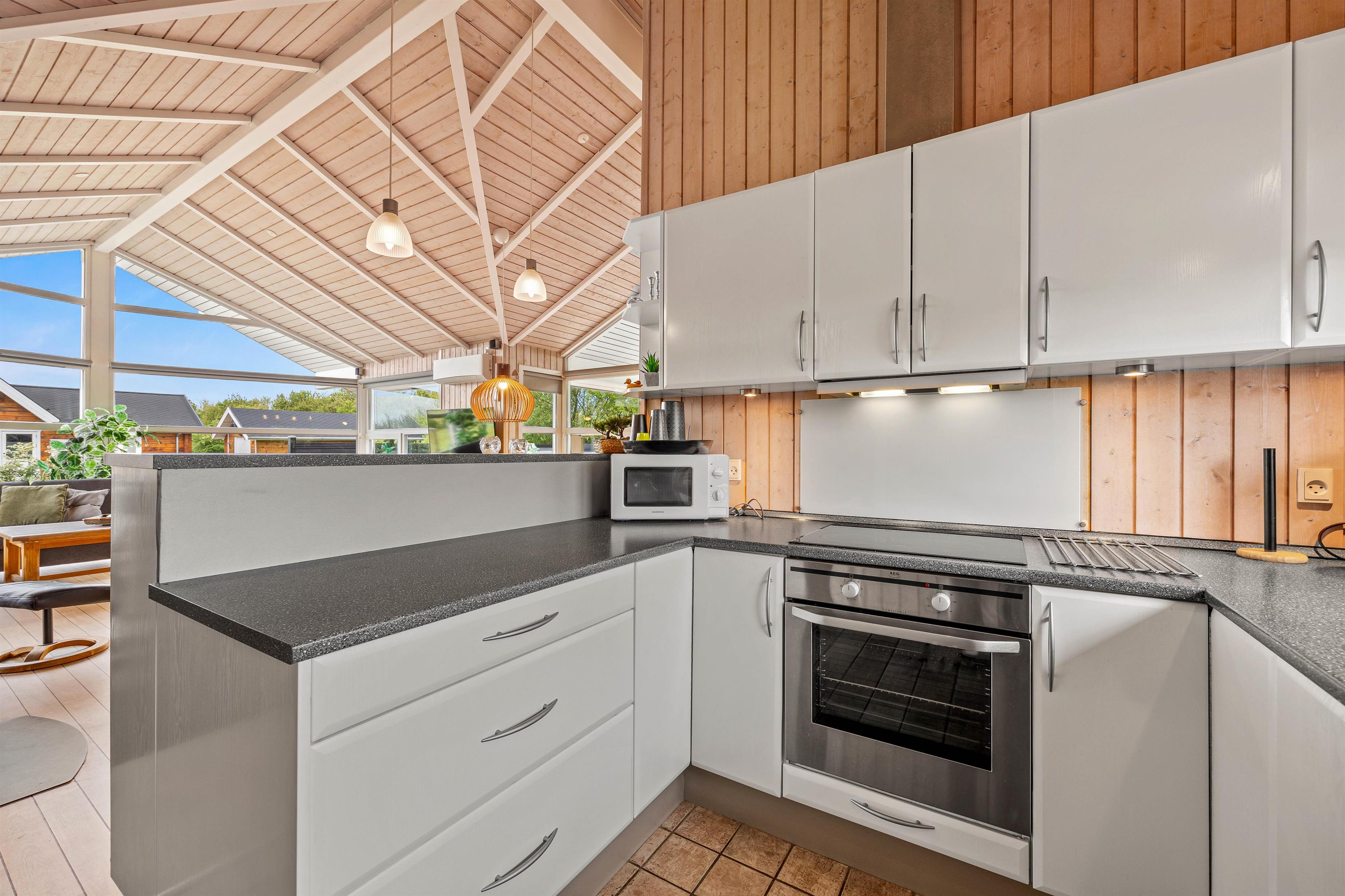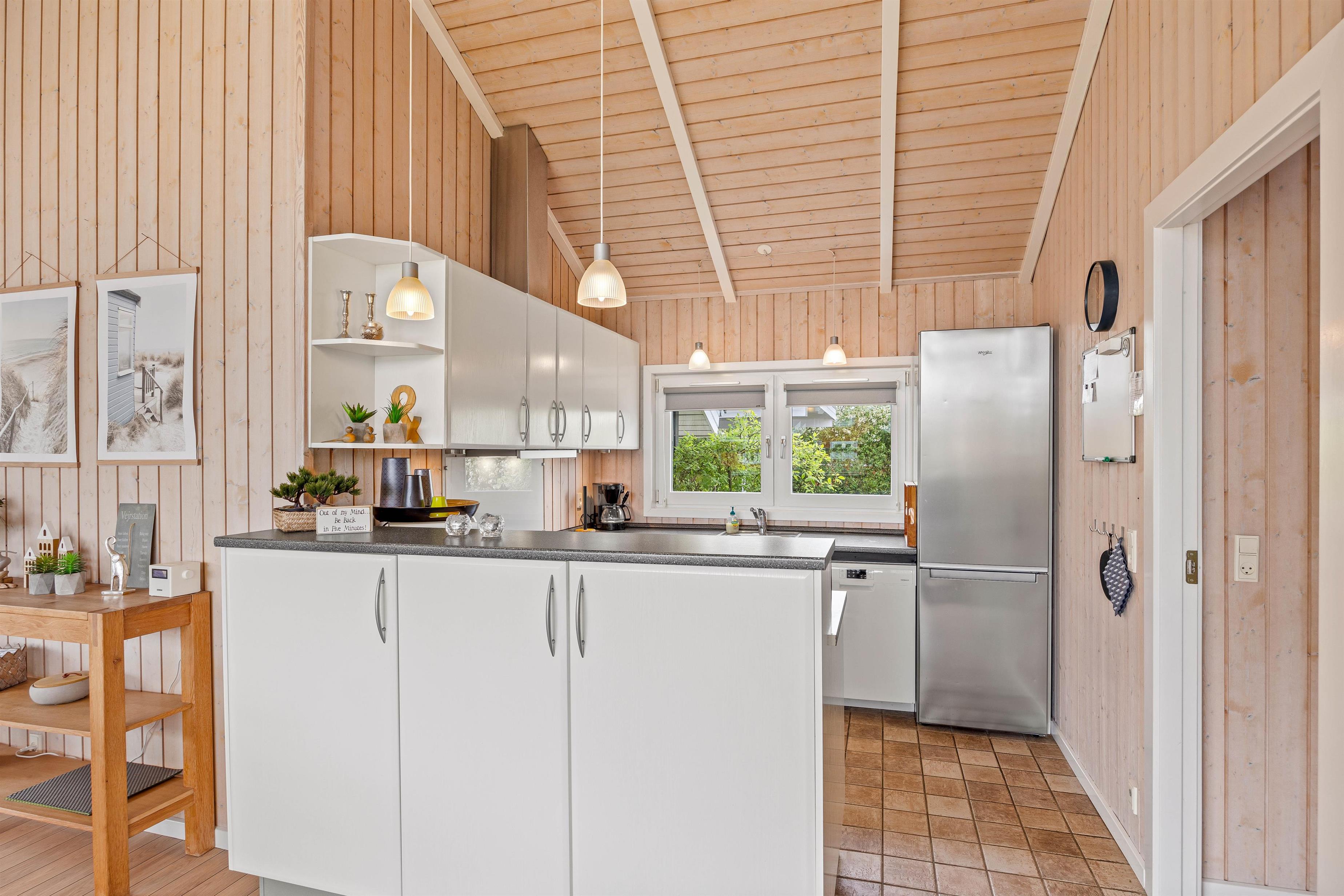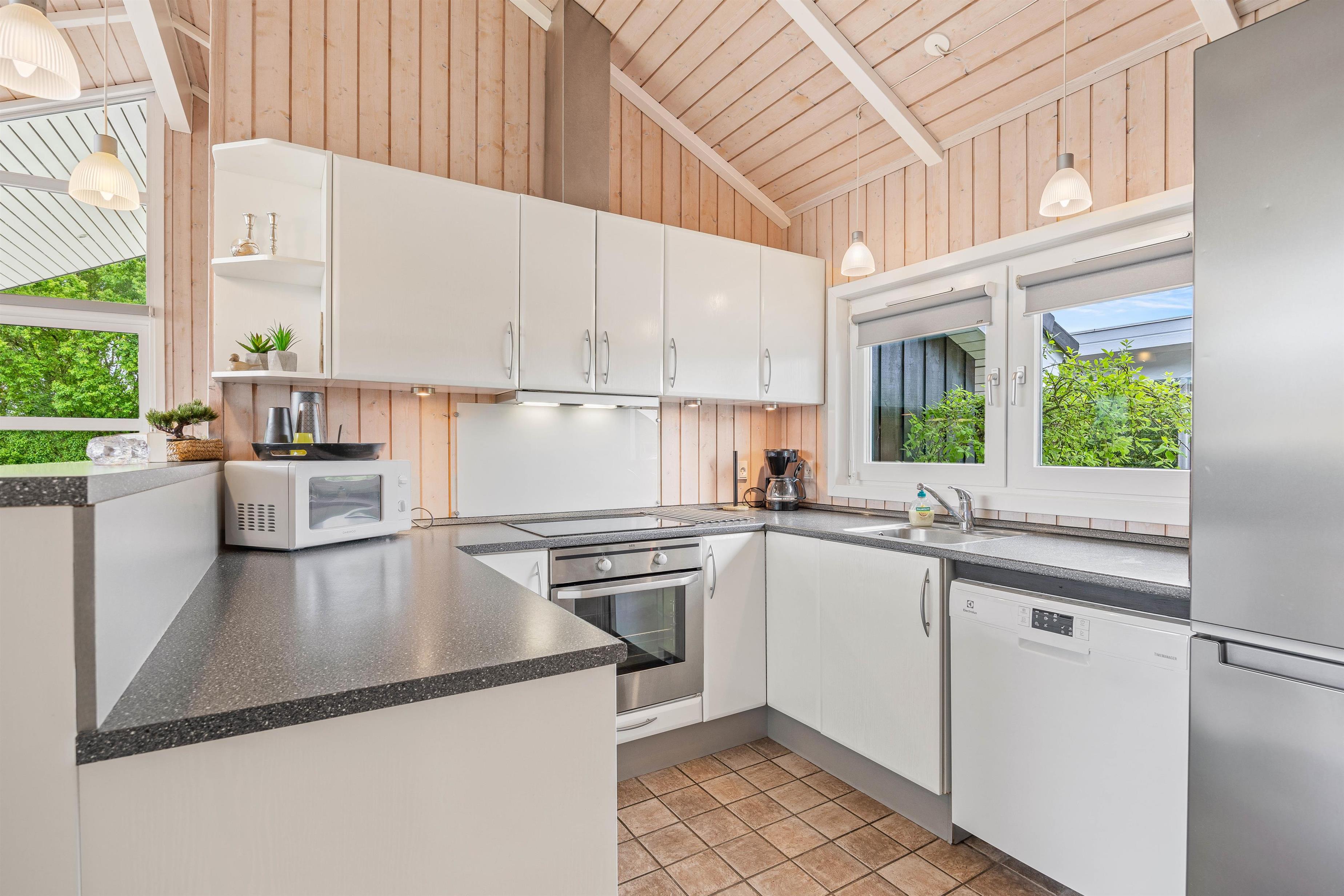 I det veludstyrede køkken står en opvaskemaskine klar til at lette opvasken efter måltiderne, så I kan bruge mere tid på at nyde ferien sammen.