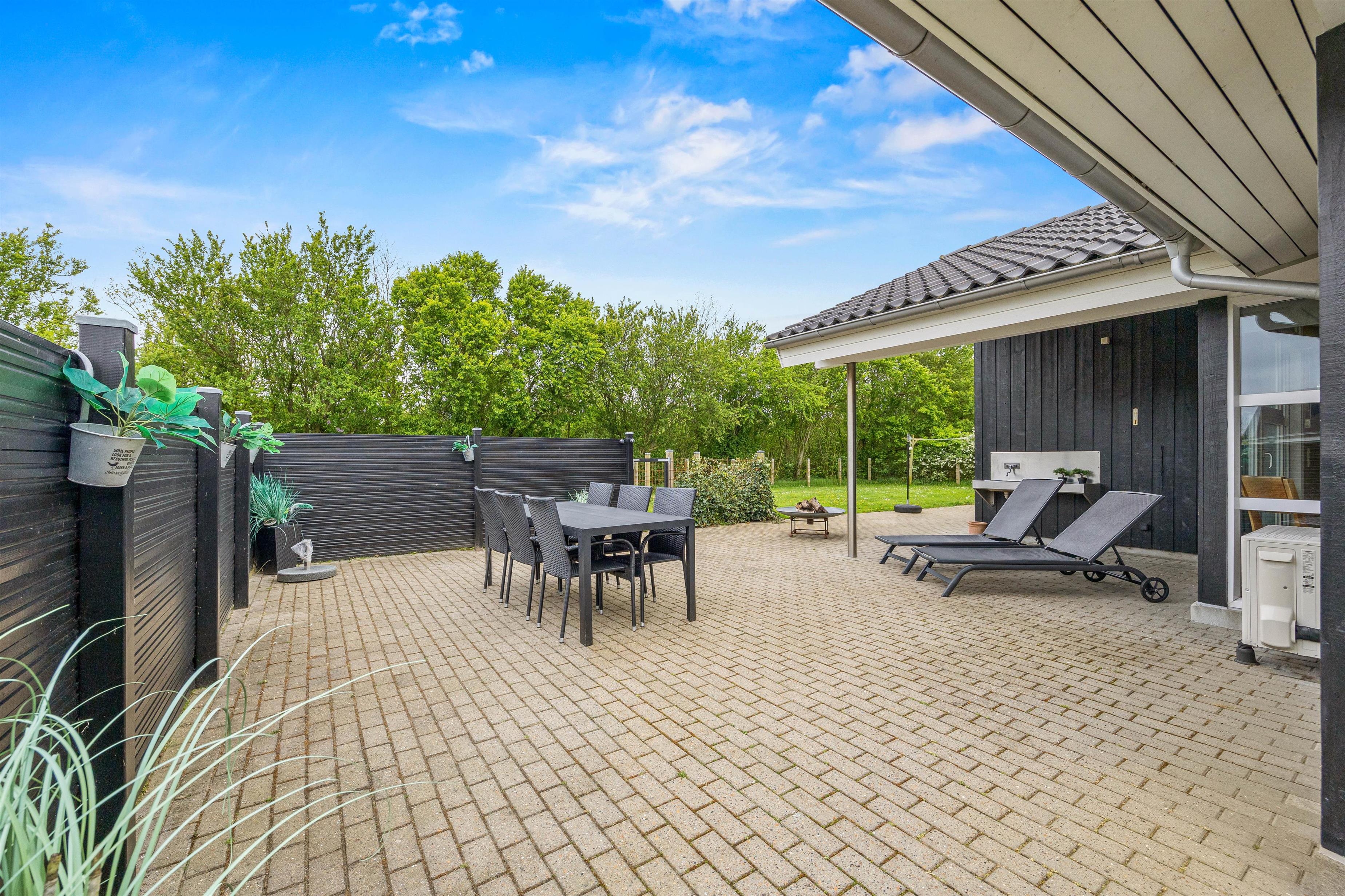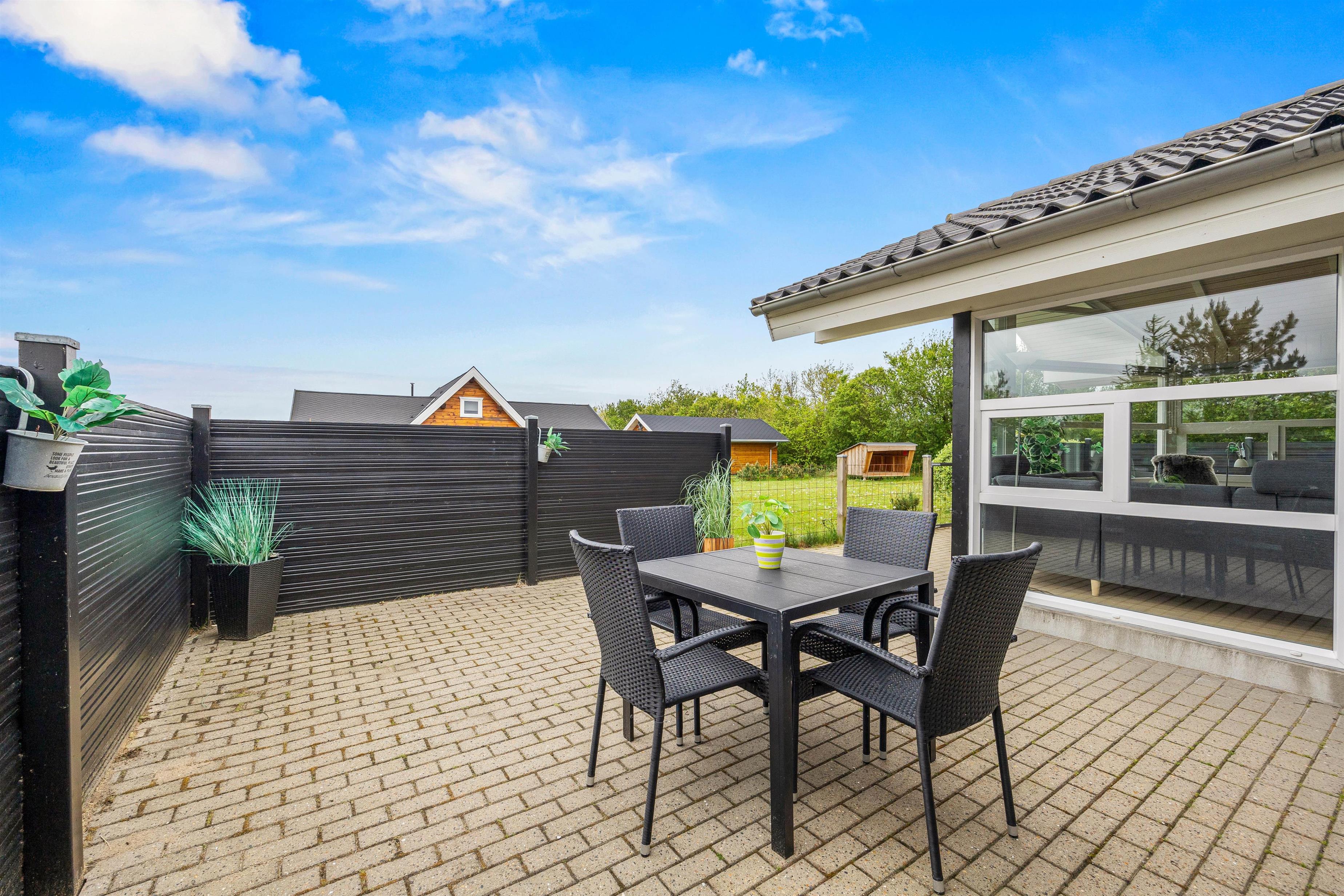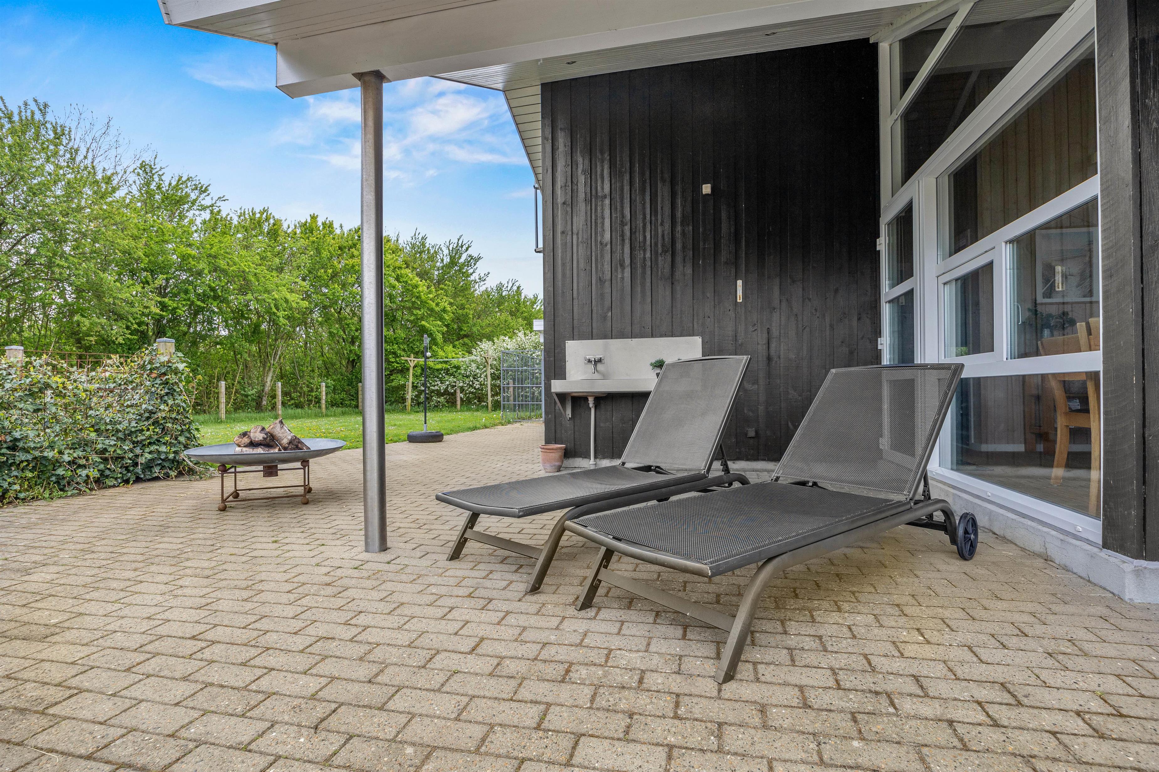 Udenfor kan I fra stuen træde ud på den hyggelige og afskærmede terrasse, der har alt, hvad I behøver for en perfekt ferieoplevelse. Der er en grill og behagelige havemøbler, så I kan nyde en dejlig aften under den åbne himmel. Og når solen skinner, er der solvogne og en parasol til rådighed for jer.