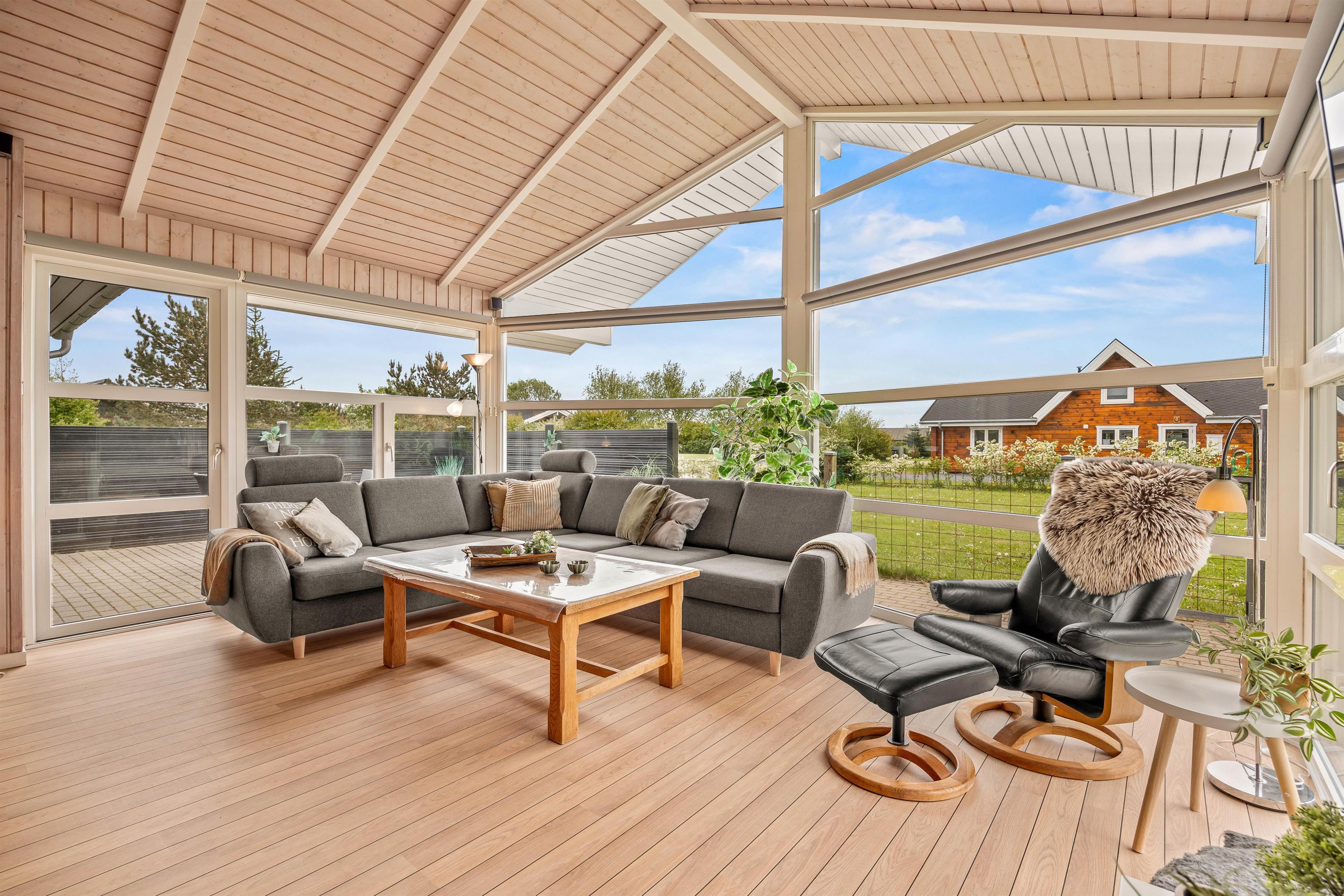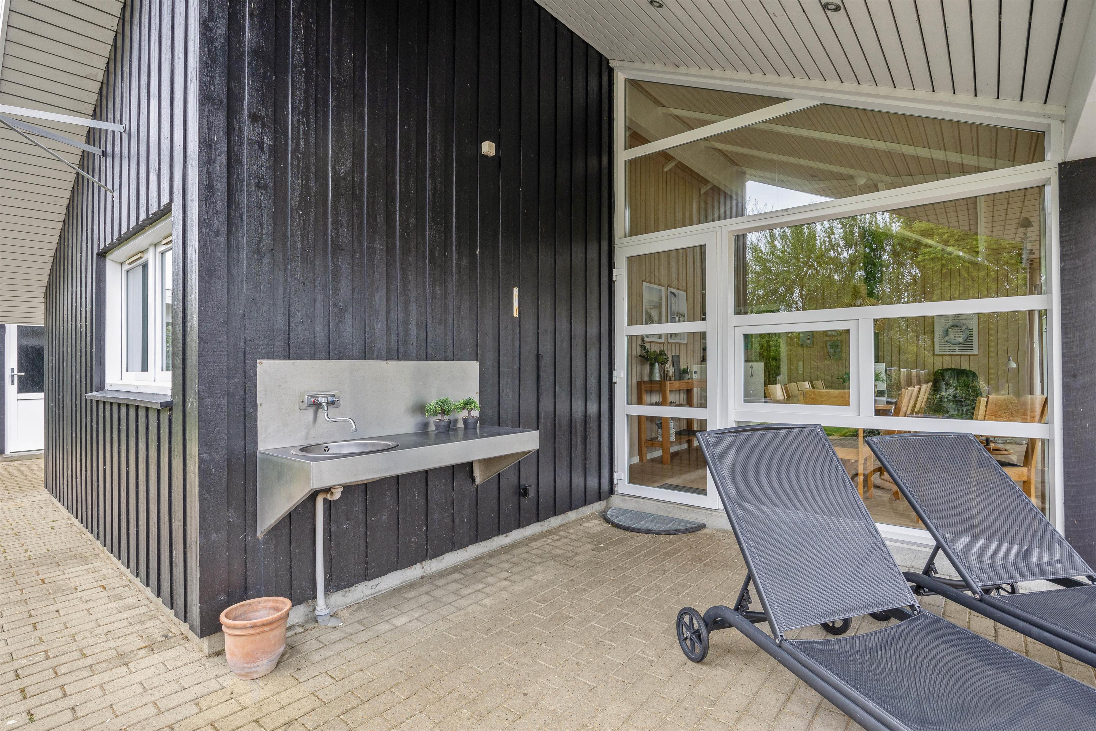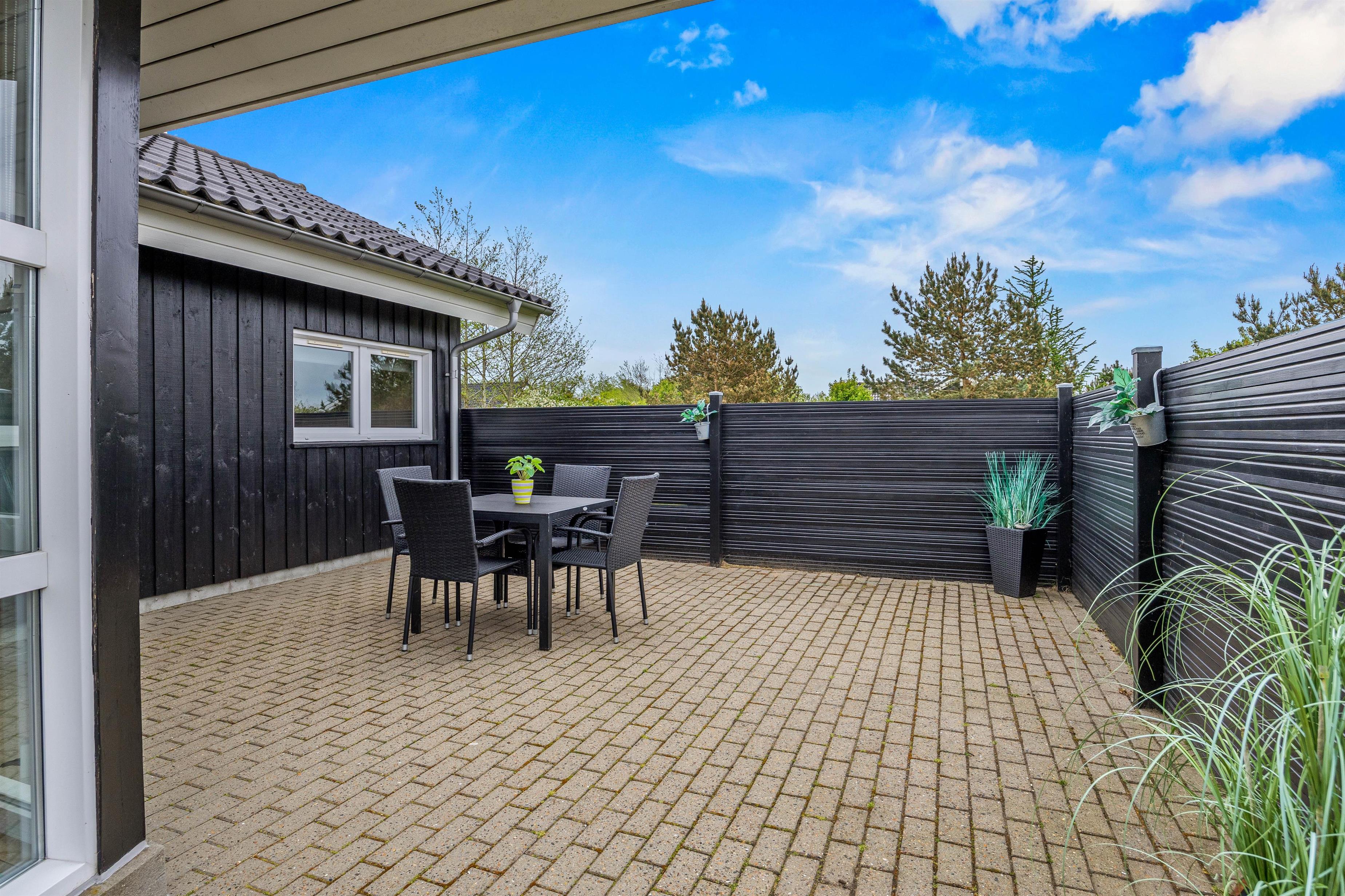 Udenfor kan I fra stuen træde ud på den hyggelige og afskærmede terrasse, der har alt, hvad I behøver for en perfekt ferieoplevelse. Der er en grill og behagelige havemøbler, så I kan nyde en dejlig aften under den åbne himmel. Og når solen skinner, er der solvogne og en parasol til rådighed for jer.
