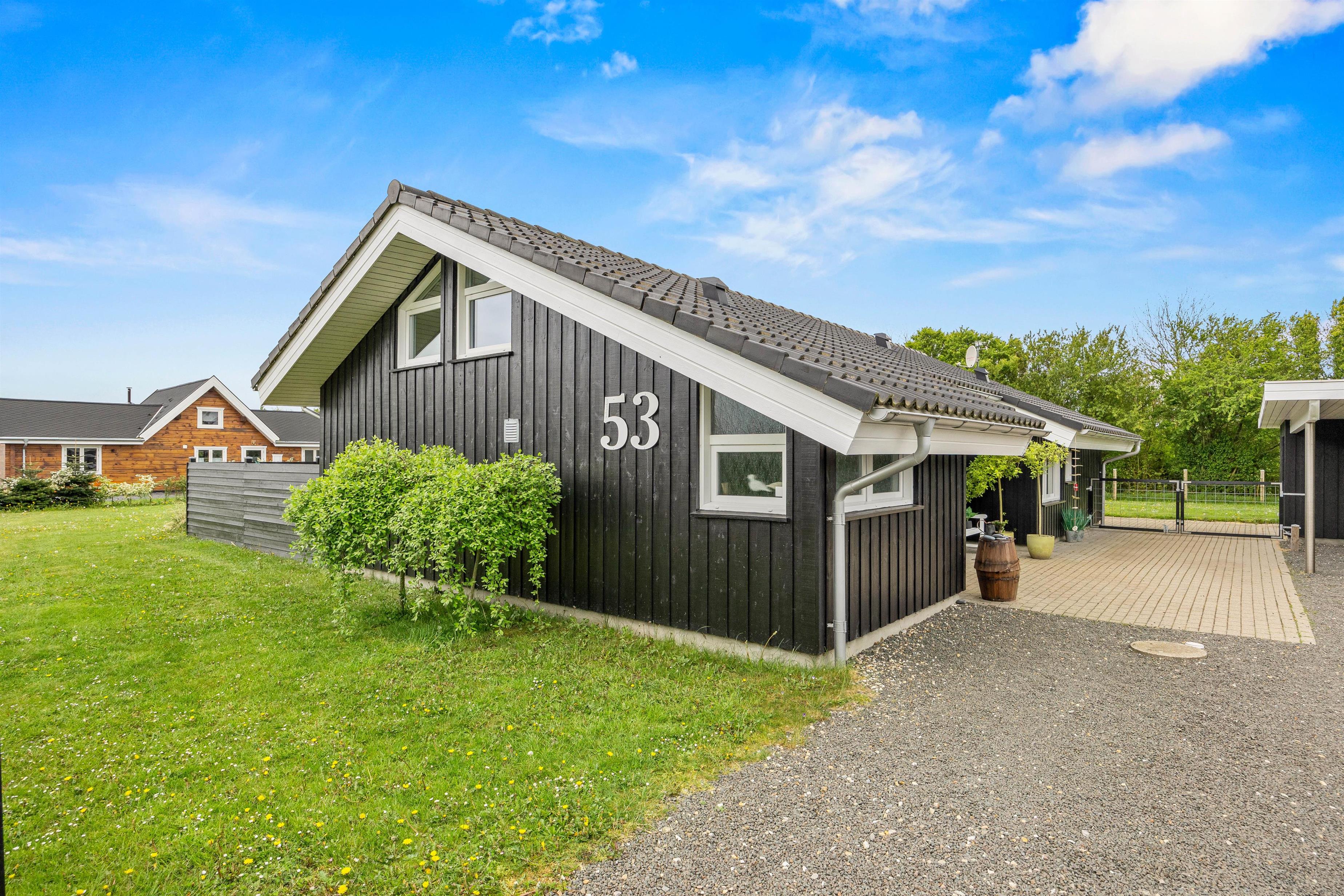 Til bilen er der en praktisk carport, der giver beskyttelse mod forskellige vejrforhold.