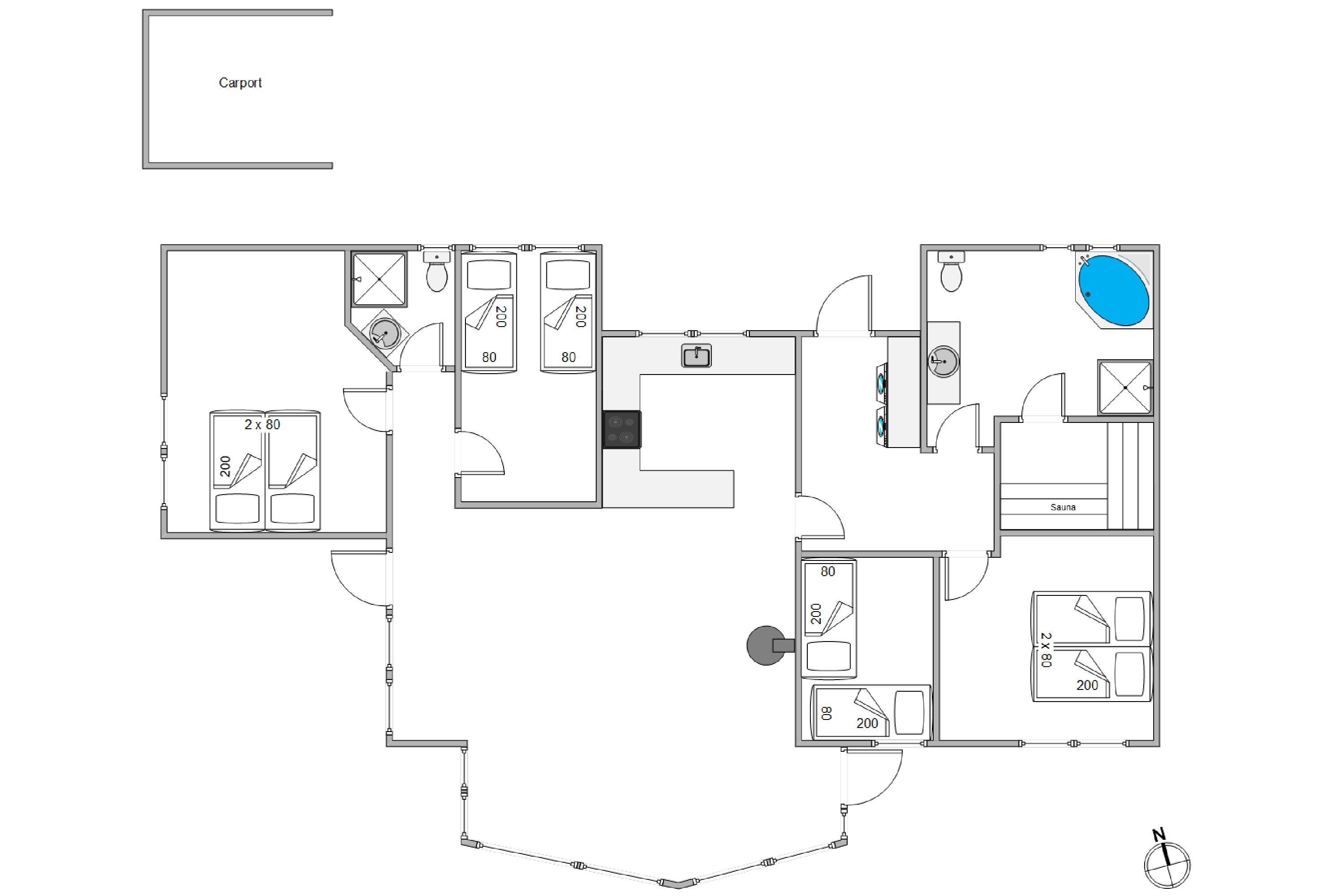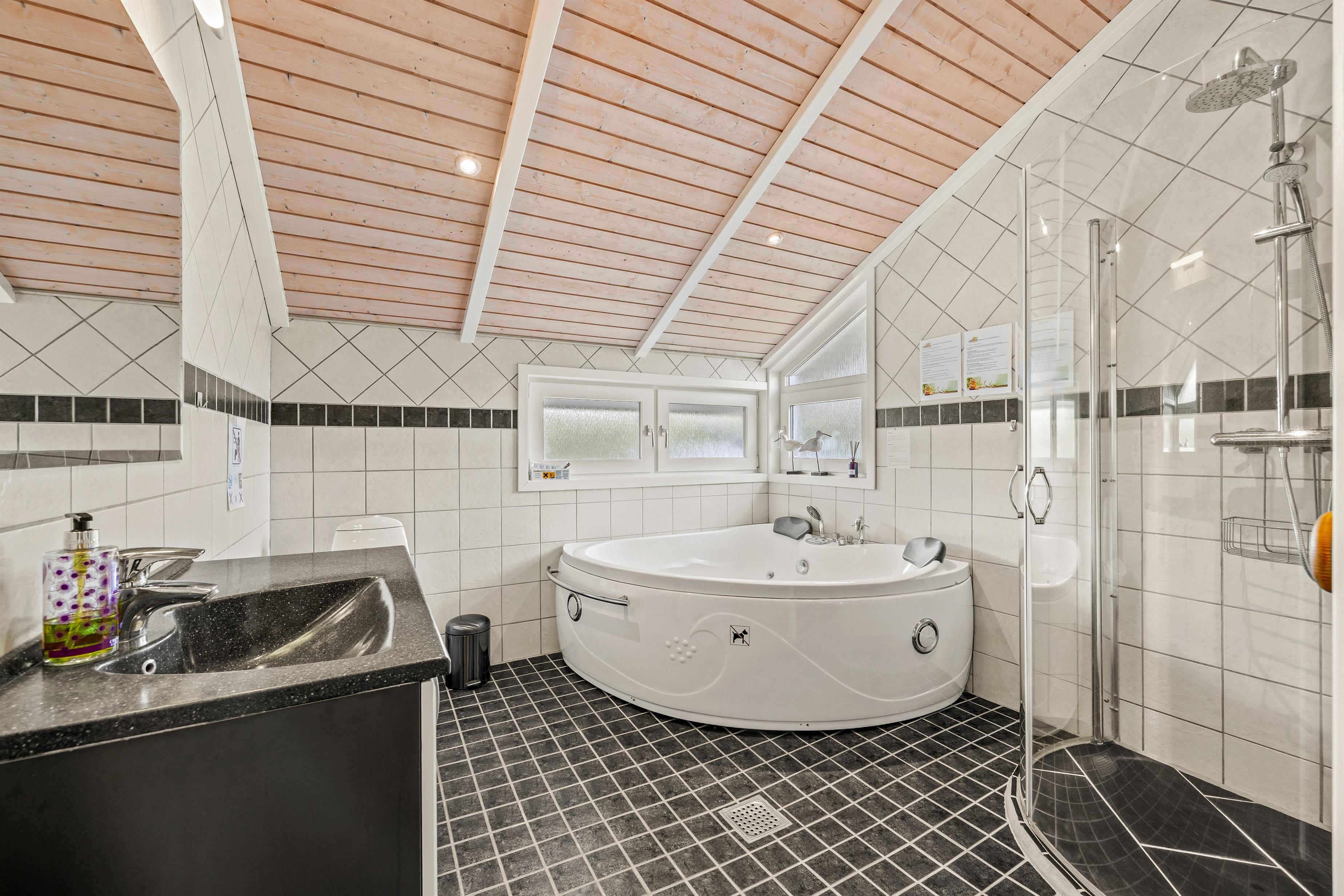 Badeværelserne er også godt udstyret, begge med gulvvarme for ekstra komfort. Det ene badeværelse byder endda på både tømmespa og sauna, hvilket giver jer mulighed for at forkæle jer selv og slappe af efter en dag med aktiviteter i Bork Havn.