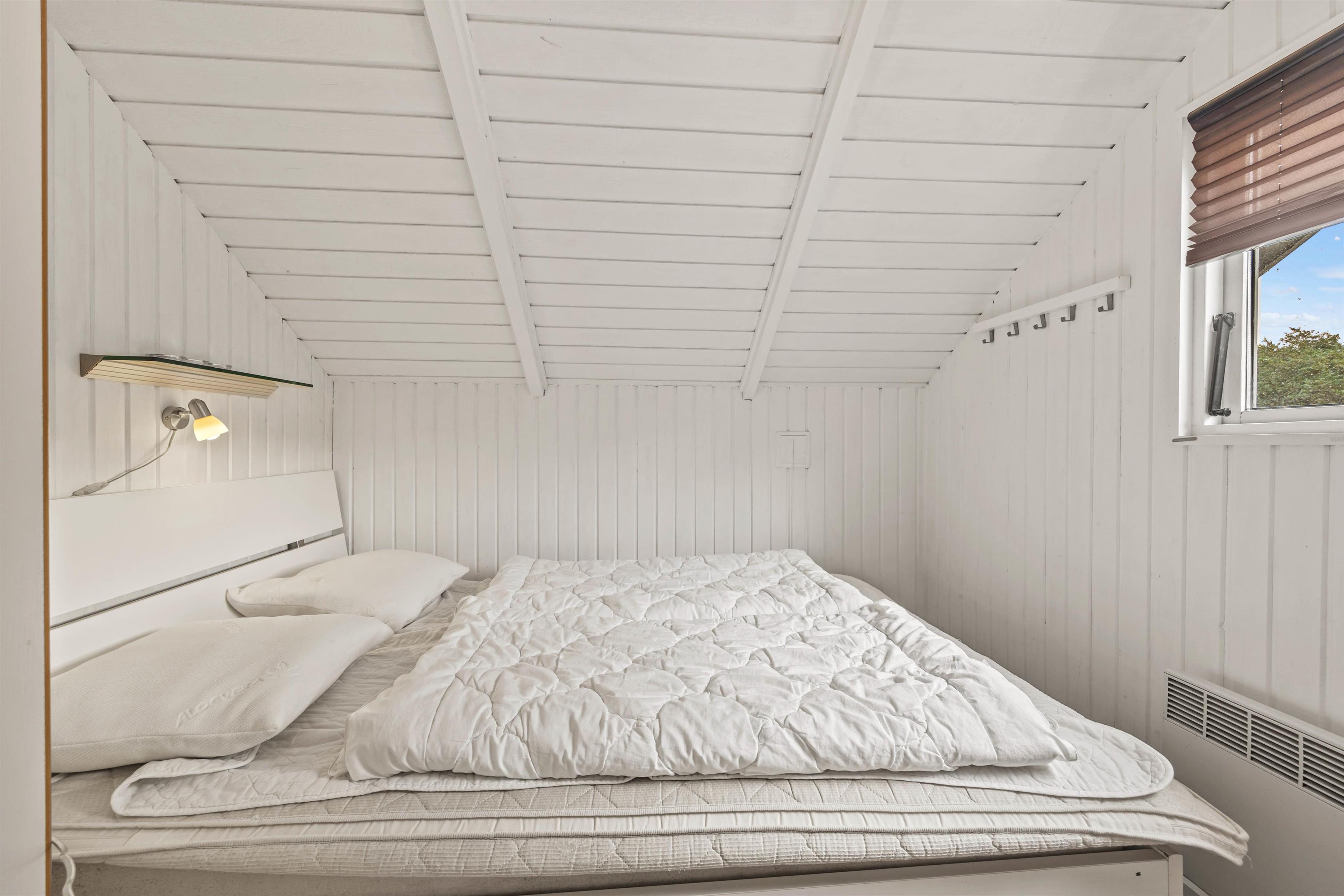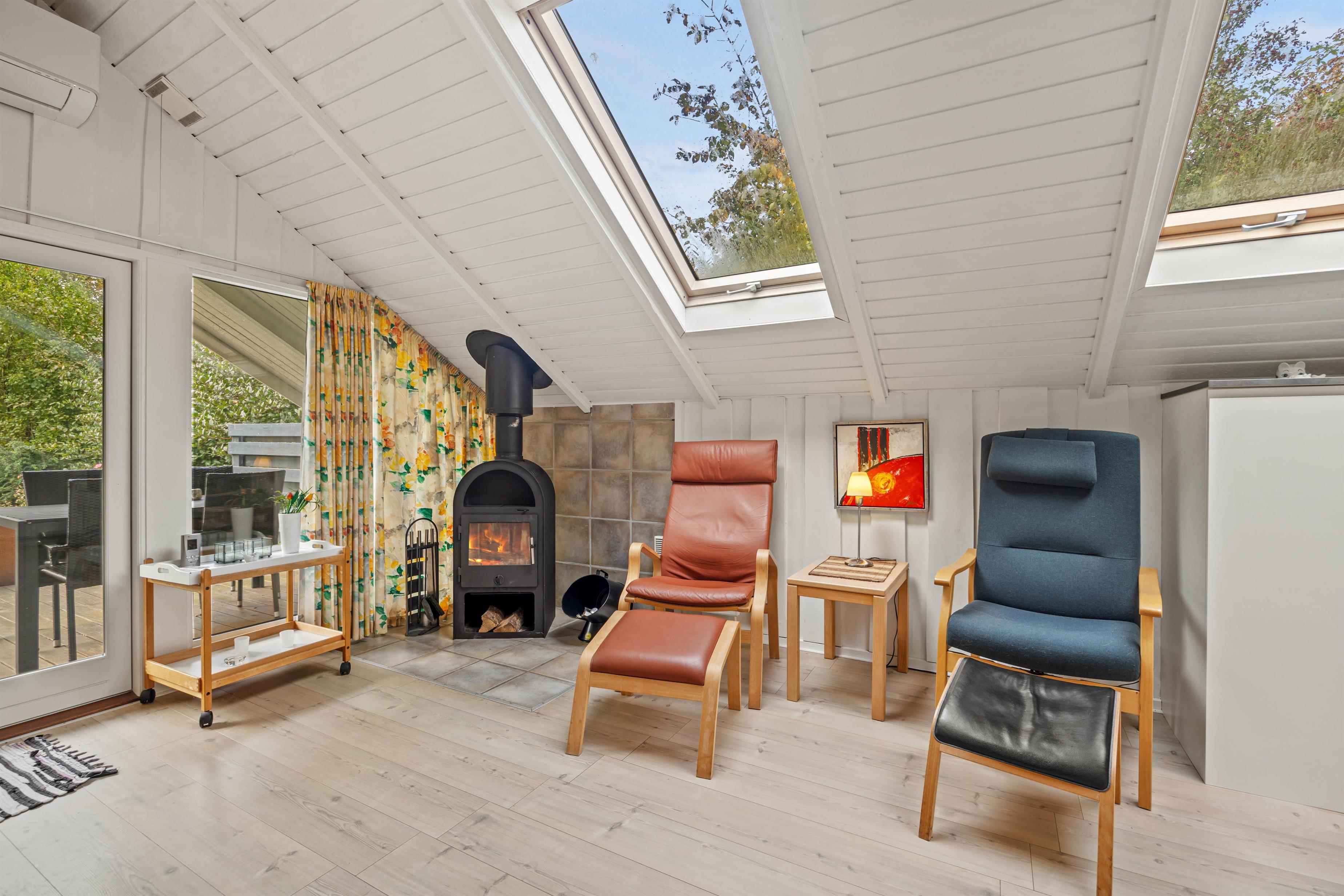 Ferieboligen er indrettet med lyse lofter og gulve samt de karakteristiske skråvægge under taget, som giver en autentisk sommerhusstemning. Indretningen er funktionel, med fokus på hygge. I centrum af huset ligger opholdsrummet, hvor vinduerne lukker naturligt lys ind. Her finder I en sofa, oplagt til afslapning foran fjernsynet eller en god bog, og selvfølgelig brændeovnen, der giver varme og ekstra hygge.