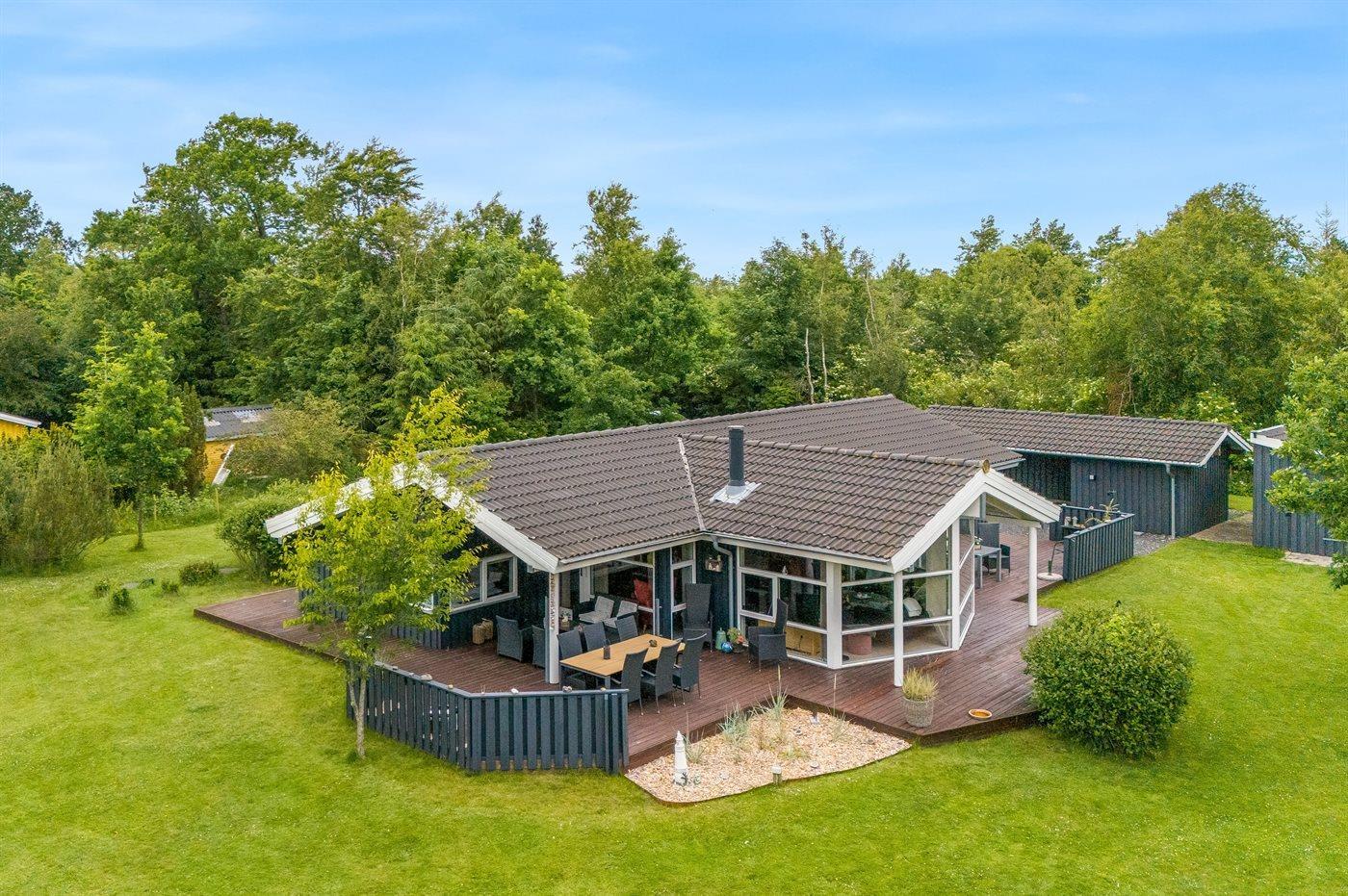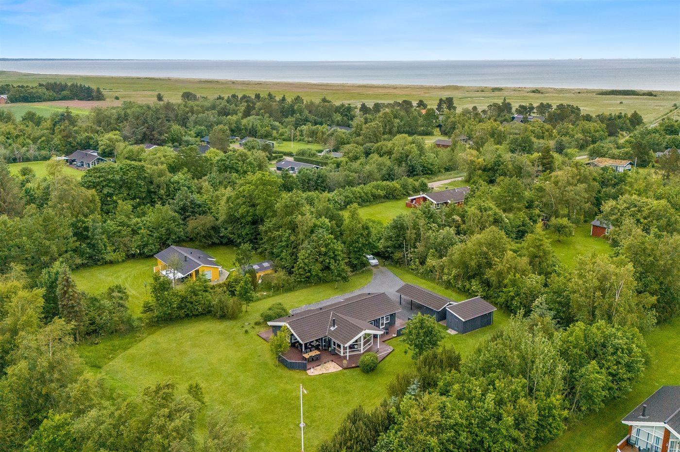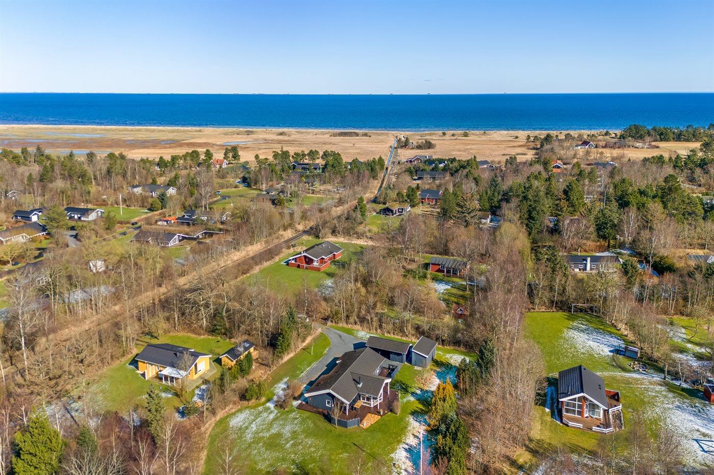 Ferieboligen er beliggende på en 2500 m² stor naturgrund. Grunden er indhegnet. Der er 550 m til havet. Der er en badebro i nærheden. Nærmeste forretning er beliggende i en afstand af 2000 m. Til ferieboligen hører åbent terrasseareal. Desuden er der overdækket terrasse. Der er redskabsrum. Der ligger en legeplads i en afstand af 2000 m. Der er carport til rådighed. Der er installeret stik til opladning af elbil. Type 2 stik. Parkering ved ferieboligen.