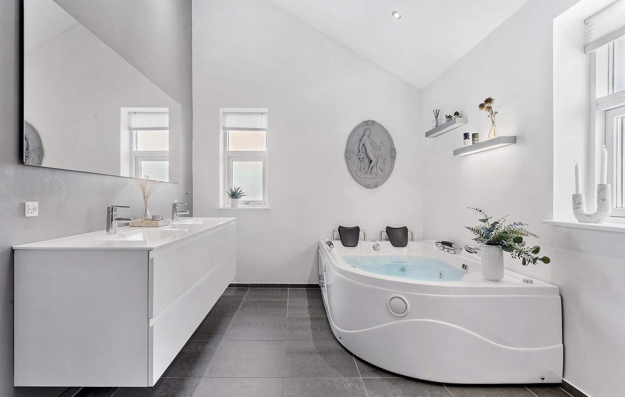 Velkommen til Bratten Strand, hvor dette vidunderlige hus danner rammen om nogle fremragende uger med familien. Huset er ganske rummeligt, og indretningen fremtræder særdeles flot med højt til loftet, materialer af høj kvalitet og lækre lysindfald gennem de store vinduespartier. Nyd godt af de moderne faciliteter i køkkenet og gør madlavningen til et sjovt fællesprojekt, inden der dækkes op til den store middag ved spisebordet. Og måske aftenen skal rundes af med en svedetur i saunaen eller en tur i boblebadet?