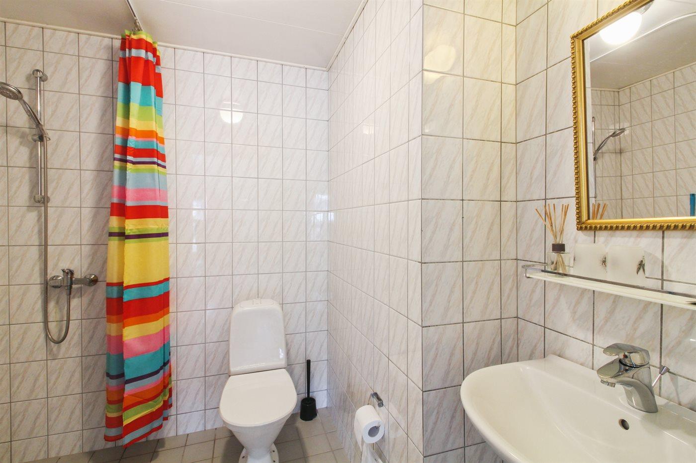 Der er 1 badeværelse med bruser og 1 toilet.