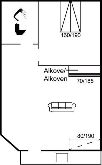 Der er i alt 1 soveværelse. Sovepladserne fordeler sig på: 2 sovepladser i dobbeltseng. 1 soveplads i sovesofa (enkelt). 2 sovepladser i alkove.