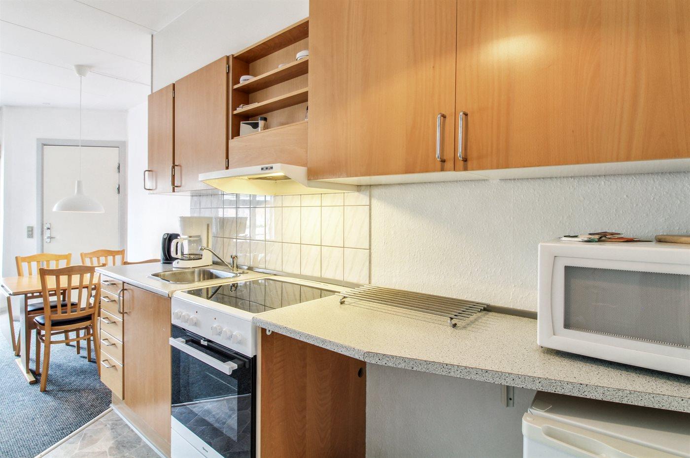 Køkkenet er udstyret med 1 køleskab. Der er 4 elkogeplader, bageovn, varmluftovn.