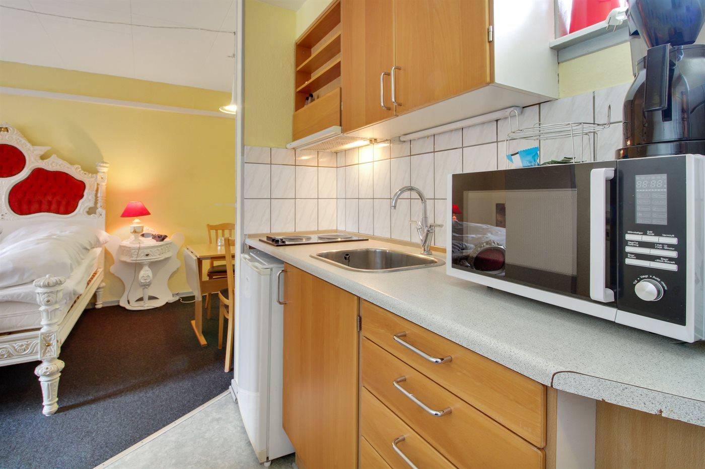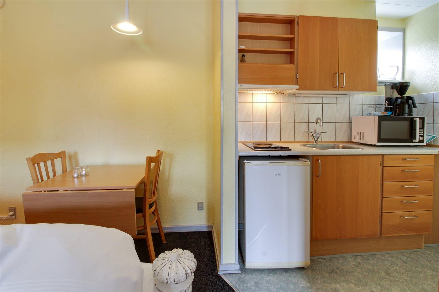 Køkkenet er udstyret med 1 køleskab. Der er 2 elkogeplader, mikrobølgeovn.