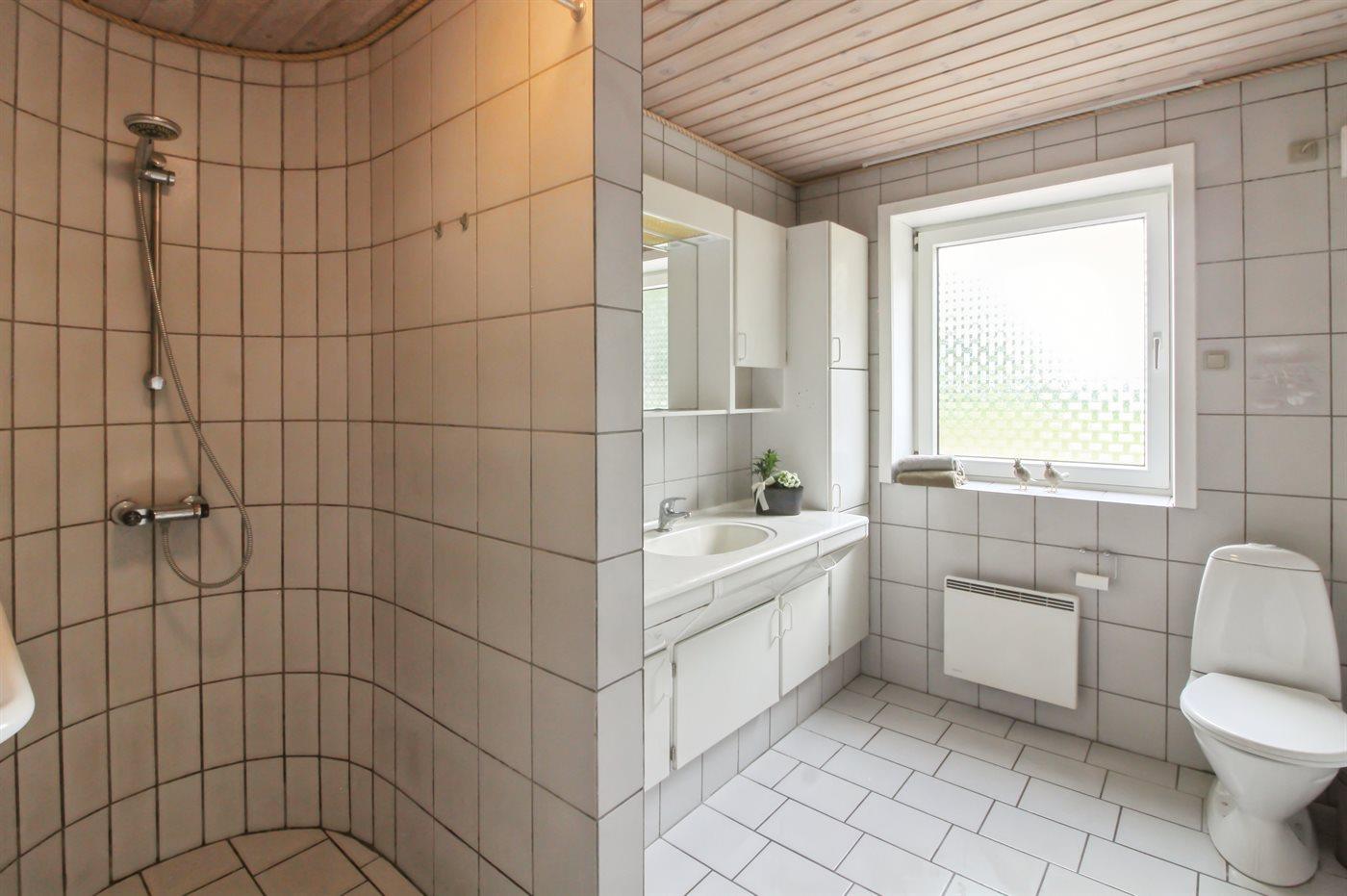 Der er 1 badeværelse med bruseniche og 2 toiletter, heraf 1 gæstetoilet. Der er gulvvarme på 1 badeværelse.