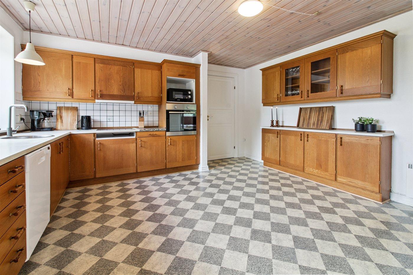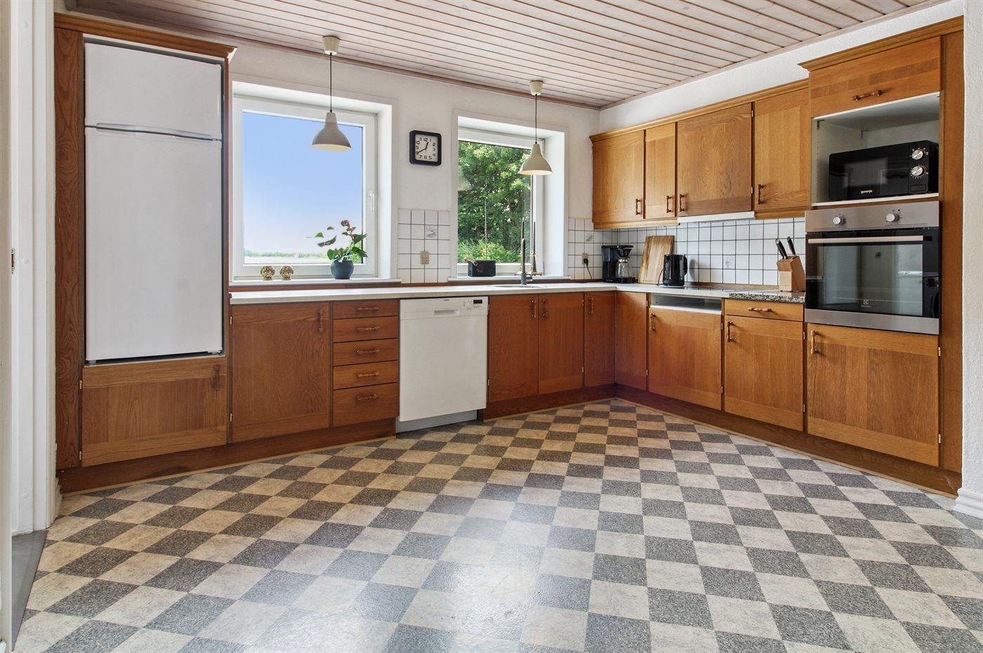 Køkkenet er udstyret med 1 køleskab. Der er 4 keramiske kogeplader, varmluftovn, mikrobølgeovn samt opvaskemaskine.