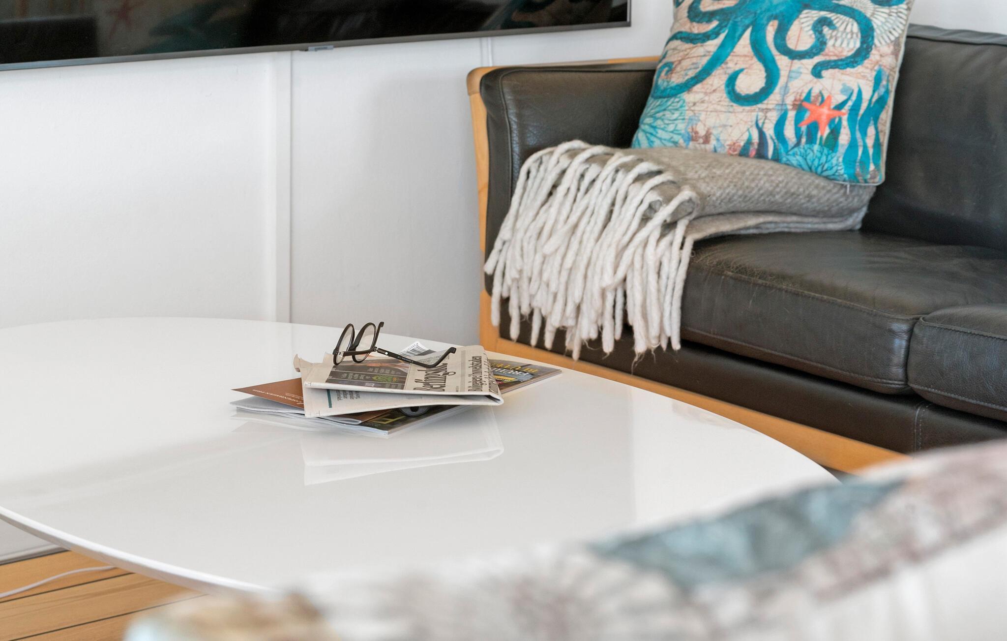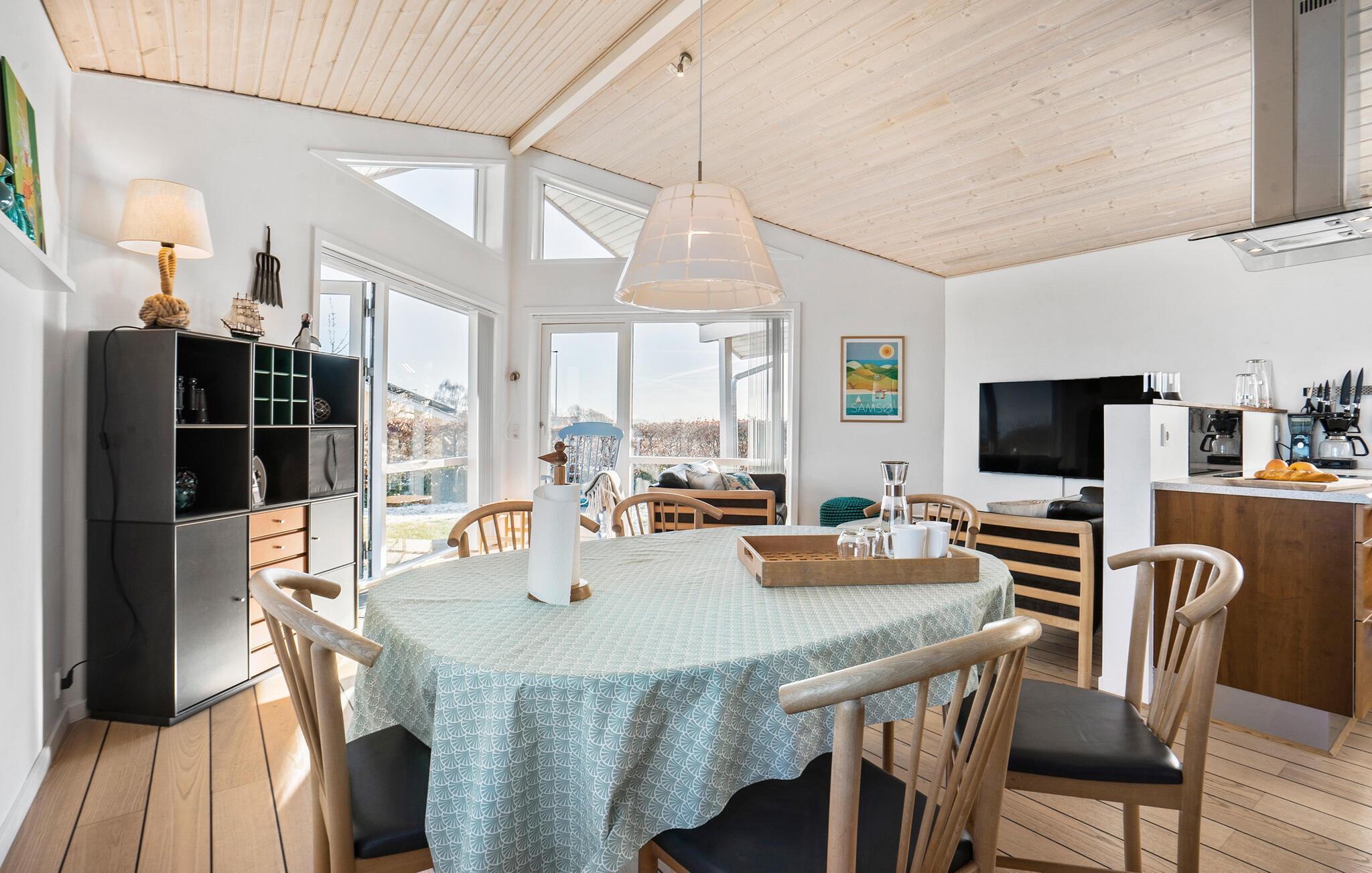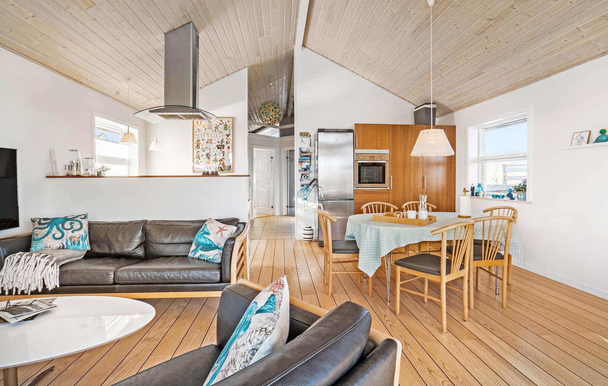 Lad turen gå til Samsø, hvor dette charmerende hus danner rammen om en fantastisk ferie tæt på vandet. Huset har et karakteristisk look, og indretningen fremtræder lyst og luftigt med en åben planløsning. I opholdsrummet mødes køkken og stue i ét lyst lokale med højt til loftet, hvor der kommer et dejligt lysindfald gennem gulv-til-loft-vinduerne. Her kan nogen kræse om livretterne i det veludstyrede køkken, mens andre hygger sig med puslespil eller en god bog. Efter en lækker aftensmad kan I alle finde jer godt til rette i sofaerne med brætspil eller købe snacks til en hyggelig filmaften.