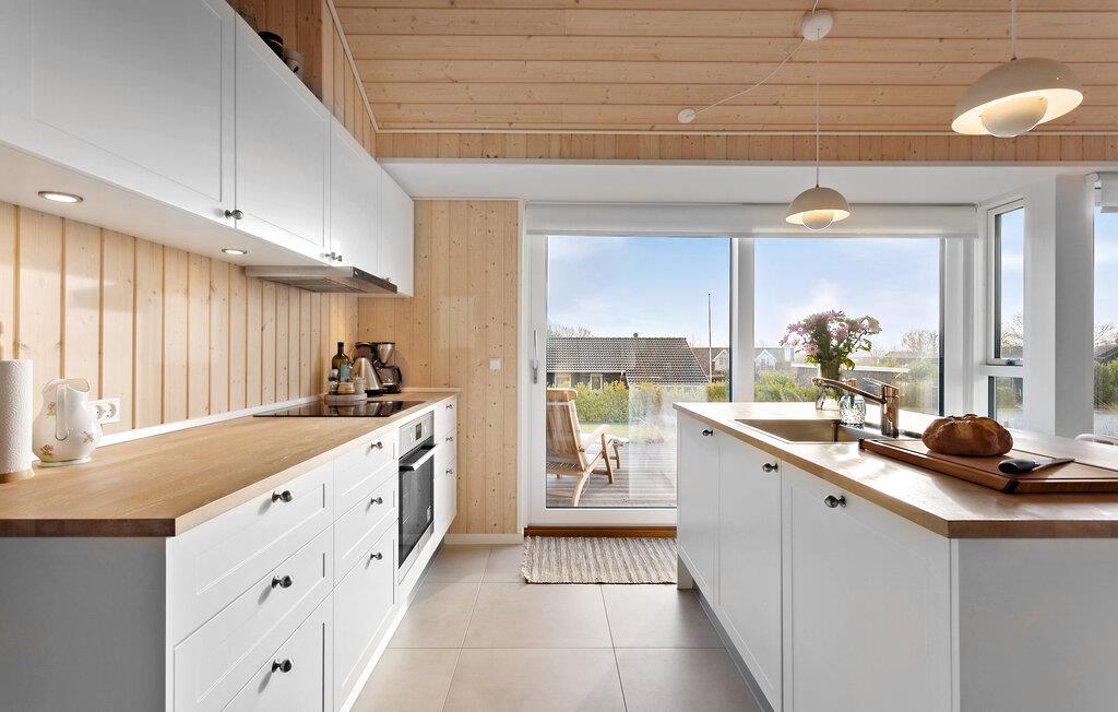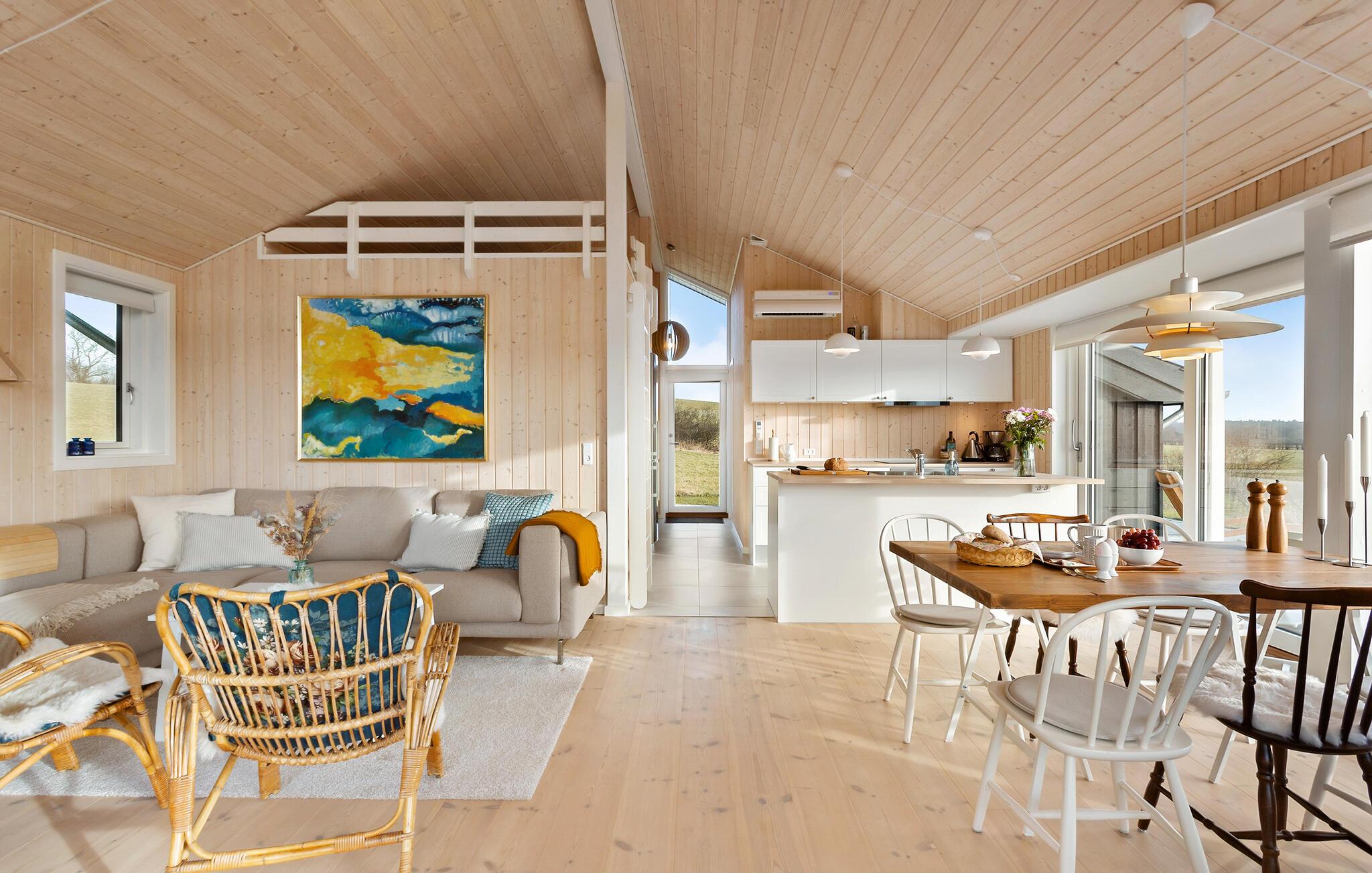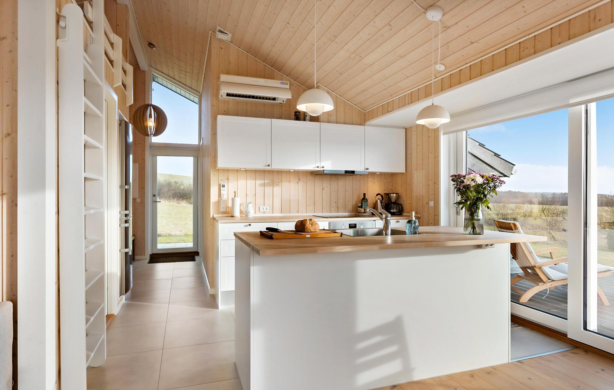 Det åbne opholdsrum kombinerer køkken og stue og bliver dejligt oplyst udefra gennem de store gulv-til-loft-vinduer, der samtidig giver en fantastisk udsigt til omgivelserne og ud mod bugten. Her kan I smække fødderne op i sofahjørnet med en god bog, og om aftenen kan I købe lidt snacks og gøre klar til en hyggelig filmaften.