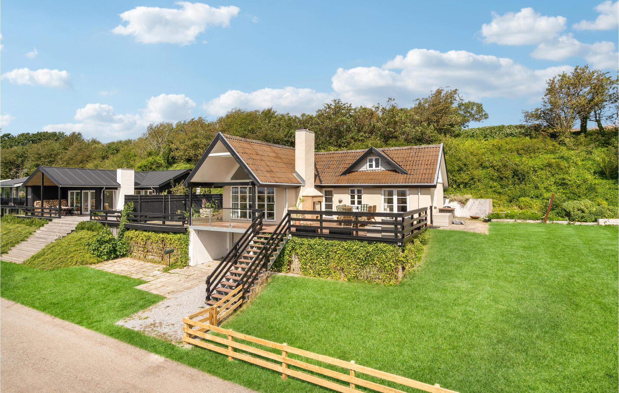 Smukt og klassisk feriehus ved Brydegård Strand med havudsigt, terrasse og rolig nordisk indretning.